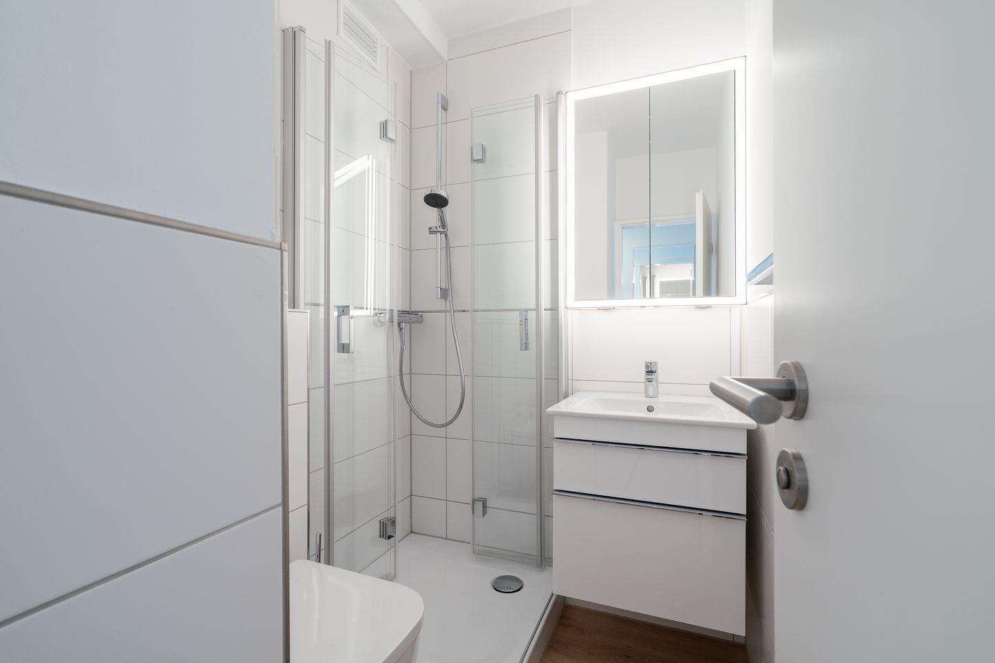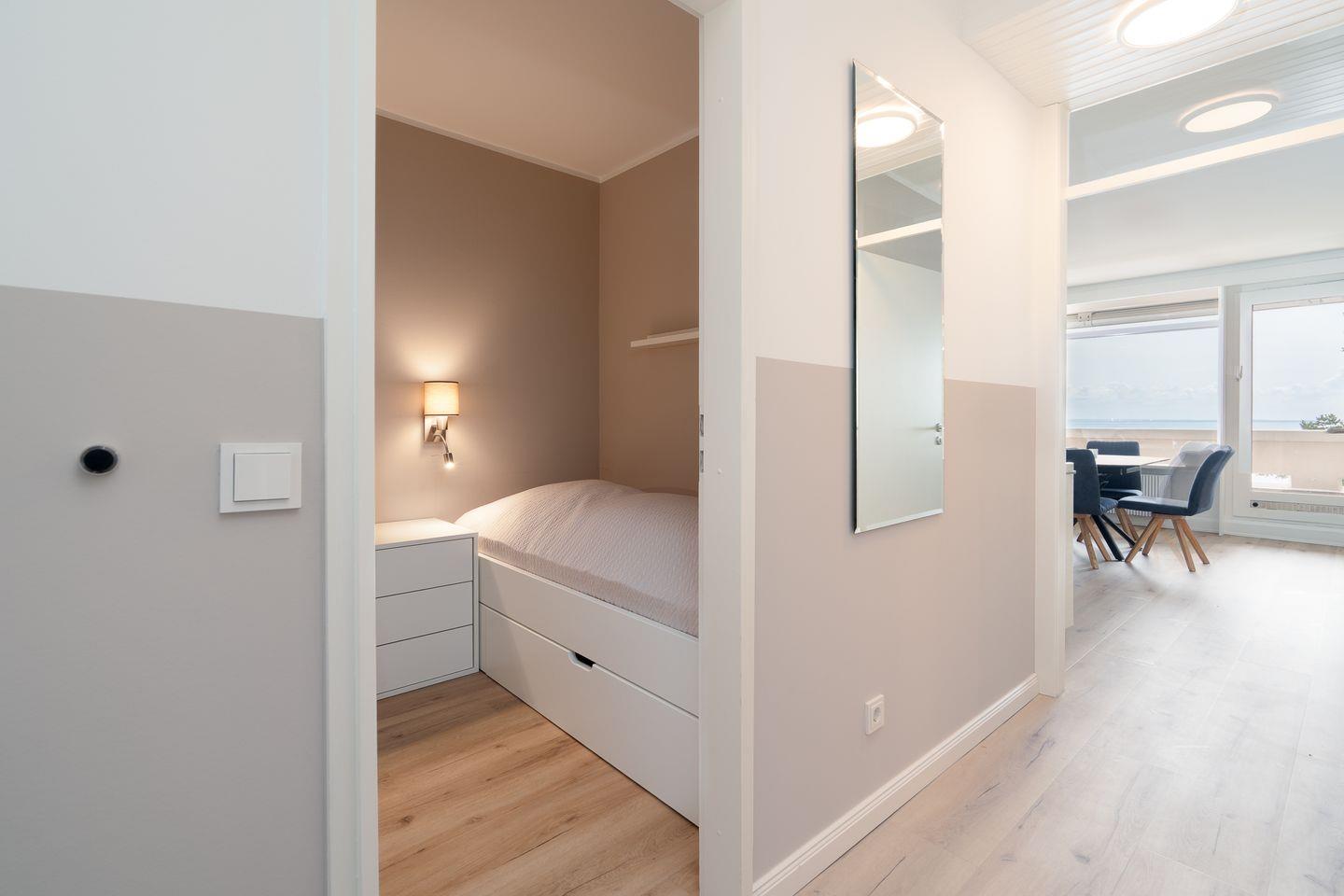 Das Apartment liegt im zweiten Stock einer gepflegten Ferienanlage und umfasst eine Wohnfläche von 50 m², aufgeteilt auf insgesamt drei Zimmer. Im ersten Schlafzimmer stehen zwei Einzelbetten (2x 90 cm x 190 cm), die nicht zusammengestellt werden können. Im zweiten Schlafraum steht ein Etagenbett (2x 90 cm x 180 cm). In den Schlafräumen befindet sich jeweils ein kleines Fenster zum Öffnen. Das neue Duschbad ist innenliegend.