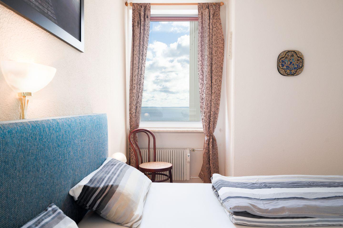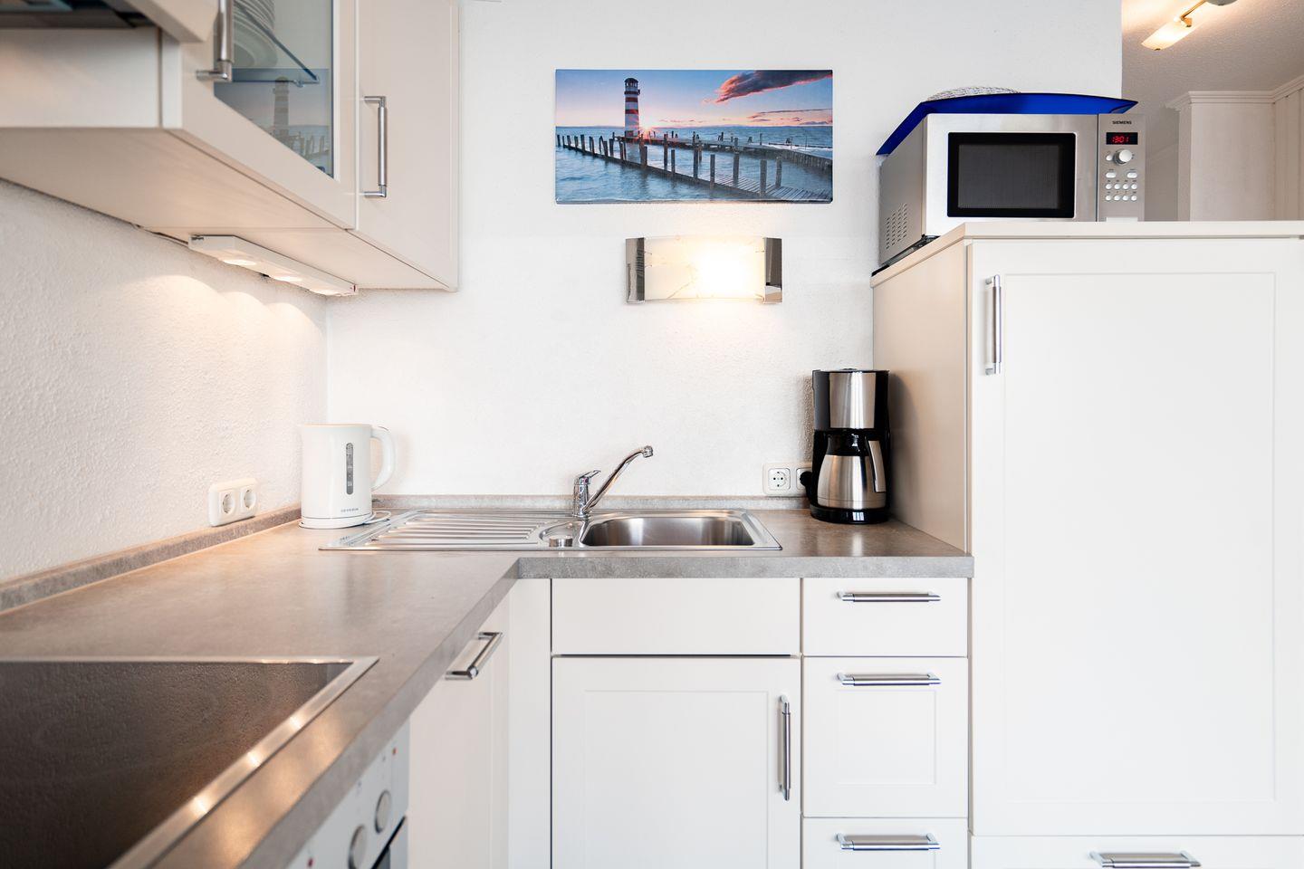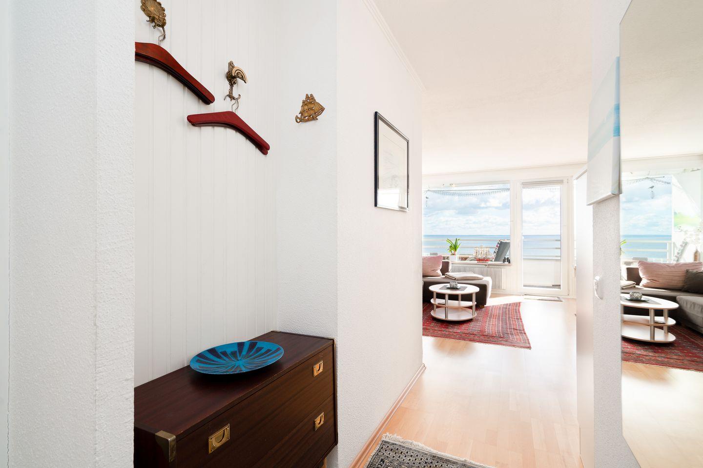 In dieser schönen und hellen 2-Raum-Wohnung ist der Name Programm! Von der 7. Etage haben Sie vom Balkon aus einen herrlichen Blick über die Ostsee und die Lübecker Bucht. Auch das Schlafzimmer mit bequemen Boxspringbett (2x 90 cm x 200 cm) hat Ostseeblick - aufwachen und das Meer sehen, so kann der Tag beginnen! Auf dem Sofa mit Schlaffunktion (150 cm x 220 cm) ist Platz für eine weitere Person, hier können Sie enstspannt mit Blick aufs Wasser den Tag begrüßen oder ausklingen lassen. Die moderne Küche ist mit Backofen, Herd und Spülmaschine ausgestattet und ist in den Wohn- und Essbereich integriert. Das in Weißtönen gehaltene Duschbad ist innenliegend. Zum Strand sind es nur wenige Fußschritte. PKW-Stellplatz für die Zeit Ihres Aufenthaltes inklusive.