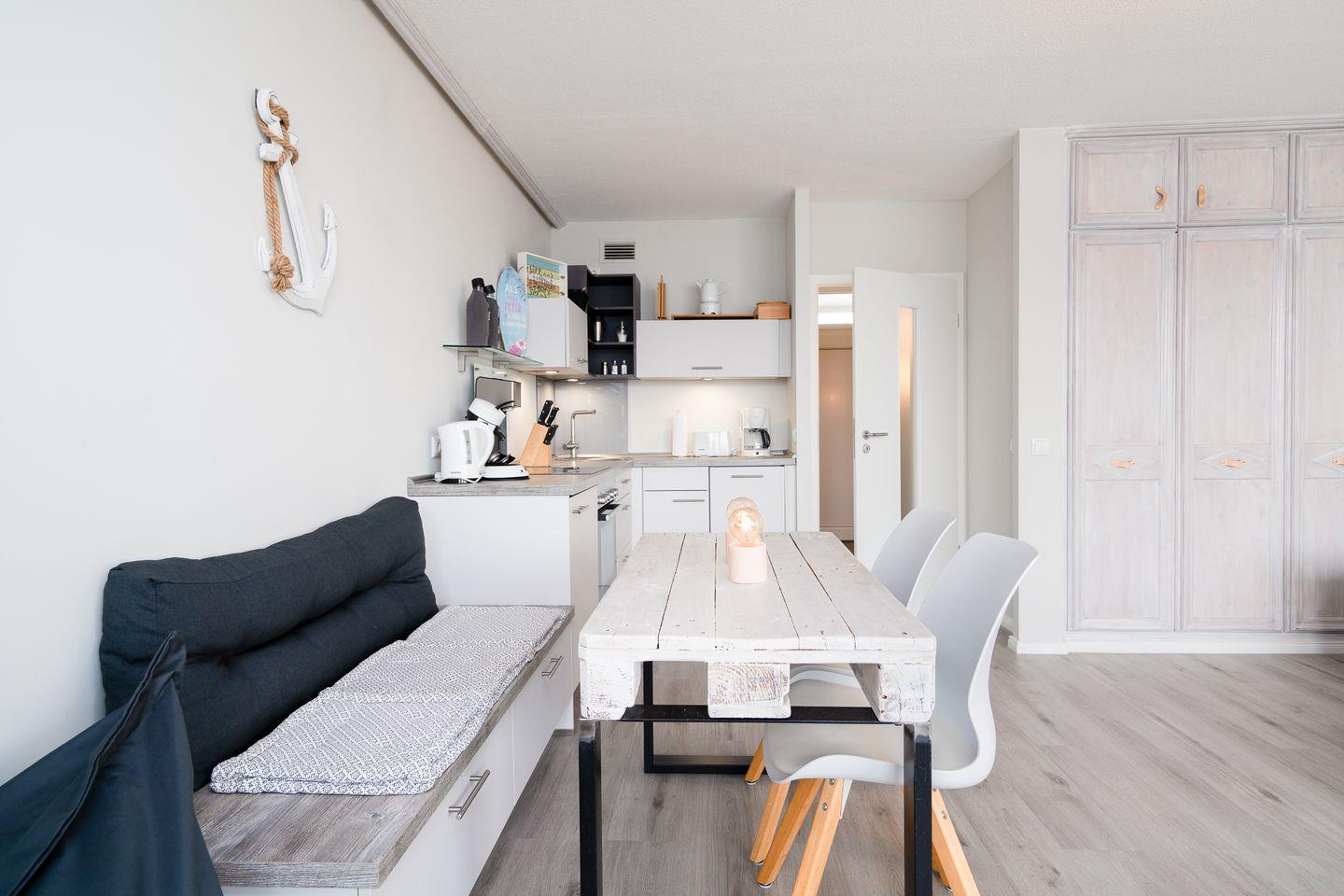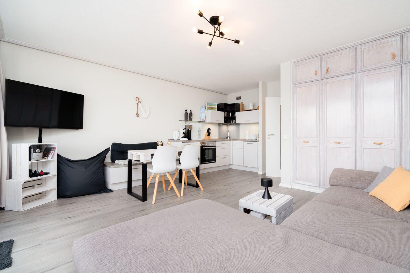 Die moderne 2-Zimmerwohnung liegt in der 5. Etage mit Balkon und ist für bis zu vier Personen geeignet. Vom kombinierten Wohn- und Essbereich mit offener Küche haben Sie Zugang zum Balkon mit herrlichen Blick über die Lübecker Bucht. Die Küche ist mit Spülmaschine, Backofen und Herd ausgestattet. Im Schlafzimmer stehen zwei Einzelbetten. Das Wohnzimmer verfügt über ein Schlafsofa. Das moderne Duschbad ist innenliegend. PKW-Stellplatz inklusive. Zum Strand sind es nur wenige Minuten zu Fuß.