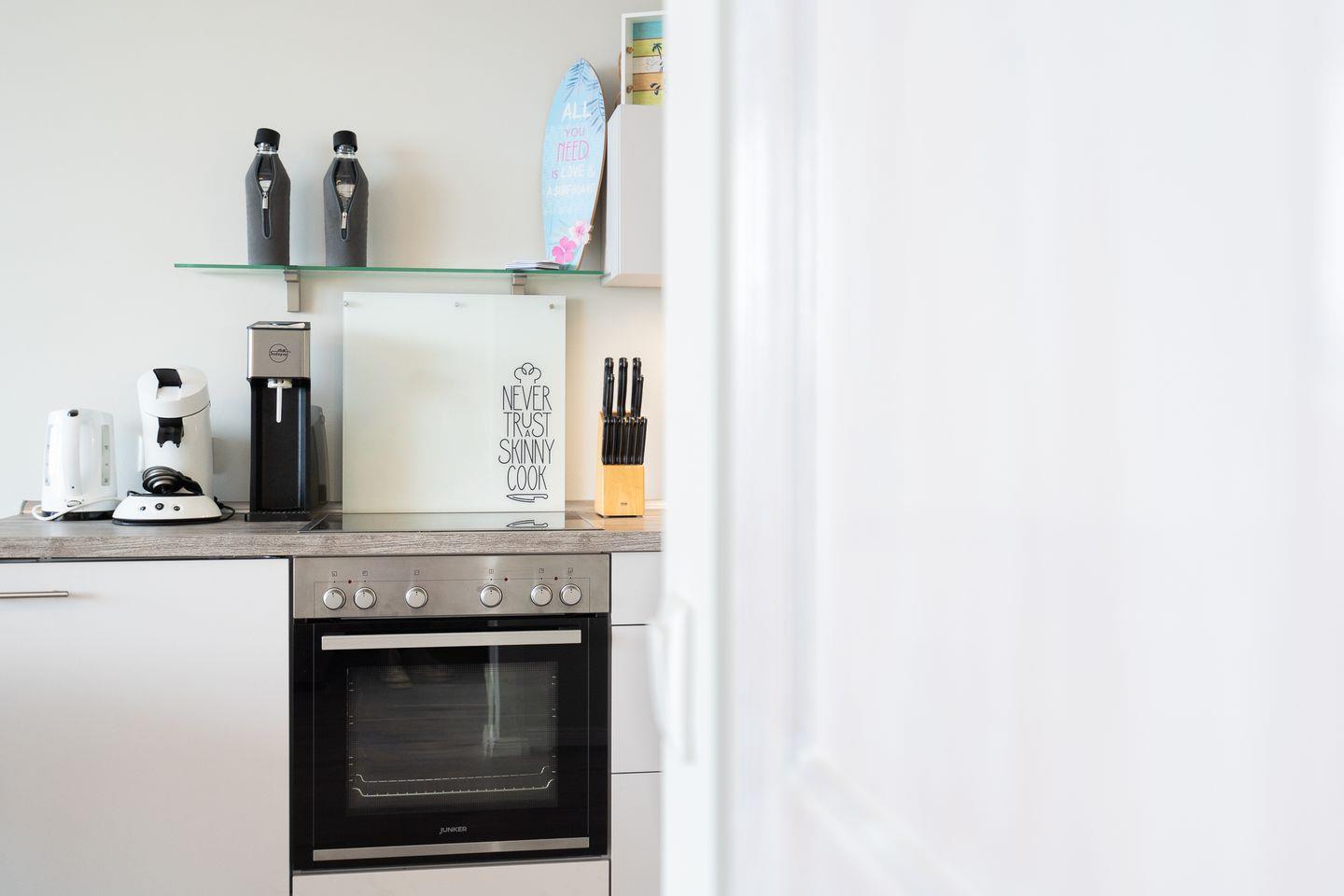 Die moderne und helle 2-Zimmerwohnung liegt in der 5. Etage mit Balkon und ist für bis zu vier Personen geeignet. Vom Balkon aus können Sie einen herrlichen Blick über die Lübecker Bucht genießen. Vom kombinierten Wohn- und Essbereich mit offener Küche haben Sie Zugang zum Balkon. Die Küche ist mit Spülmaschine, Backofen und Herd voll ausgestattet. Im Schlafzimmer mit Fenster stehen zwei Einzelbetten (jeweils 90 x 200 cm), die man nicht zusammenschieben kann. Das Wohnzimmer verfügt über ein Schlafsofa (140 cm x 220 cm). Das moderne Duschbad ist innenliegend. PKW-Stellplatz inklusive. Vom PKW-Stellplatz führt ein Seiteneingang zum Fahrstuhl zum ebenerdigen Be-und Entladen. Ohne eine Straße zu überqueren sind es zum Strand nur wenige Minuten zu Fuß.