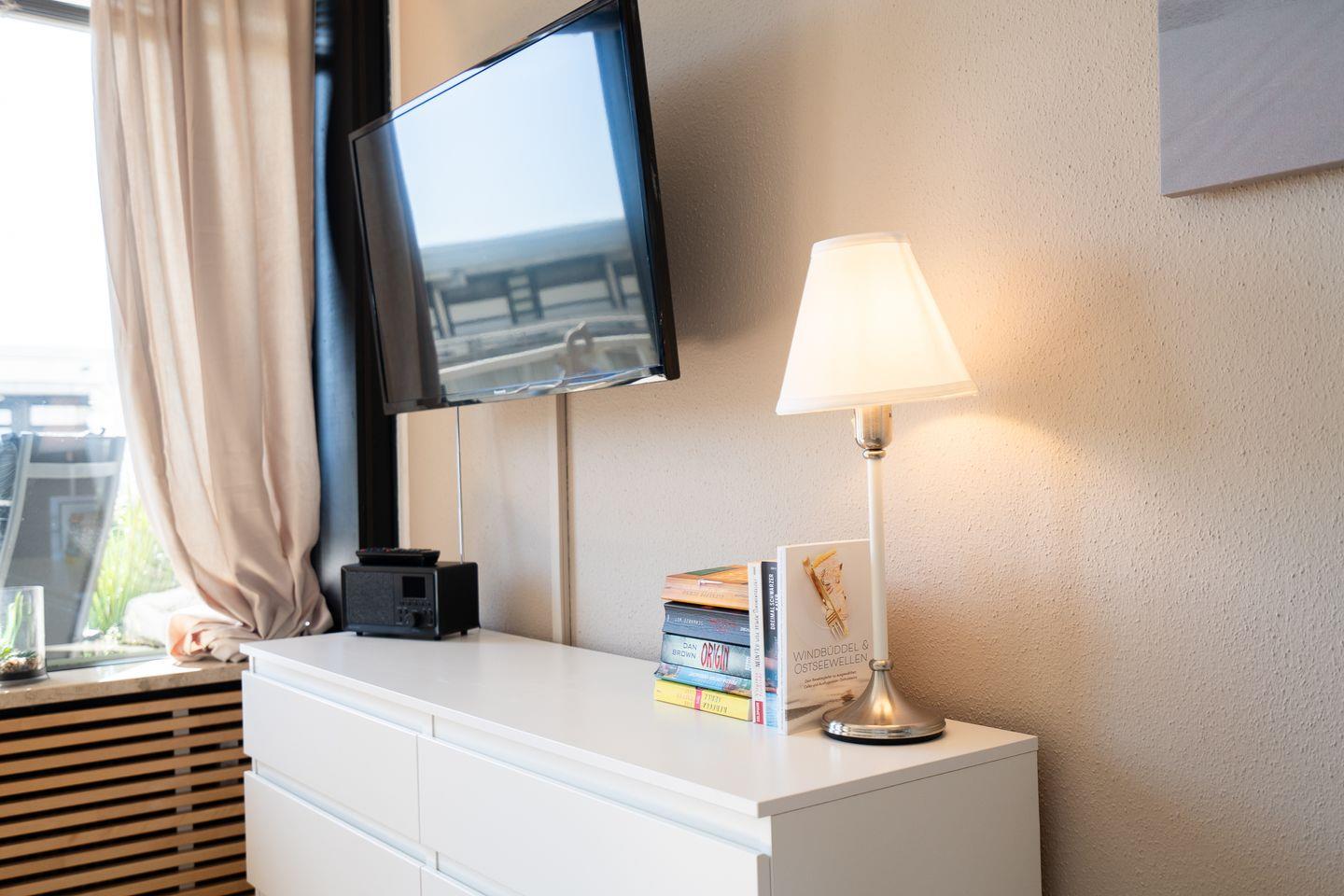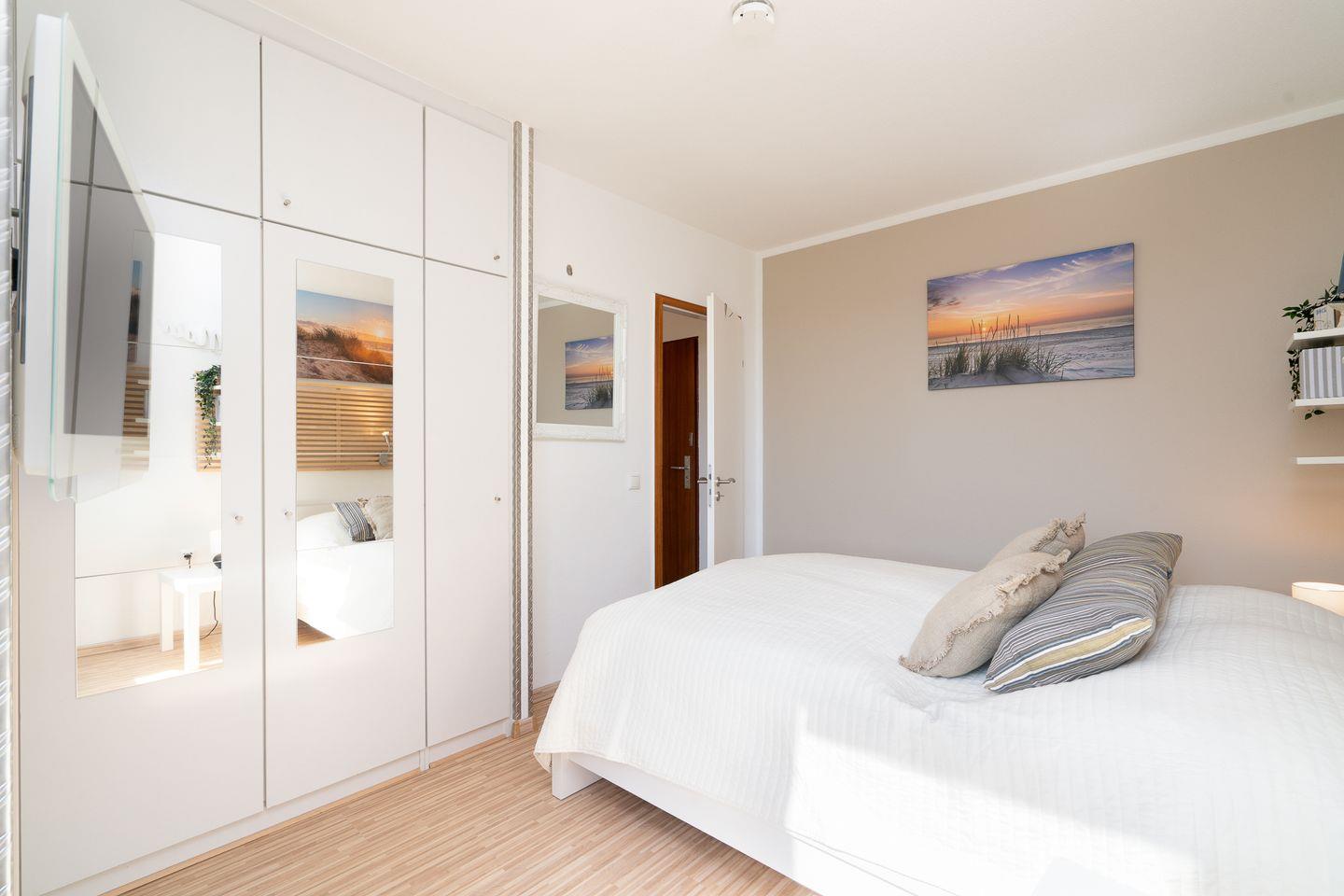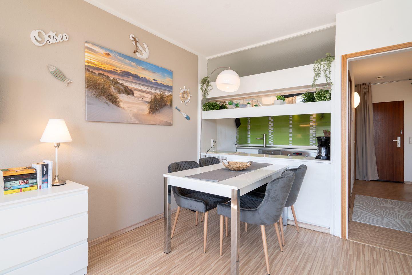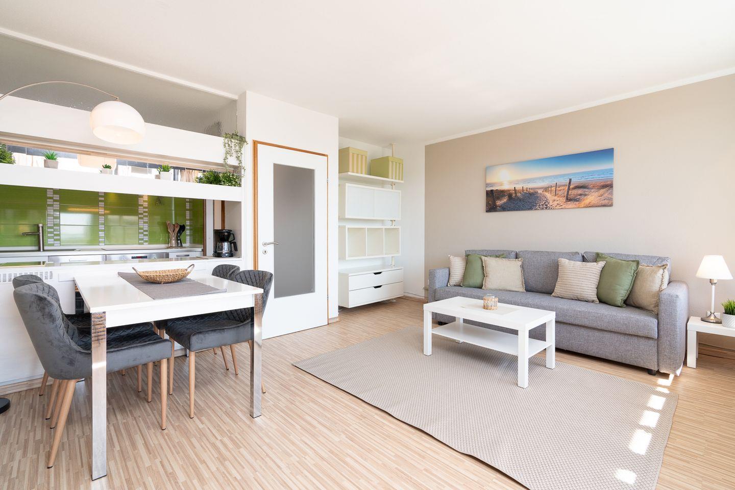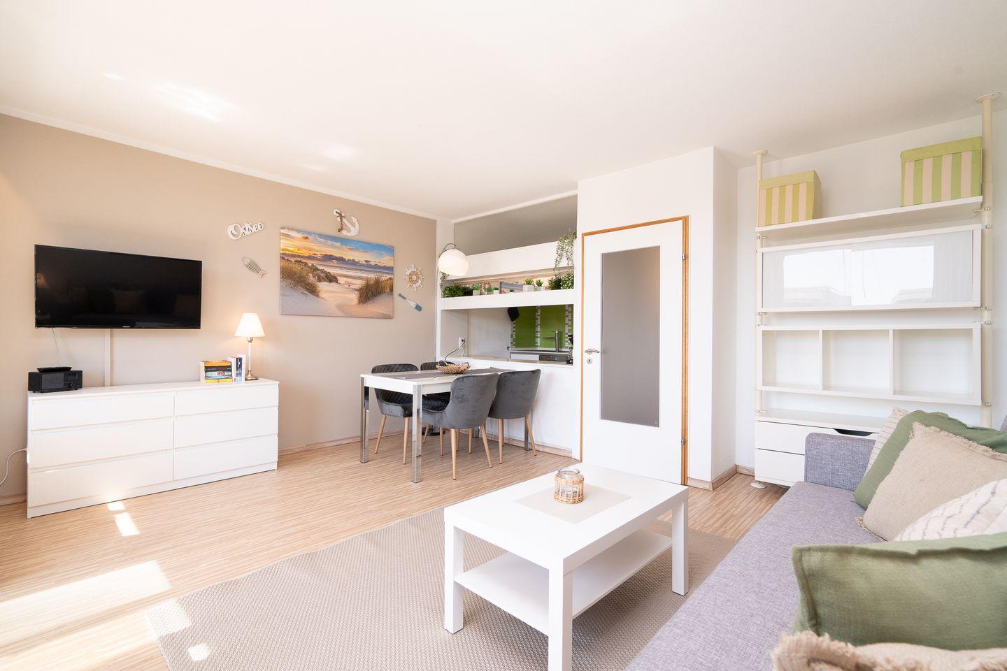Die Unterkunft ist modern und geschmackvoll ausgestattet. Ein französisches Doppelbett (140 cm x 200 cm) im Schlafzimmer mit Fenster und zusätzlichem Fernseher bietet erholsamen Schlaf, während das geräumige Wohnzimmer mit einem Schlafsofa (160 cm x 200 cm) zum Entspannen einlädt. Der Fernseher mit einer Bildschirmgröße von 35 bis 44 Zoll, Radio und WLAN sorgen für gute Unterhaltung. Die offene Küche ist mit allen erforderlichen Geräten und Utensilien ausgestattet, darunter Cerankochfeld, Backofen, Kühlschrank mit Gefrierfach, Spülmaschine, Wasserkocher, Toaster und Kaffeemaschine. Der Essbereich ist direkt angrenzend eingerichtet und ermöglicht Mahlzeiten in gemütlicher Atmosphäre. Das Badezimmer verfügt über eine Badewanne und ist innenliegend. Zur weiteren Ausstattung zählt ein Balkon, auf dem Sie die frische Meeresluft genießen können. Balkonmöbel und Sonnenschutz sind vorhanden. Ein PKW-Stellplatz ist inklusive. Zum Strand sind es nur wenige Schritte.