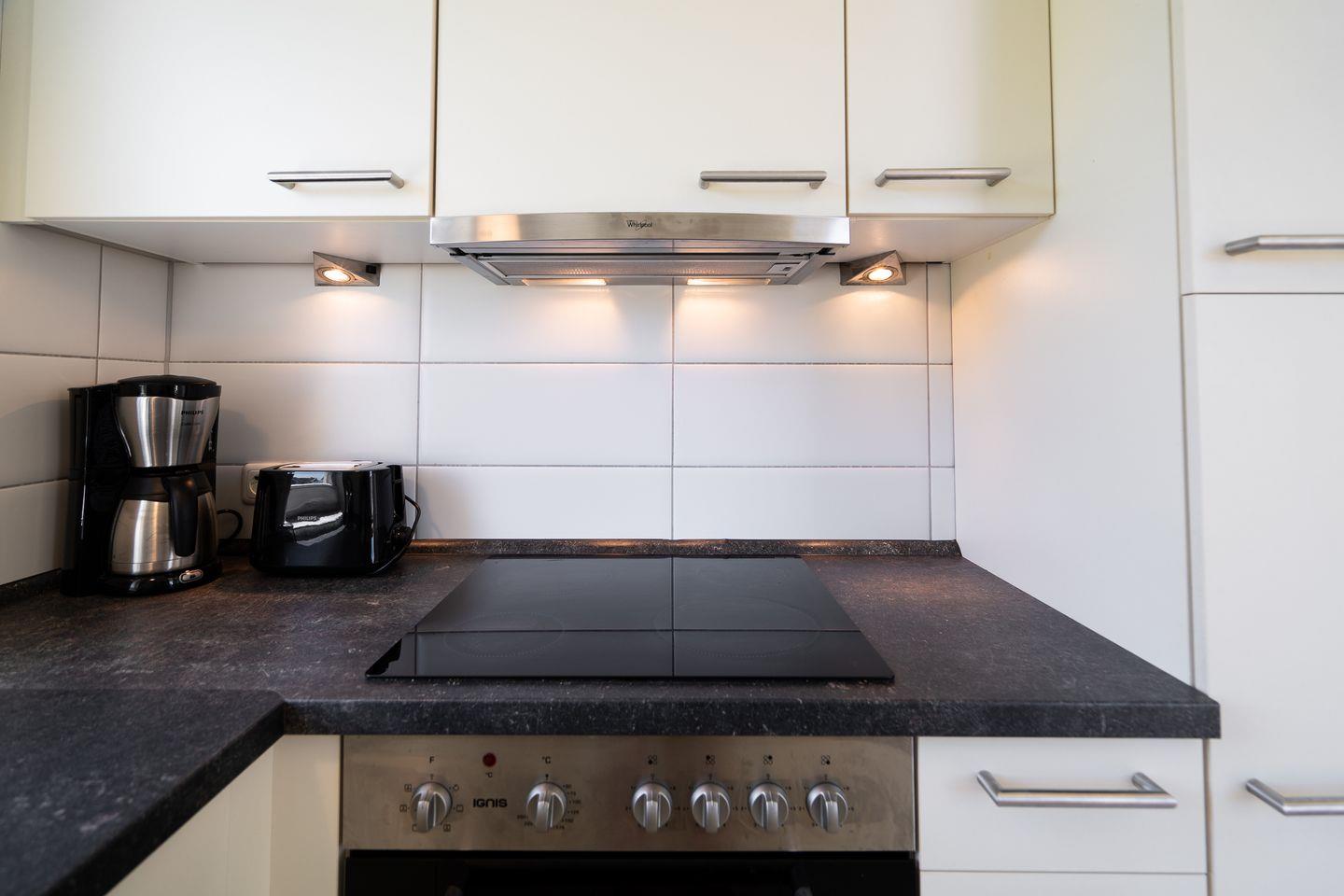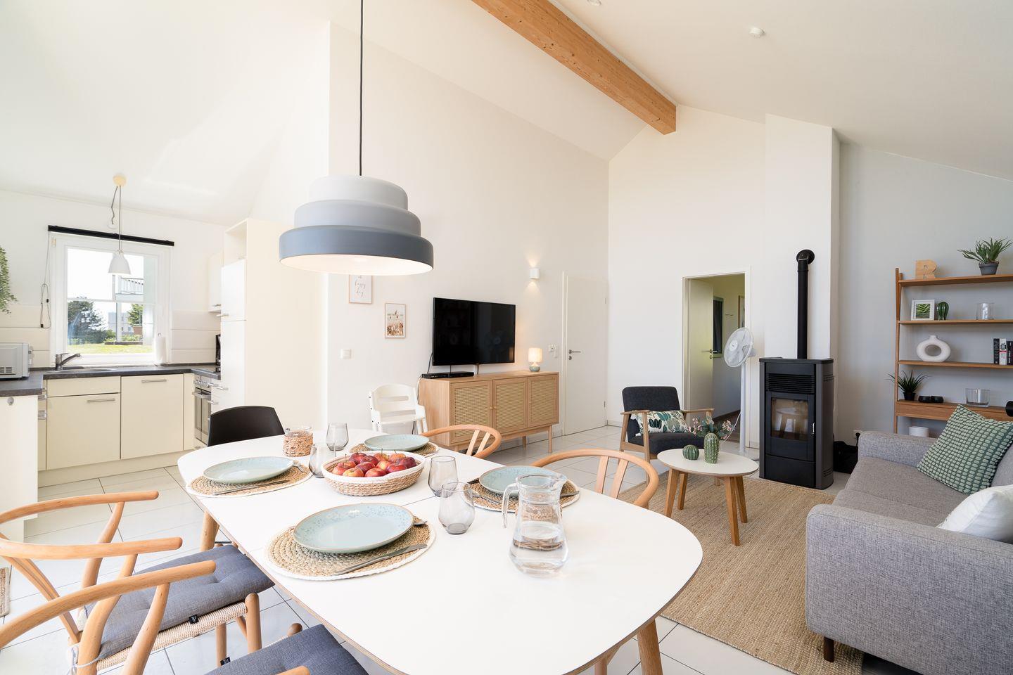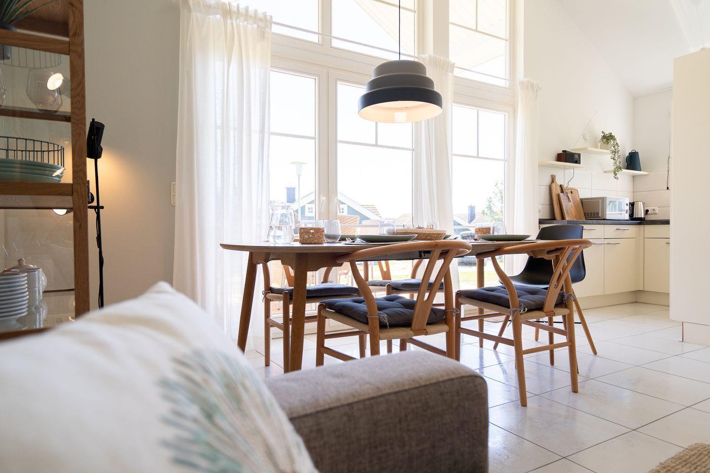 Der offene Wohnraum schafft mit gemütlicher Sofaecke und einem Ofen eine behagliche Atmosphäre, in der auch an kühleren Abenden Wohlbefinden garantiert ist. Die offene Küche ist voll ausgestattet: Sie verfügt über einen Ceranherd, Backofen, Kühlschrank mit Gefrierfach, Spülmaschine, Mikrowelle, Kaffeemaschine, Toaster, Wasserkocher, umfangreiche Küchenutensilien und Geschirr. Ein Essbereich mit großem Esstisch lädt zu gemeinsamen Mahlzeiten ein.