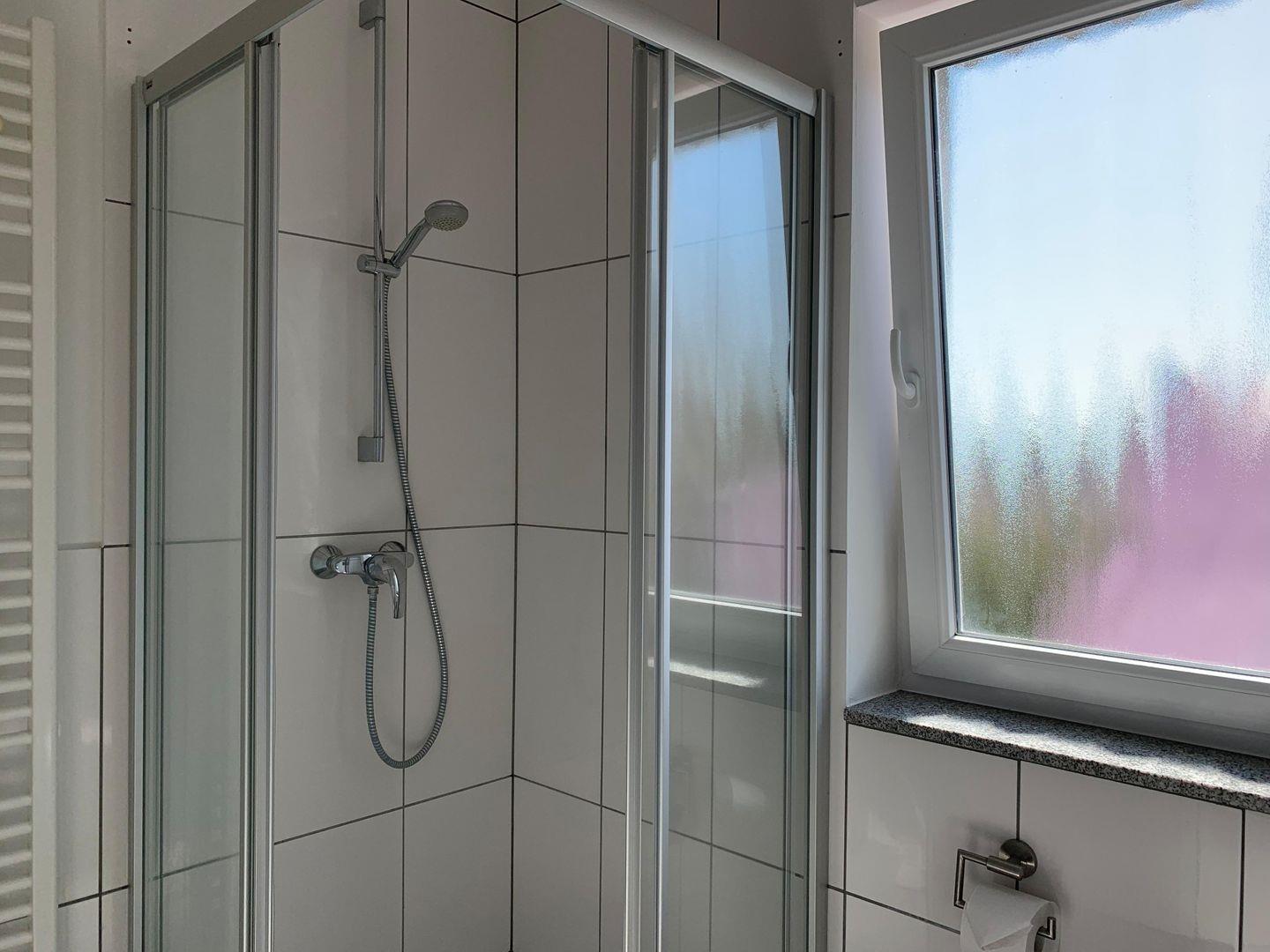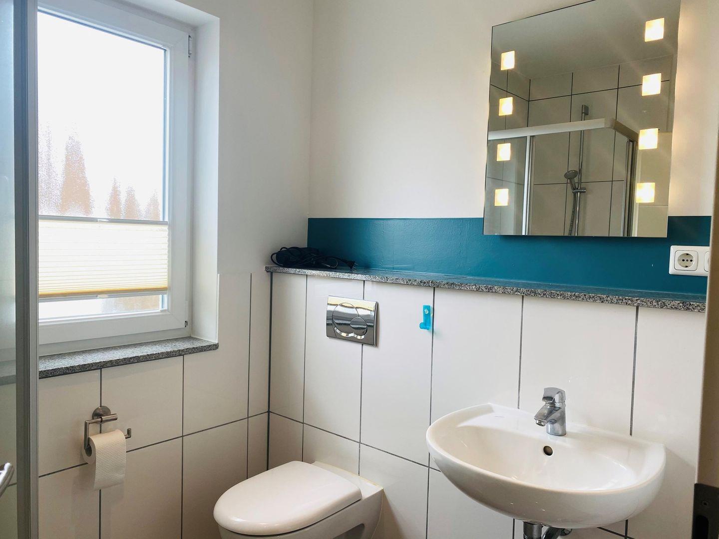 Im schönen, hellen Badezimmer finden Sie neben WC und Waschbecken eine Duschkabine mit Glasabtrennung, einen Spiegelschrank und einen Föhn vor. Das Duschbad verfügt über ein Fenster.