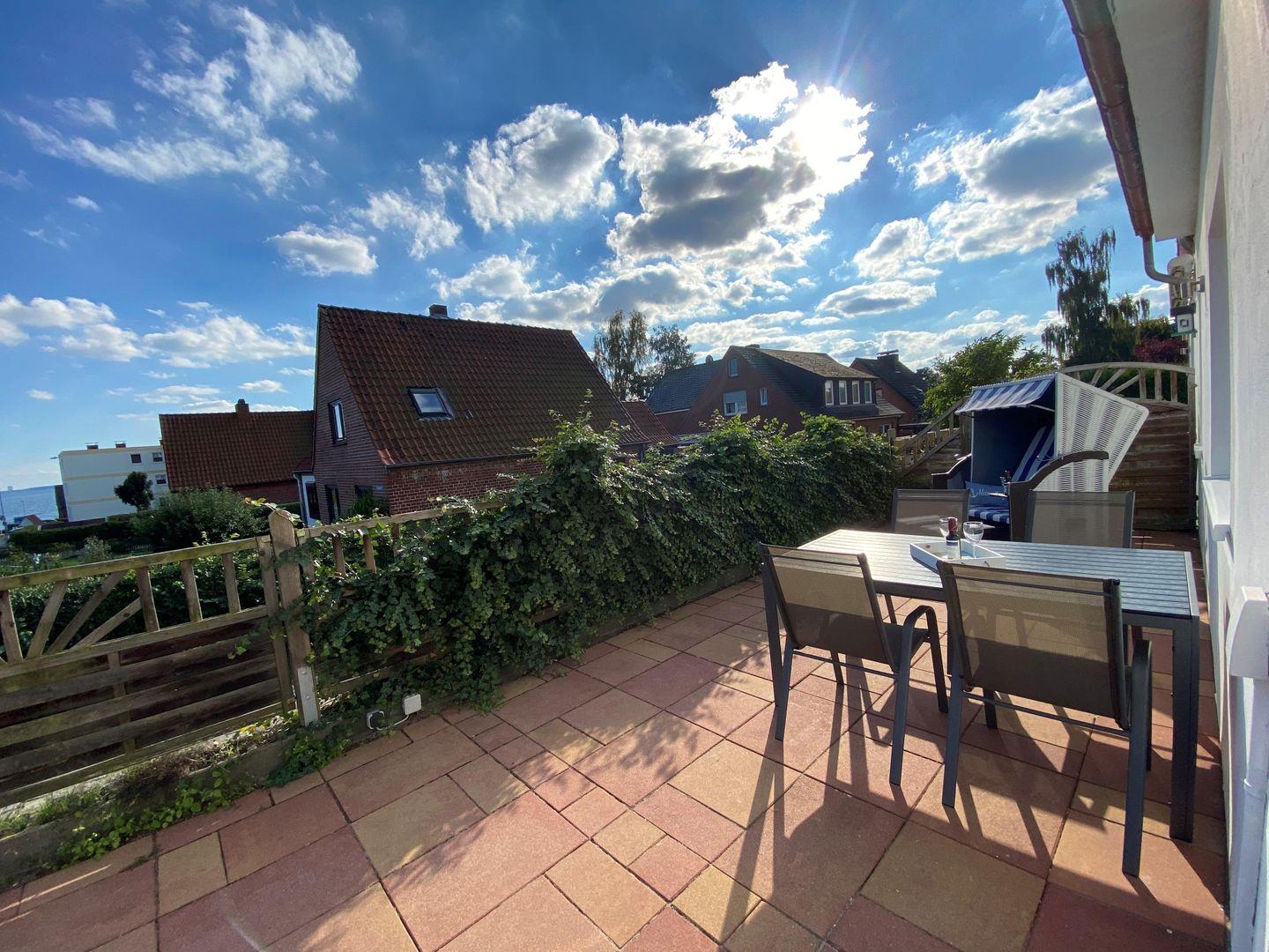 Genießen Sie auf der großen, möblierten Süd-Terrasse die meiste Zeit des Tages die Sonne. Hier steht auch ein neuer Strandkorb für Sie bereit.