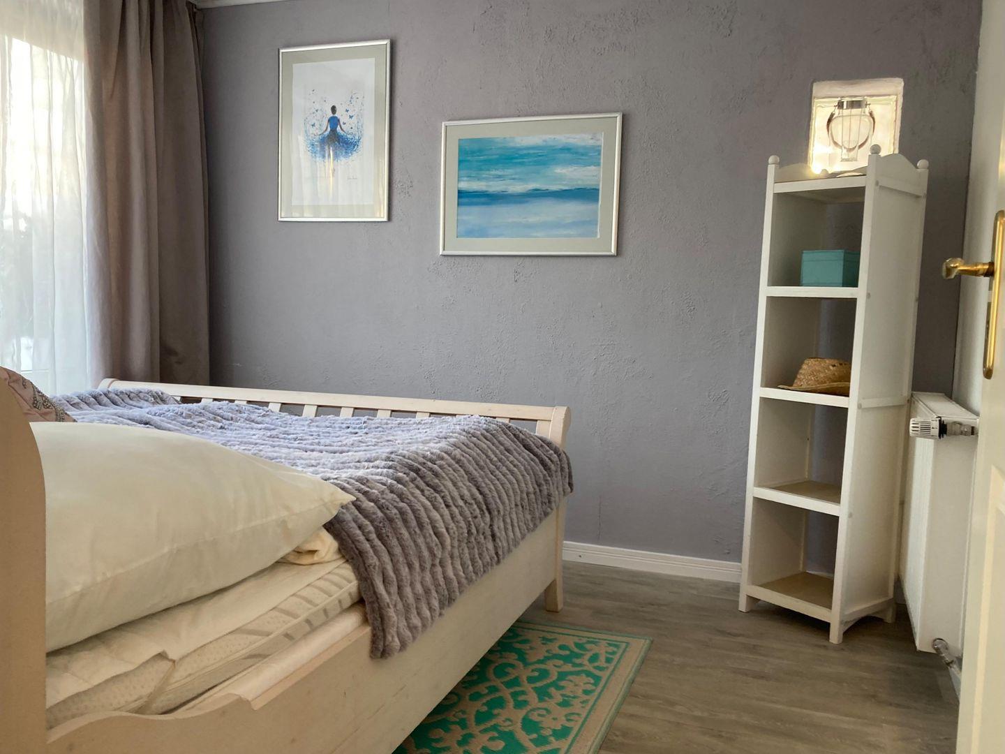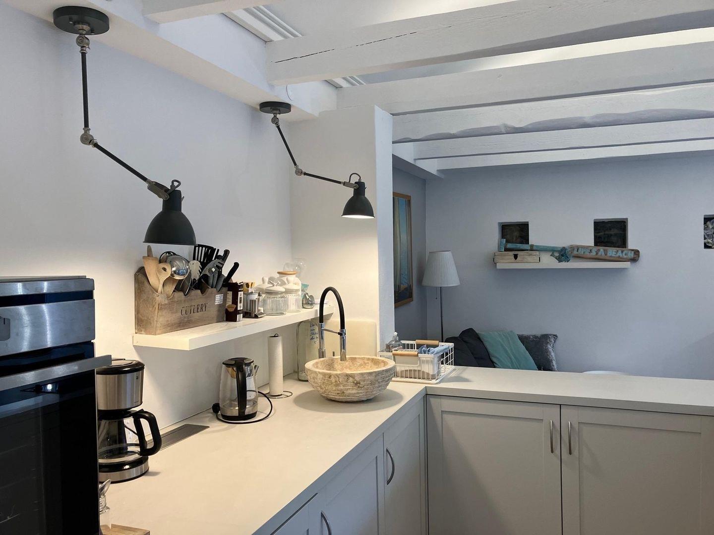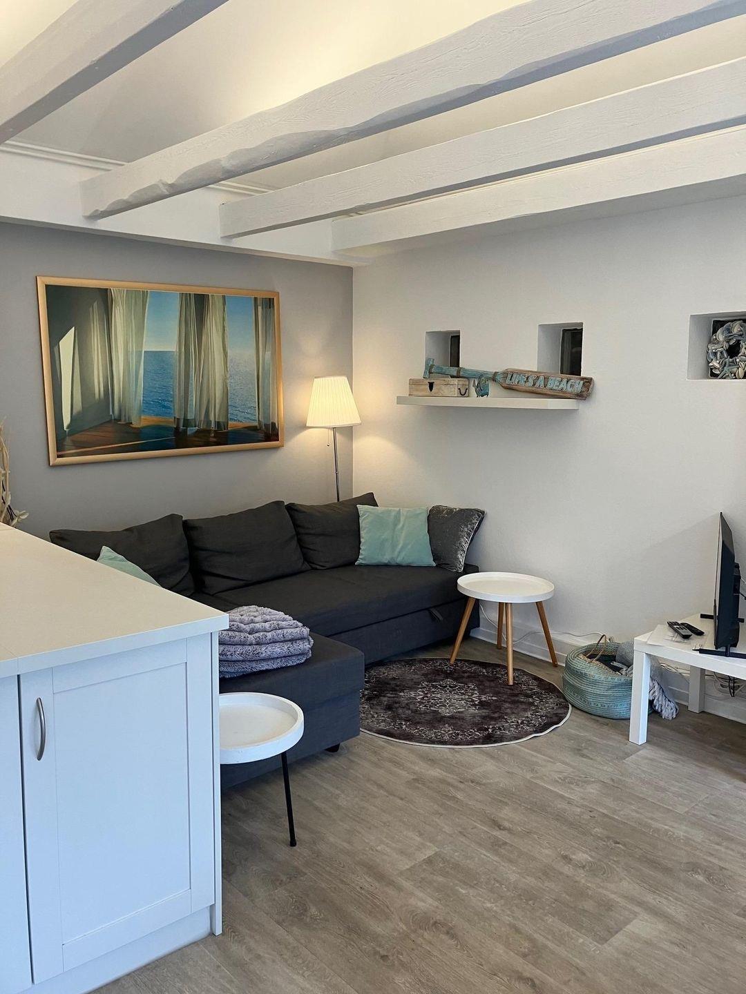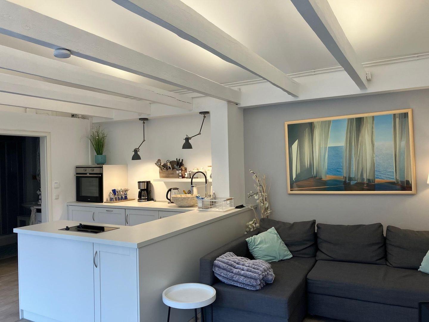 Das kleine Häuschen am Meer verfügt über ein neues Schlafzimmer (neue Matratze mit Topper) und eine neue offene Küchenzeile (Ende 2022) übergehend in den Ess- und Wohnbereich. Die kleine Küchenzeile verfügt über einen Geschirrspüler, Kühlschrank mit Gefrierfach und einen Backofen.
