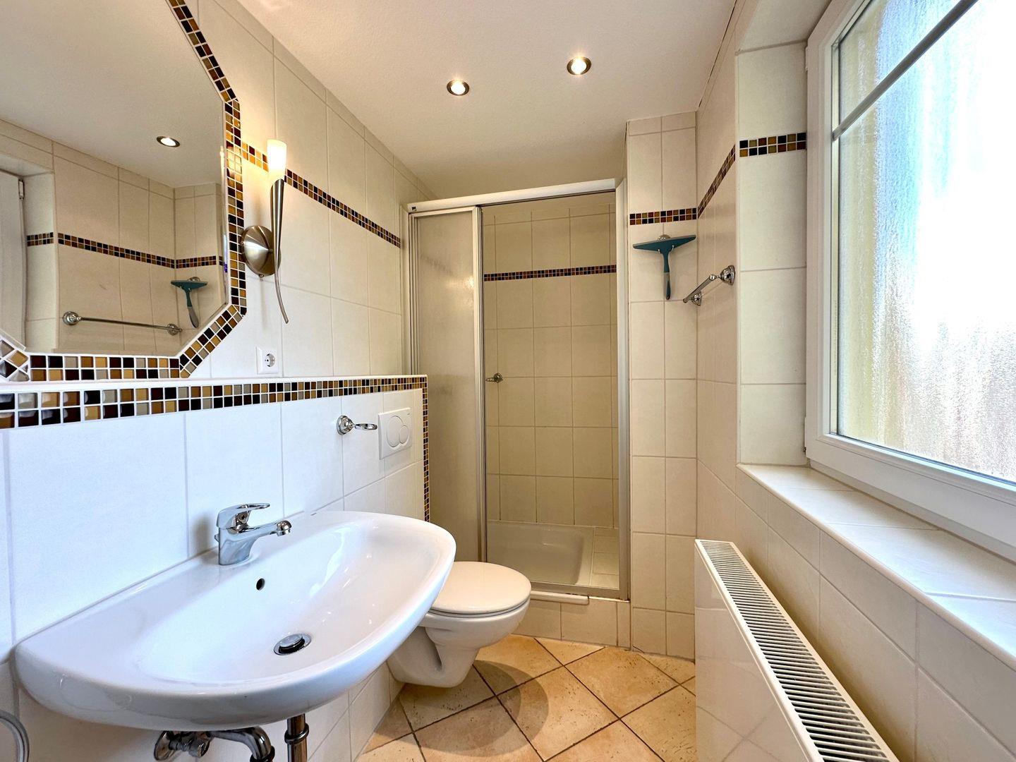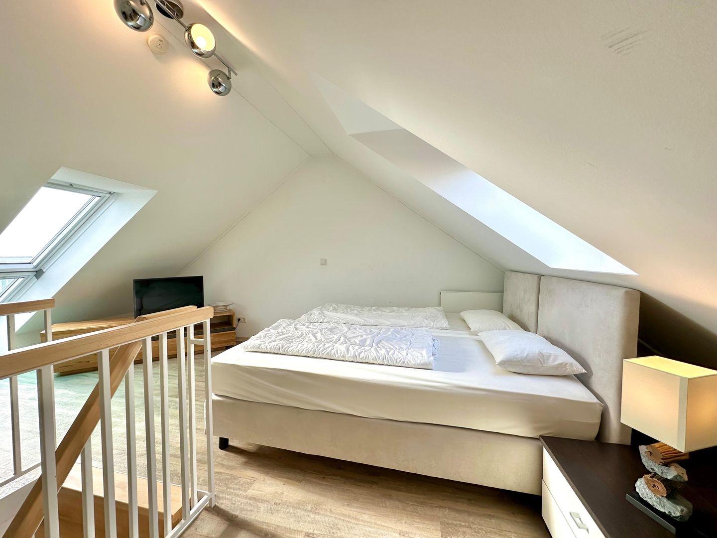 Eine kleine Dachterrasse mit einem tollem Meerblick erreichen Sie über das obere offene Schlafzimmer, welches Sie über eine Treppe erreichen. Der zweite größere Balkon hat einen seitlichen Meerblick. Modernes Duschbad mit Fenster.