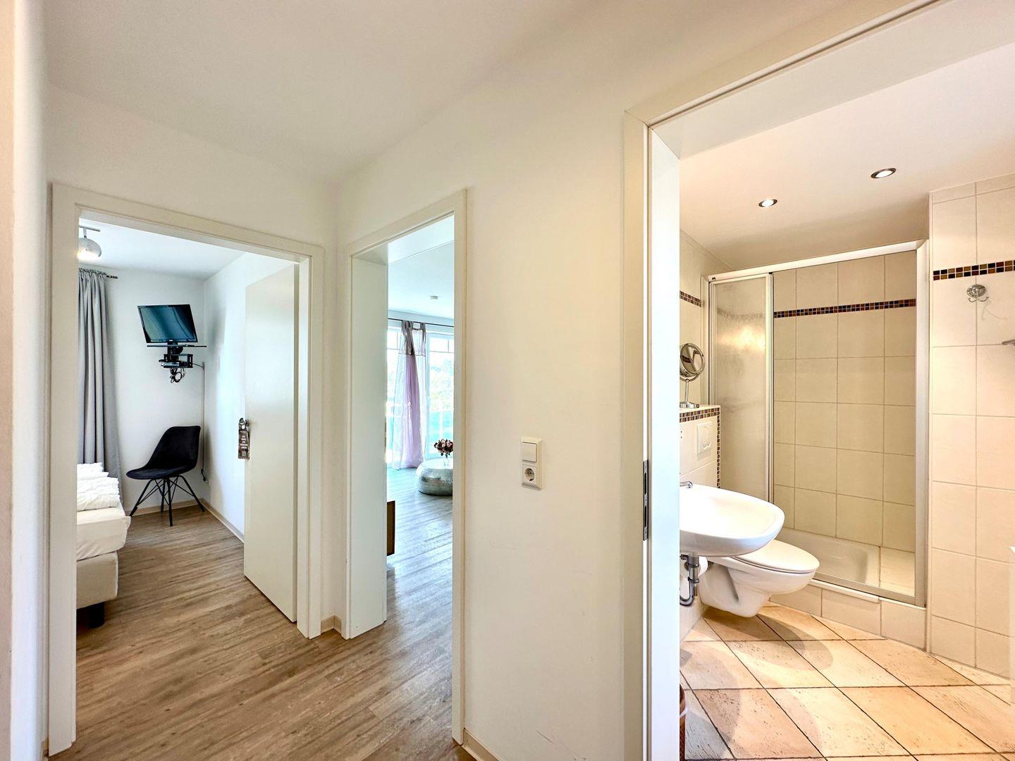Das modern eingerichtete Wohnzimmer verfügt über einen Flachbildfernseher und eine Stereoanlage. Von dem angrenzenden, möblierten, seitlichen Balkon haben Sie einen schönen Blick auf die Ostsee.