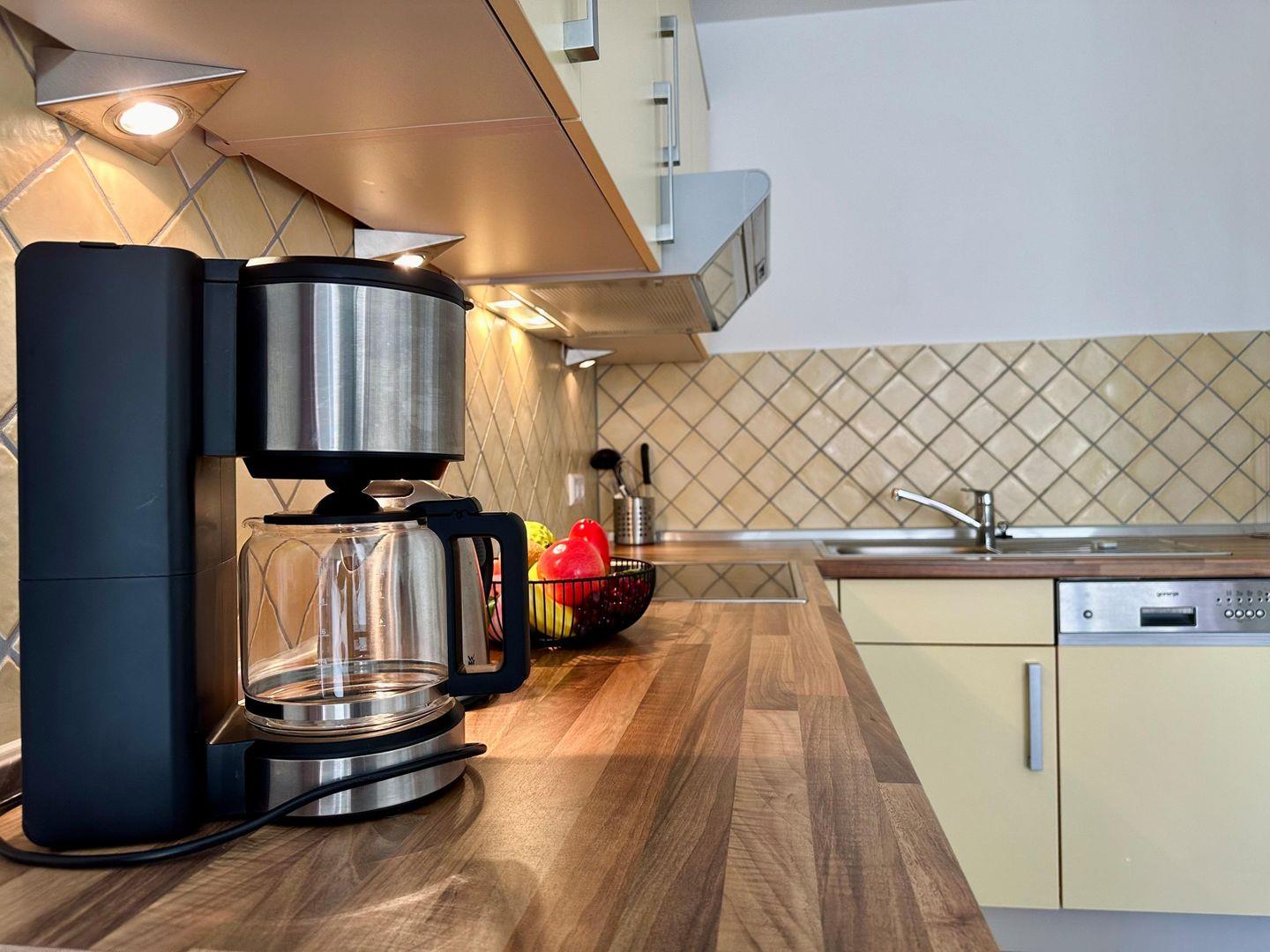 Der Wohn-/Essbereich beinhaltet eine neue und modern ausgestattete Küche (Geschirrspülmaschine, Backofen, Kühlschrank mit Gefrierfach).