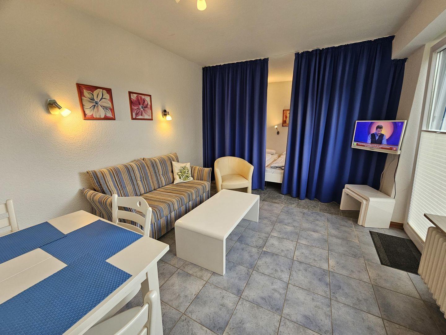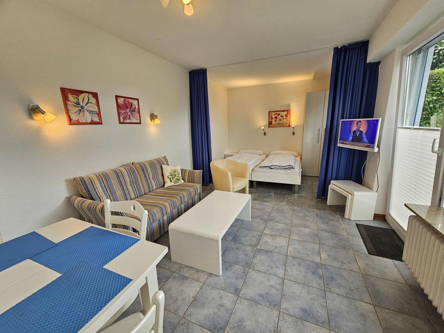 Einfach eingerichtetes 1-Zimmer-Appartement für 2 Personen nur ca. 100 Meter vom Strand mit Teilmeerblick.