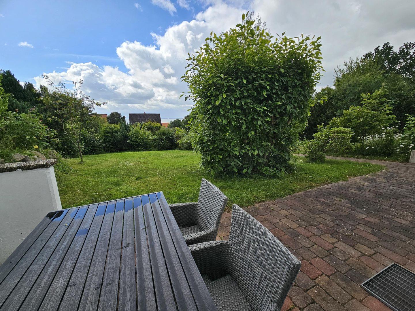 Auf der großen, möblierten Terrasse können Sie die Sonne genießen. Der große Garten steht Ihnen ebenfalls zur Verfügung.