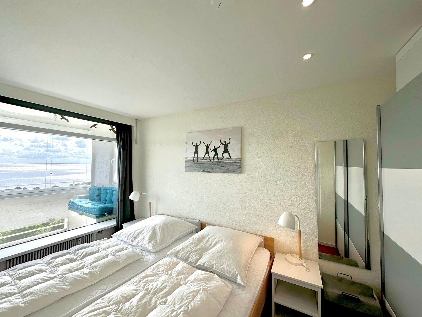 Das Schlafzimmer hat für jeden Bettseite einen eigenen Eingang. Auch aus diesem Zimmer können Sie den traumhaften Meerblick genießen. Ein großer Kleiderschrank steht für Sie bereit. Der Schlafbereich verfügt über ein Verdunklungsrollo.