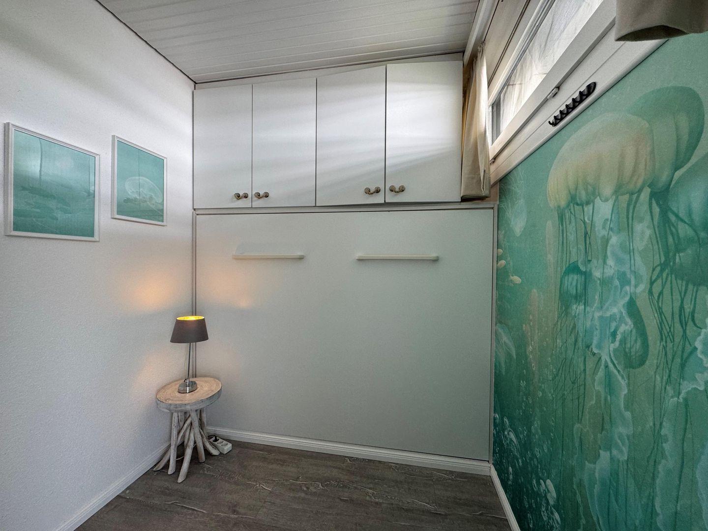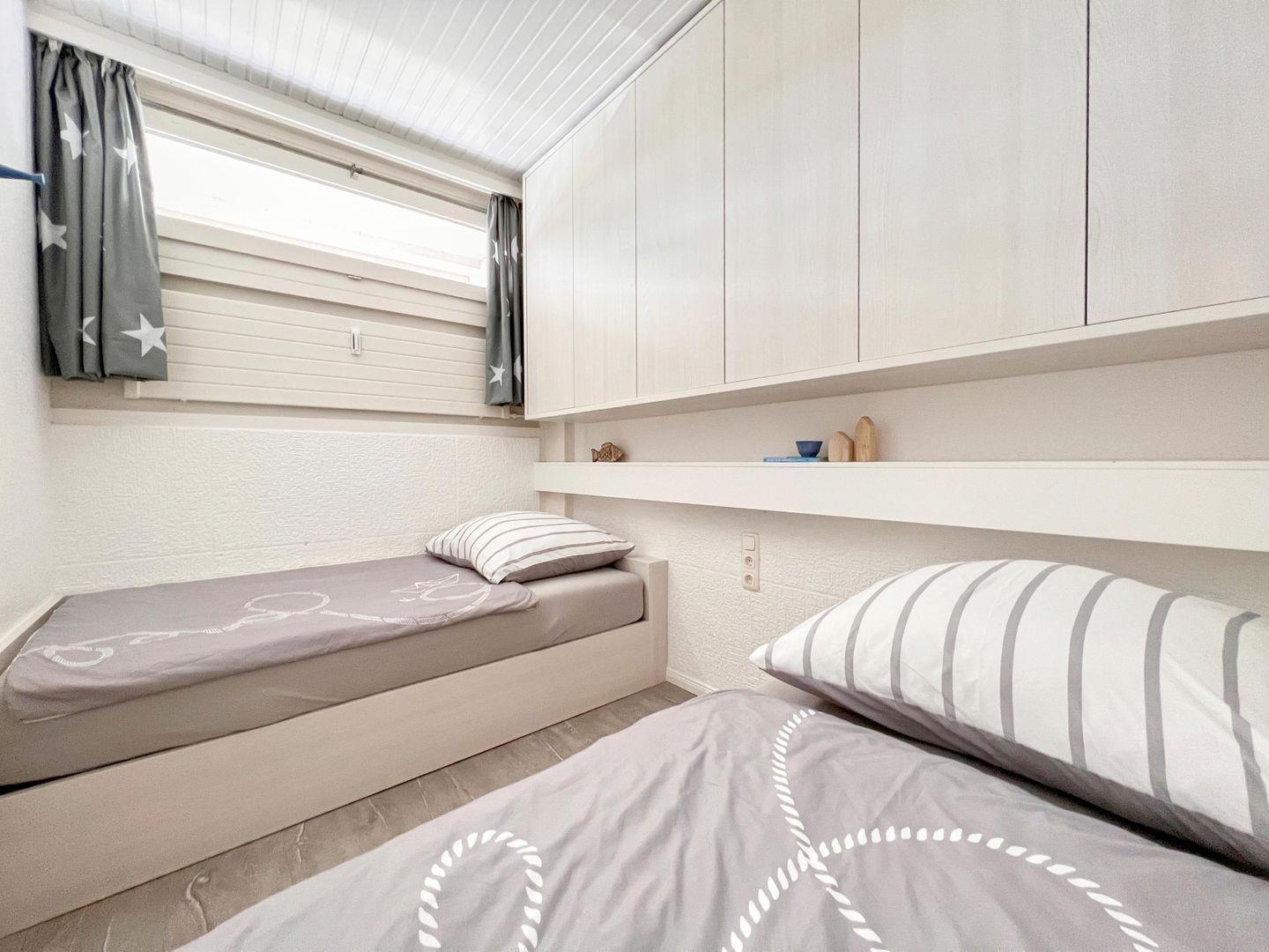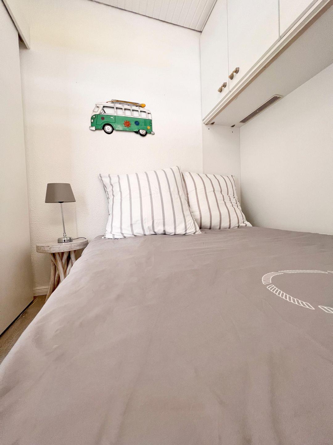 Treten Sie in den hellen Flur ein. Dieser hat eine platzsparende kleine Wandgarderobe. Vom Flur aus gehen die zwei Schlafzimmer rechts und links ab - ein Schlafzimmer hat zwei Einzelbetten (je 1,90m x 0,90m), der andere Schlafraum verfügt über ein Schrankbett (140 x 200cm). Beide Schlafzimmer haben Einbauschränke mit viel Stauraum für Ihre Sachen.
