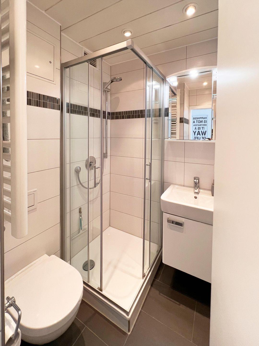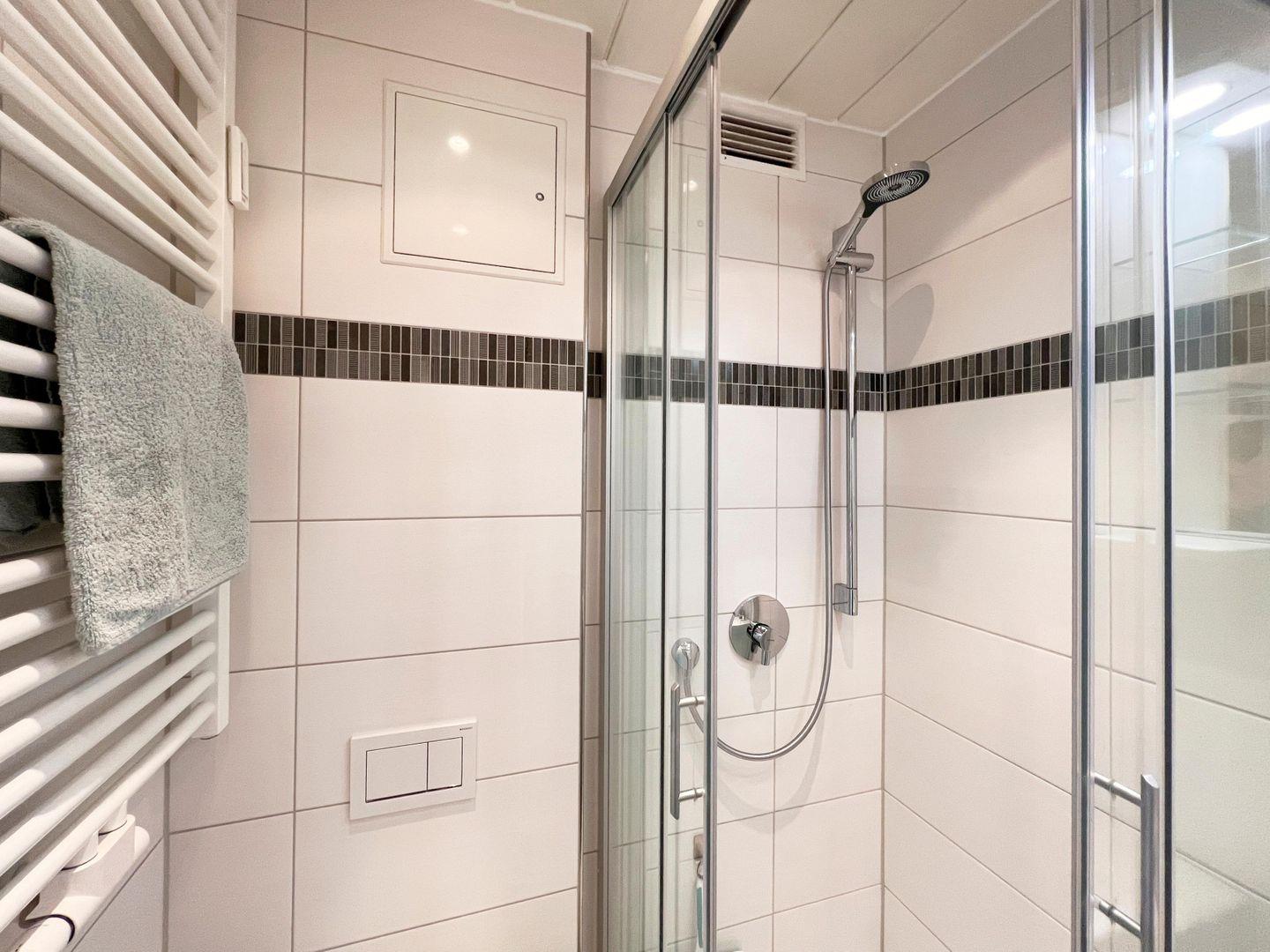 Im Bad sind eine Dusche und ein moderner Handtuchheizkörper untergebracht.