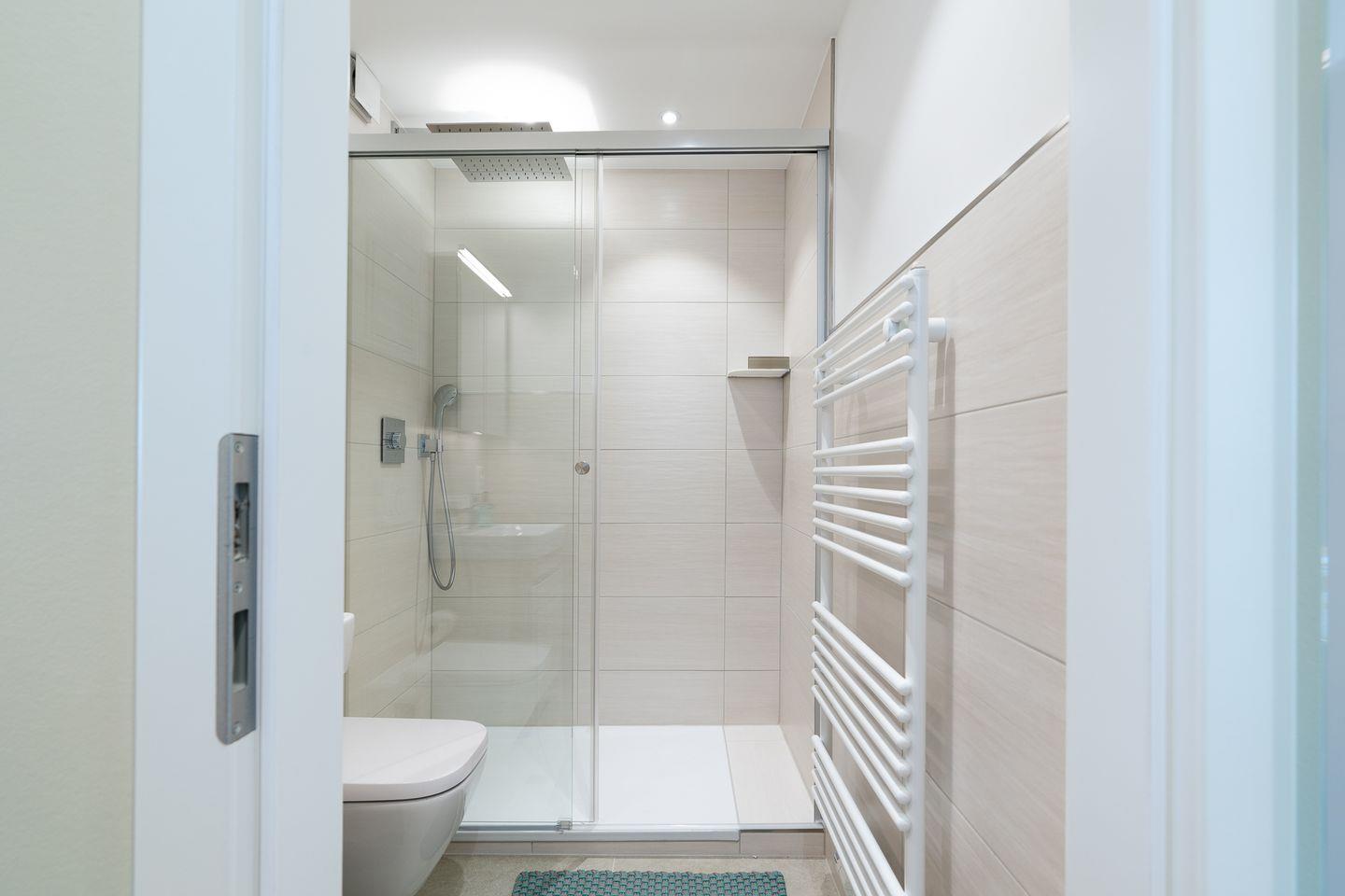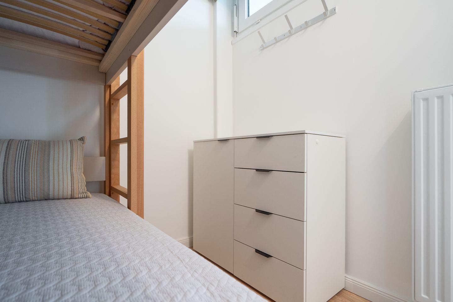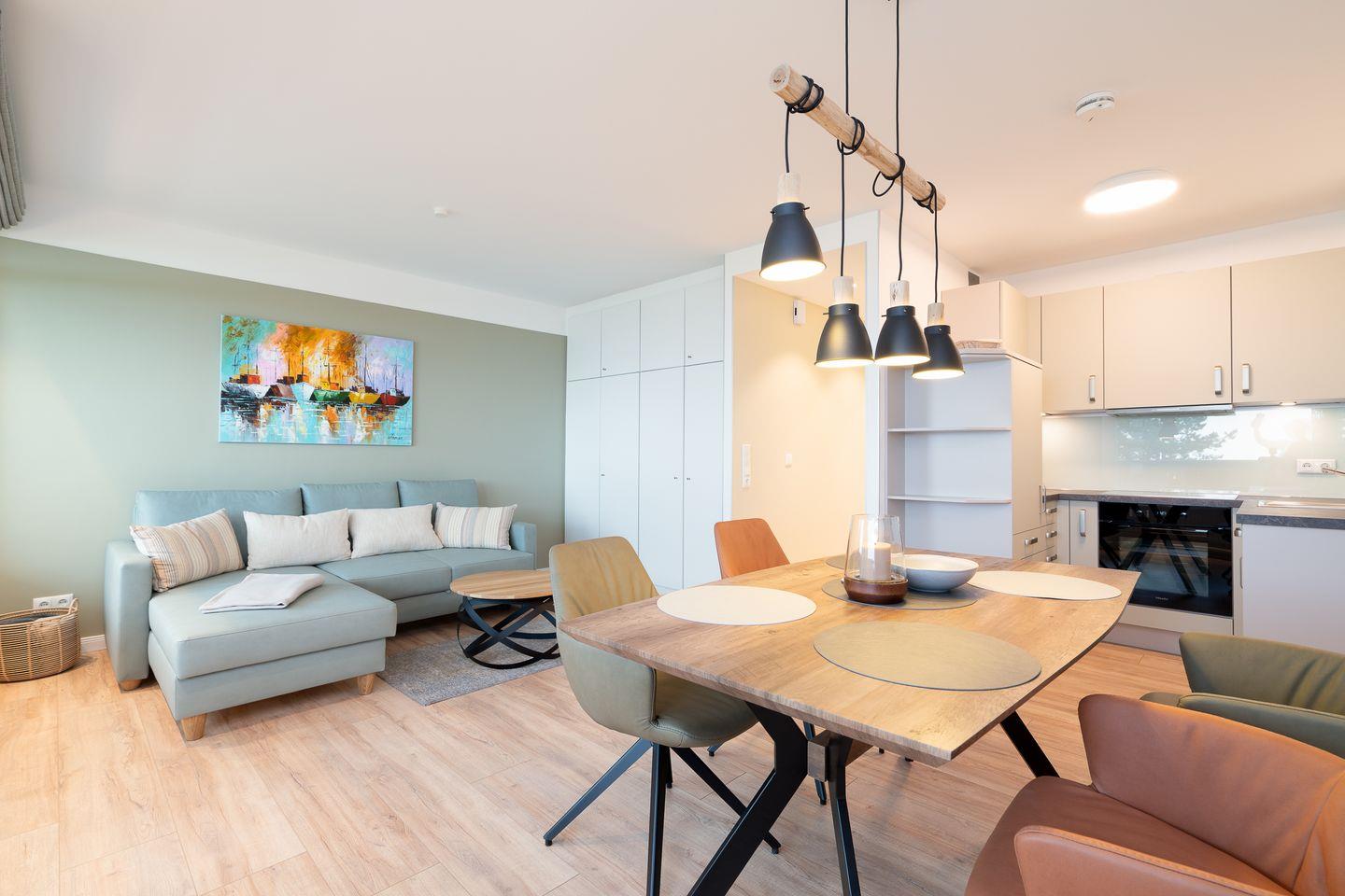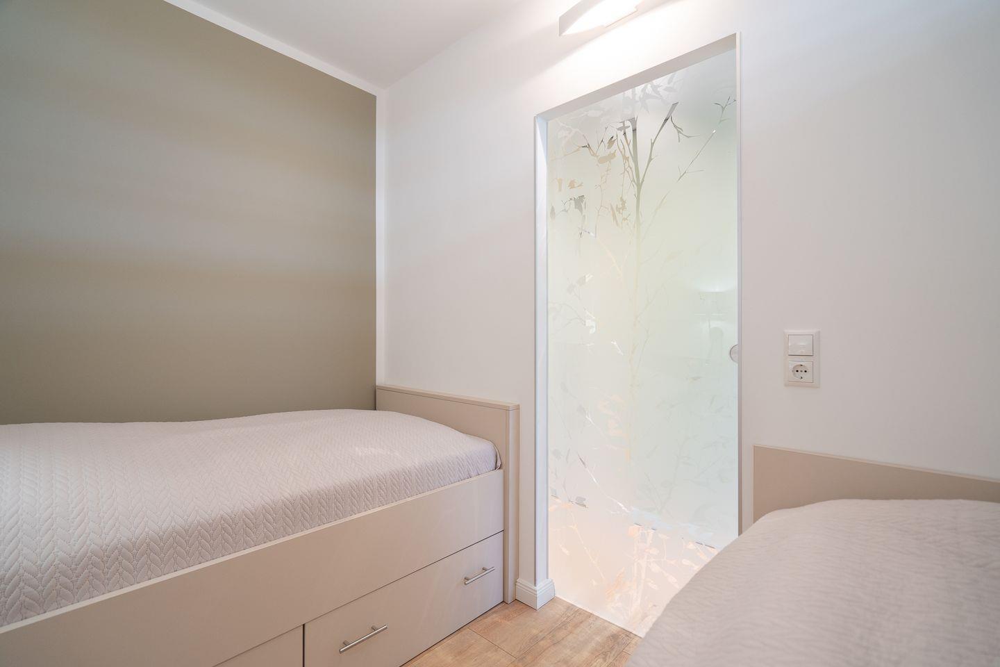 Das 48 m² große Apartment hat zwei separate Schlafzimmer und bietet insgesamt vier Schlafmöglichkeiten, und ist somit ideal für den Familienurlaub. Im ersten Schlafzimmer stehen zwei Einzelbetten (jeweils 90 x 190 cm), im zweiten Schlafzimmer steht ein Etagenbett (jeweils 80 x 190 cm). Das modern gestaltete Wohnzimmer verfügt über eine gemütliche Sofaecke, einen großen Flachbildfernseher sowie kostenloses WLAN und lädt zum Entspannen nach einem erlebnisreichen Tag ein. Der Essbereich verbindet den Wohnraum offen mit der vollständig ausgestatteten Küche, die Ihnen alles bietet, was Sie für eine komfortable Selbstversorgung benötigen. Das moderne, innenliegende Bad verfügt über eine bodentiefe Dusche.