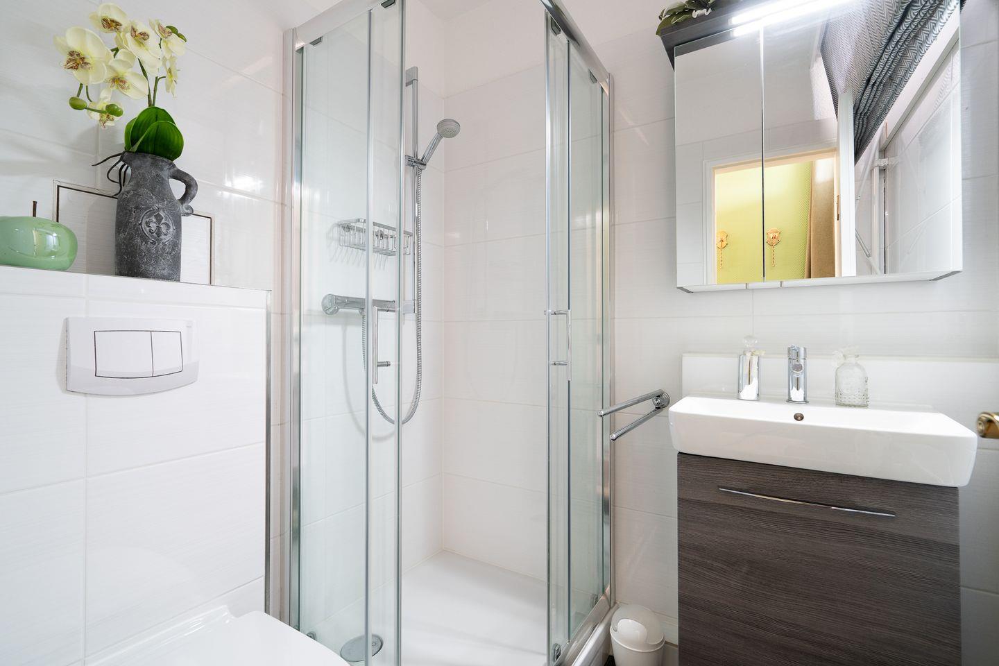 Die Unterkunft verfügt über ein separates Schlafzimmer mit zwei Einzelbetten (jeweil 80 x 200 cm), die man nicht zusammenstellen kann. Das moderne und hell geflieste Badezimmer ist innenliegend und verfügt über eine Dusche, Waschtisch, Spiegel und ein WC.