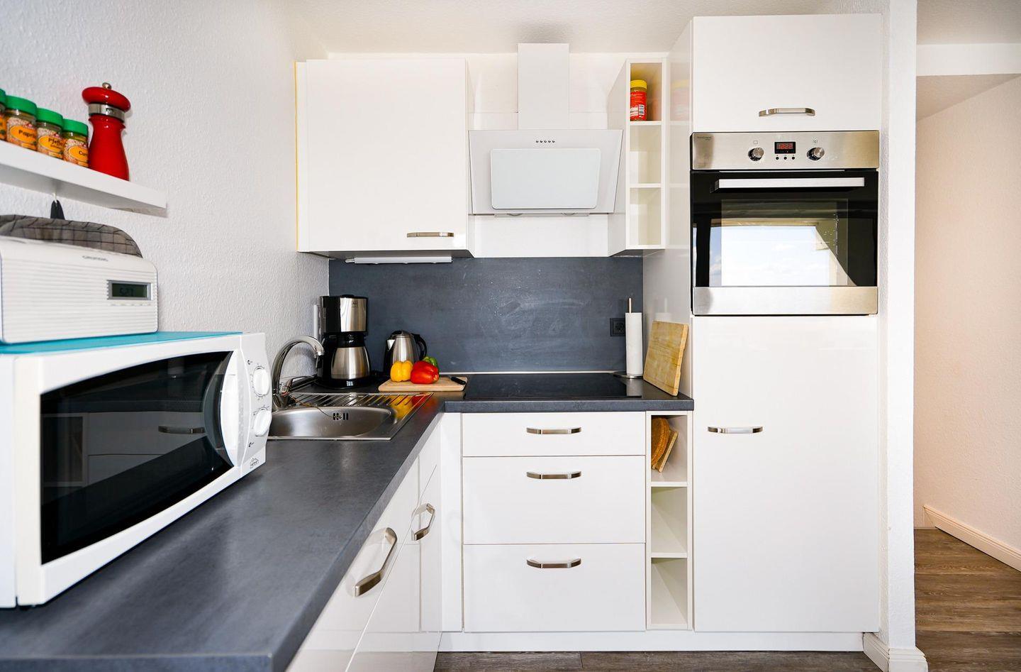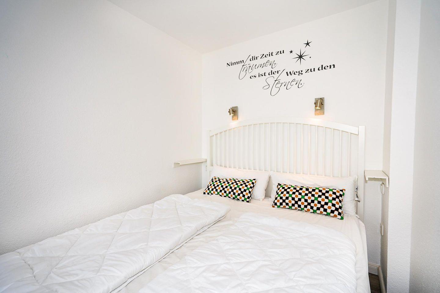 Das geräumige und helle Wohnzimmer verfügt über einen Schlafbereich mit komfortablem Doppelbett, eine Schlafcouch für 2 weitere Besucher sowie über eine offene Küche. Im Küchenbereich finden sich alle Utensilien und Kochgeräte für die Zubereitung eigener Mahlzeiten. Zur weiteren Einrichtung gehört ein großer Flachbildfernseher. Das Bad ist hochwertig mit einer frei zugänglichen Dusche ausgestattet. Ein weiteres ausziehbares Bett, das sowohl als Einzel- als auch als Doppelbett genutzt werden kann, befindet sich im kleineren Schlafzimmer der Ferienwohnung. Die 8 Quadratmeter große und mit Sitzmöbeln und Markise ausgestattete Loggia bietet eine Traumaussicht auf die Ostsee. Ein Nebenzimmer kann als Ankleideraum oder als Aufbewahrungsraum für das Reisegepäck verwendet werden.