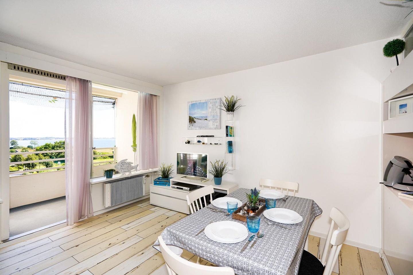 Über einen Fahrstuhl kann die in der 4. Etage gelegene Wohnung bequem erreicht werden. In dem hellen und gemütlich eingerichteten Wohnzimmer ist eine moderne Küche integriert. Diese enthält neben allen Kochutensilien auch eine komfortable Spülmaschine. Eine Essecke, eine bequeme Schlafcouch sowie ein großer Flachbildfernseher befinden sich ebenfalls im Wohnraum. Das Schlafzimmer ist mit zwei Einzelbetten eingerichtet. Das Badezimmer verfügt über eine Dusche. Von dem mit wetterfesten Möbeln ausgestatteten Balkon eröffnet sich eine Aussicht auf das Meer in Richtung der Ortschaft Pelzerhaken. Bis zum Ostseestrand sind es nur 3 Gehminuten.