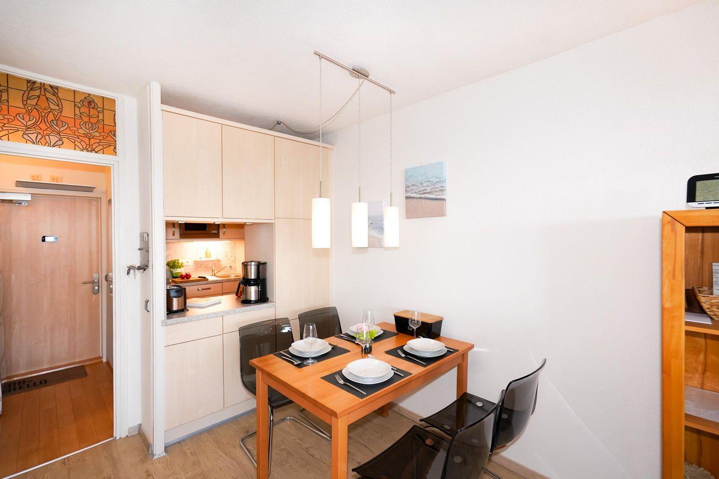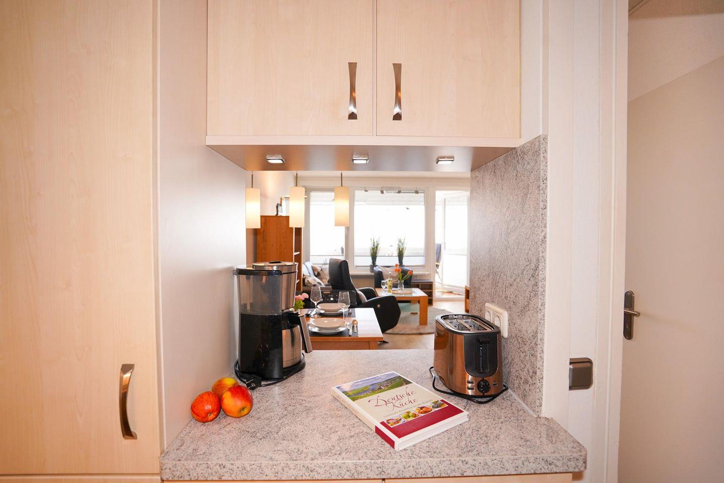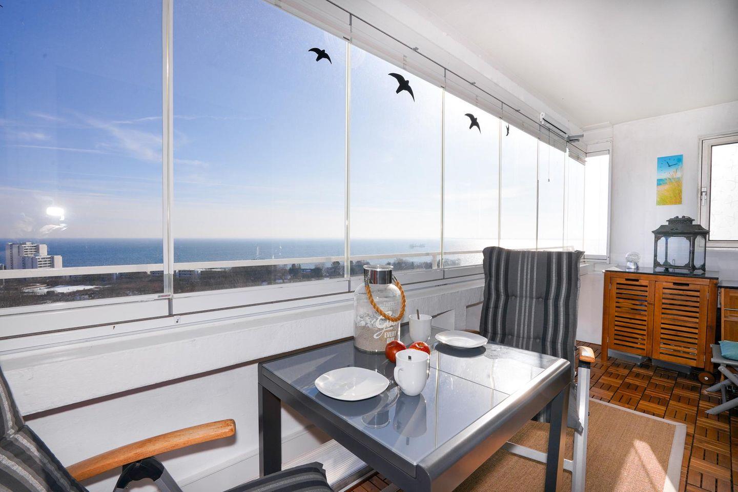 Schönes 42 qm Apartment im 9. Stock mit Ausrichtung zur Ostsee mit traumhaftem Meerblick auf die Lübecker Bucht. Die Ferienwohnung ist gut ausgestattet mit einer hochwertigen Ledergarnitur und zwei passenden Sesseln, einem verglasten Balkon (teilweise oder komplett zu öffnen) mit Frühstückstisch und Sitzgelegenheit. Ihr neuer Lieblingsplatz am Meer. Eine gut ausgestattete Küche, mit Geschirrspüler, Mikrowelle und allem, was man im Urlaub benötigt.
