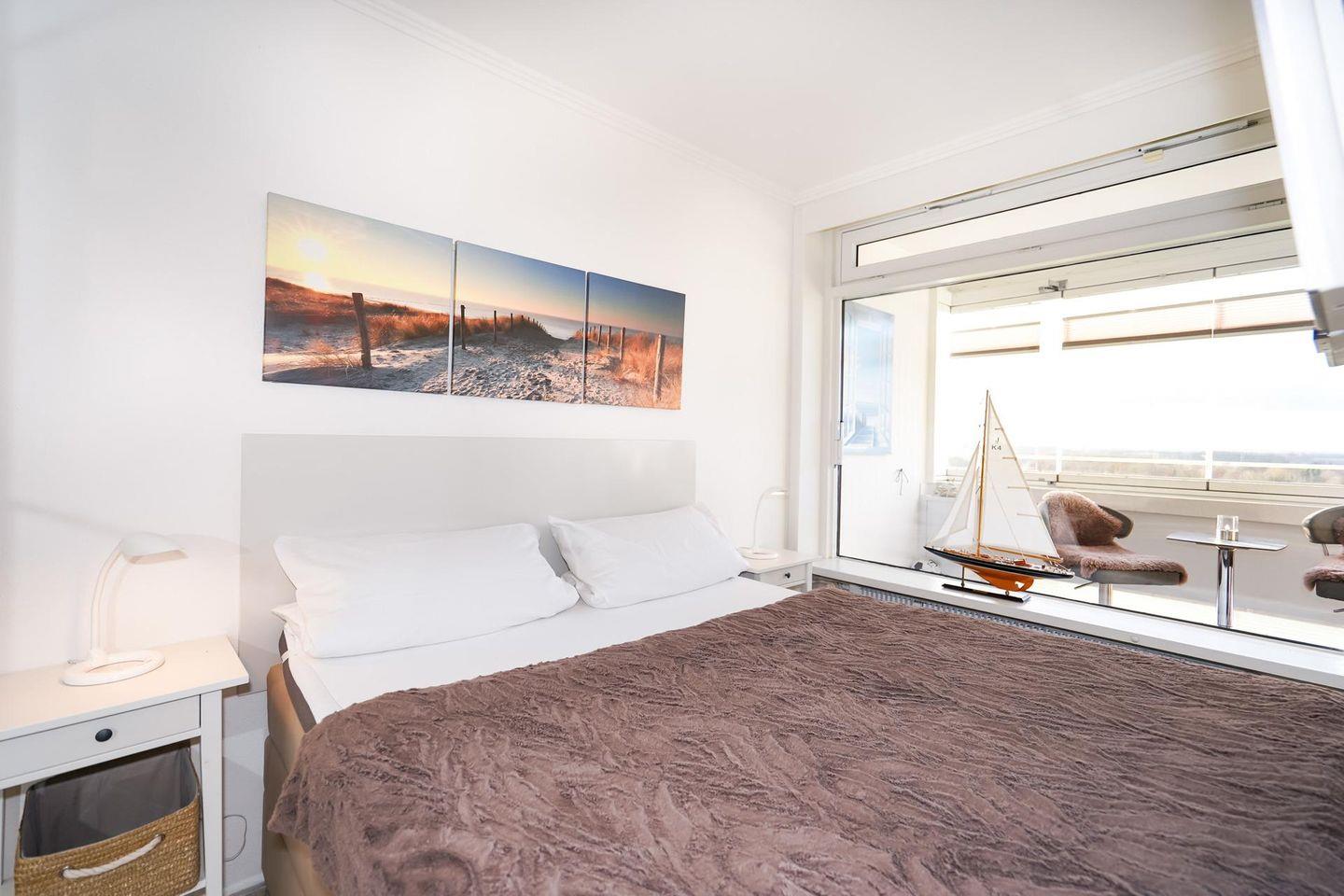 Sie können, wenn Sie in der Wohnung sind, die Ostsee auch direkt sehen - seitlicher Blick- oder indirekt über den Wandpanoramaspiegel. Auf dem großen verglasten Balkon stehen zwei höhenverstellbare Barstühle mit kleinem Bartisch sowie zwei Rattanhochlehner und dazugehörigem Tisch.