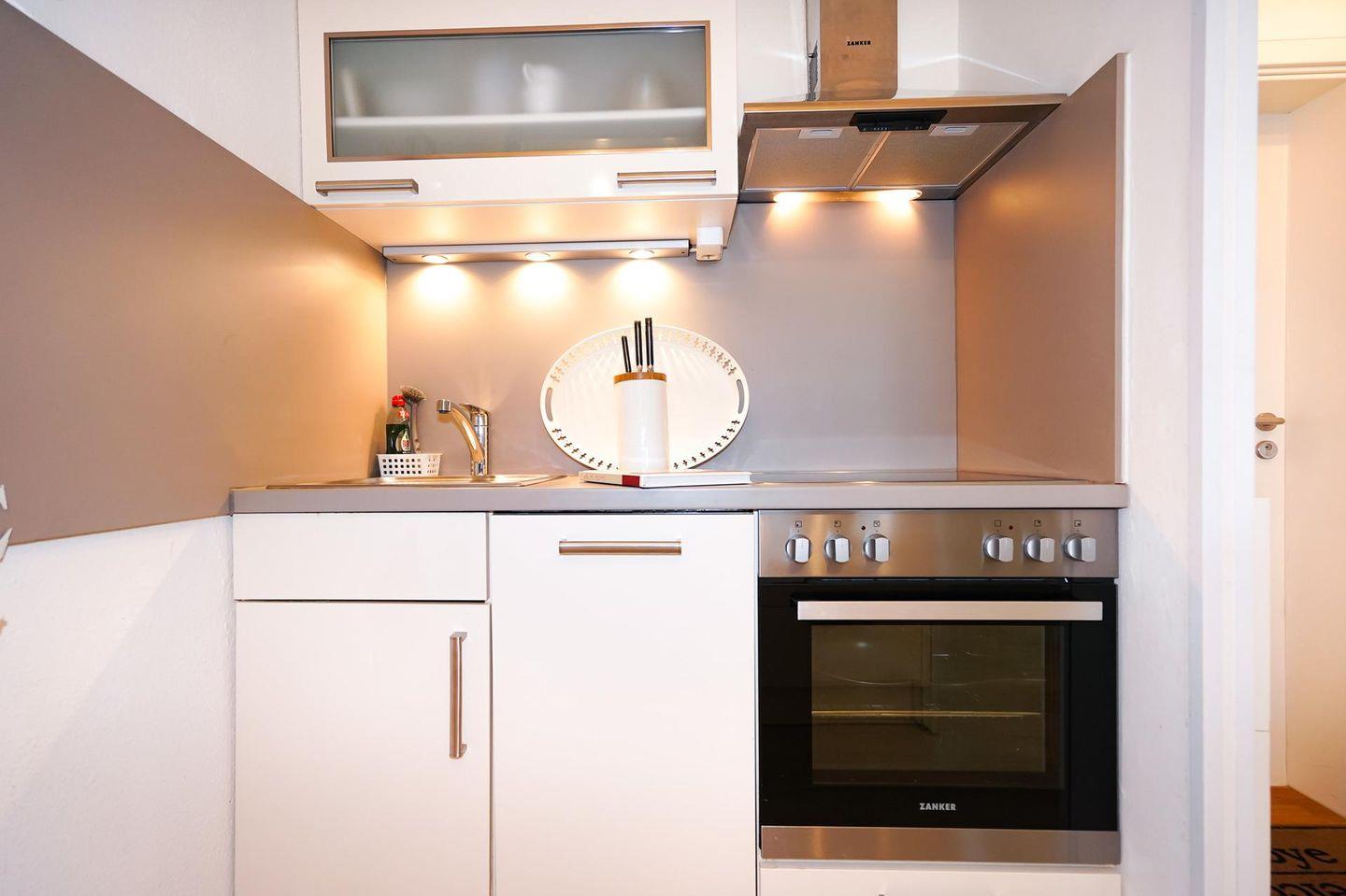 Die geschmackvolle moderne integrierte Einbauküche ist mit einem Tresen und wie folgt ausgestattet: Geschirrspüler, Spüle, Backofen mit 4 Cerankochfelder, Dunstabzugshaube, Oberschrank, Mikrowelle, Kühlschrank mit Gefrierfach und ein weiterer Kühlschrank mit separatem Gefrierschrank, Unterschränke, Kaffeemaschine, Wasserkocher, Eierkocher, Toaster, Mixer und ausreichend Geschirr.