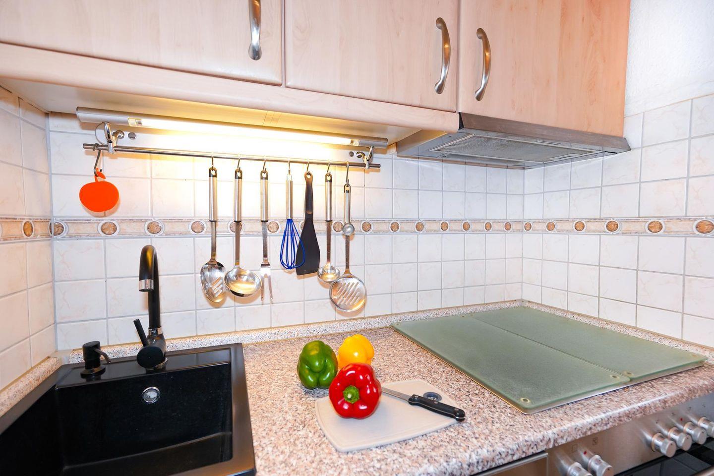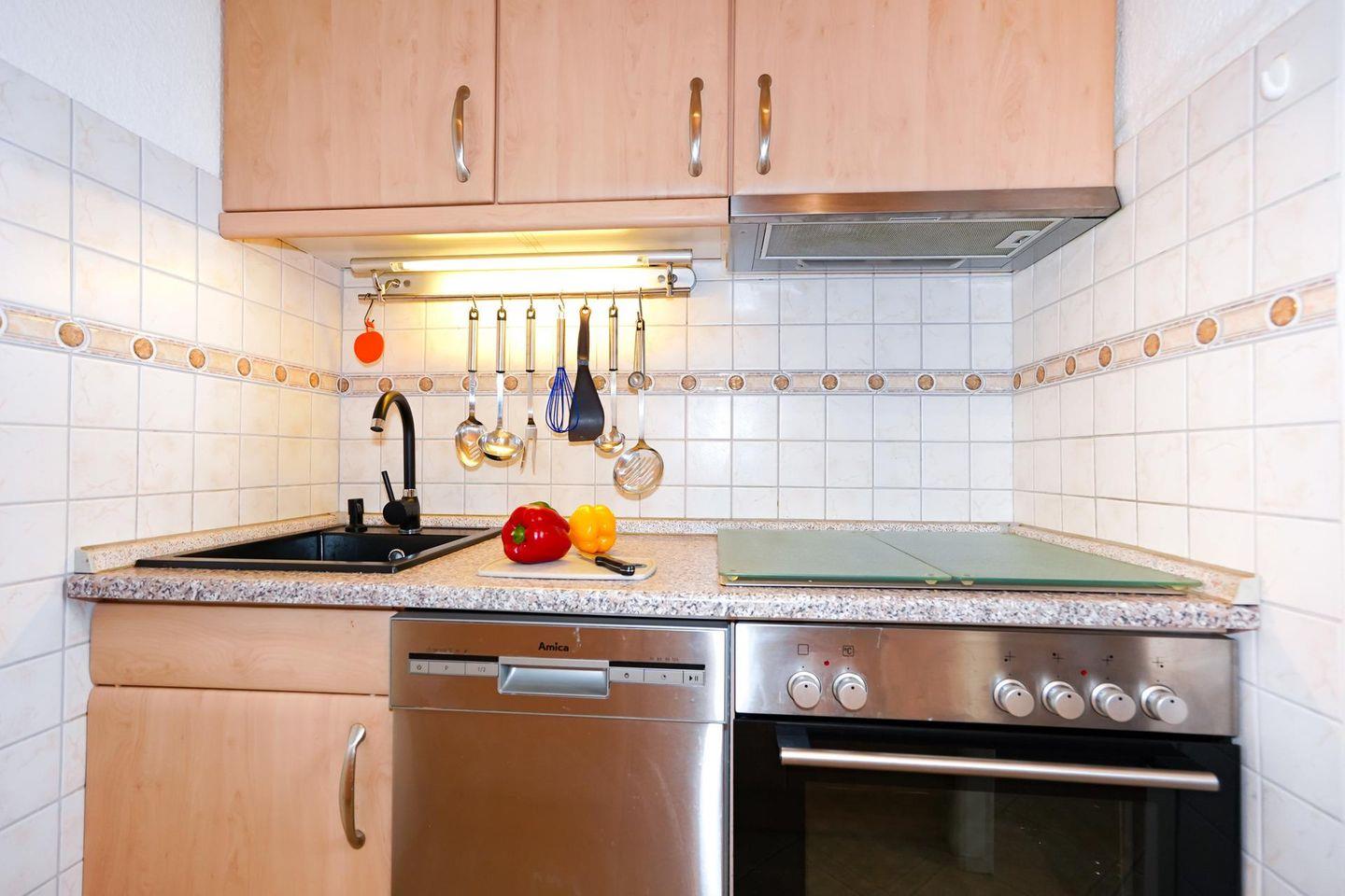 Die kleine Küche ist über eine Durchreiche mit dem Wohn-Essbereich verbunden. Die gut ausgestattete Küche verfügt über eine Spülmaschine, einen 4-Platten-Herd, einen Backofen, eine Mikrowelle, einen Kühlschrank, einen Gefrierschrank, eine Kaffeemaschine, einen Wasserkocher sowie einen Toaster.
