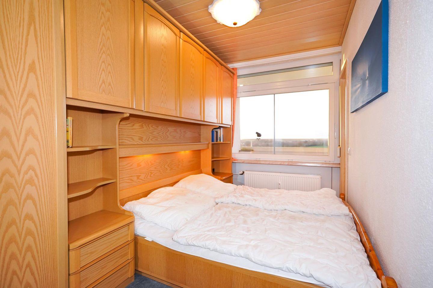 Der Schlafraum wird über ein Fenster belüftet und bietet mit einem großen Doppelbett und einem zusätzlichen Etagenbett vier Schlafplätze. Der Bereich mit dem Etagenbett ist durch den großen Kleiderschrank teilweise abgeschirmt.