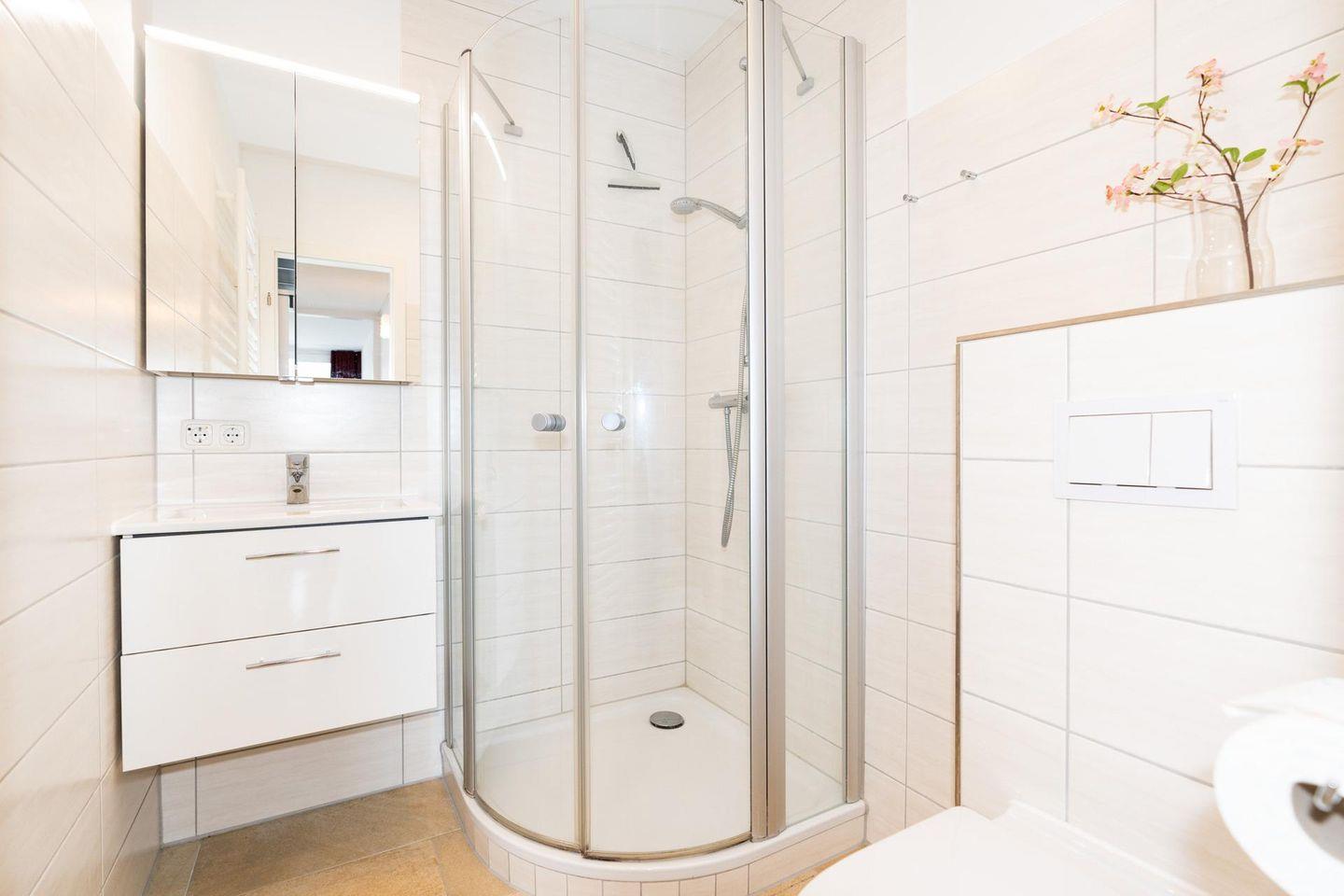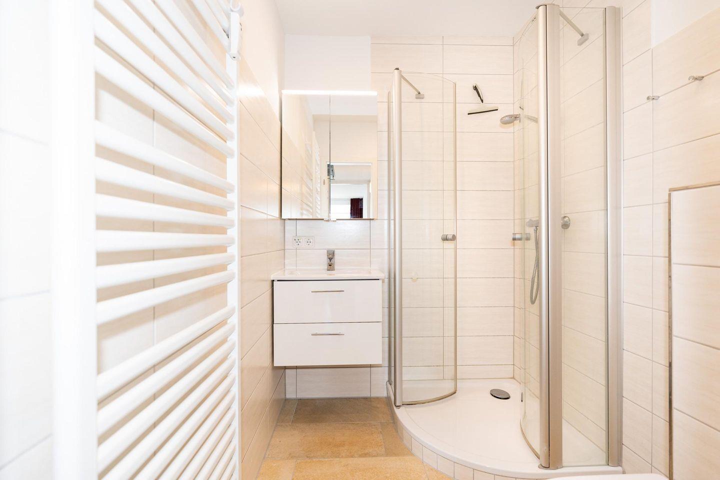 Das sehr moderne hell geflieste, innenliegende Badezimmer ist mit WC und Dusche und beheizbarem Handtuchhalter ausgestattet.
