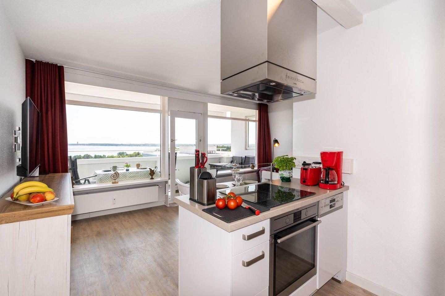Die kleine und offene Küche ist mit Backofen, Herd, Spülmaschine, Mikrowelle, Wasserkocher, Kaffeemaschine und Toaster ausgestattet - ideal, um auch im Urlaub entspannt zu kochen.