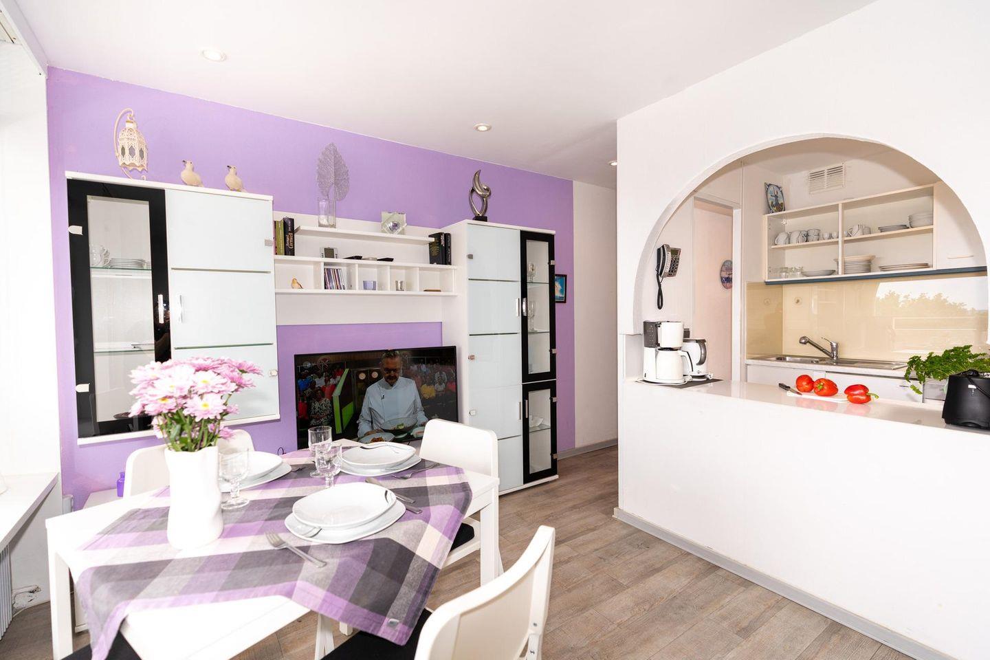 Das Wohnzimmer ist geschmackvoll eingerichtet und lädt nach einem Tag an der Ostsee zum Entspannen ein. Hier steht Ihnen auch ein TV zur Verfügung, sodass Sie sich abends unterhalten können. Dank kostenfreiem WLAN und Internetzugang sind Sie stets gut vernetzt – egal, ob Sie Urlaubsfotos verschicken, die nächsten Ausflüge planen oder berufliche Anliegen erledigen möchten.