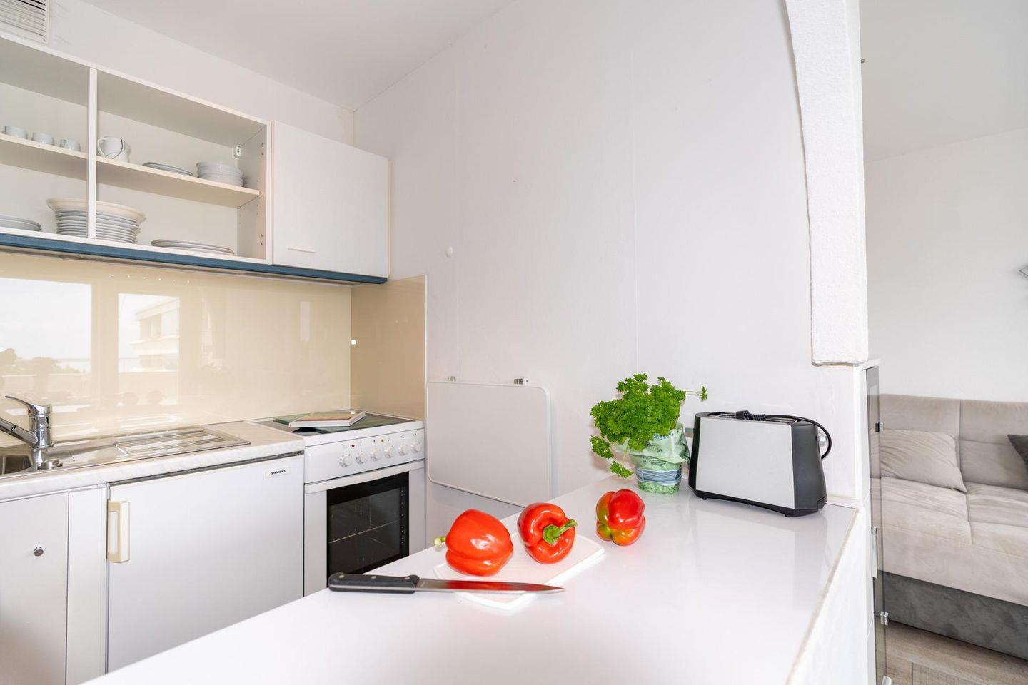 Die Kochnische ist funktional und umfassend ausgestattet und beinhaltet einen Backofen, einen Kühlschrank, eine Kaffeemaschine sowie einen Wasserkocher. Ein Essplatz steht zur Verfügung, damit Sie regionale Spezialitäten oder ein selbst zubereitetes Frühstück gemeinsam genießen können. Warmes Wasser ist jederzeit gewährleistet.