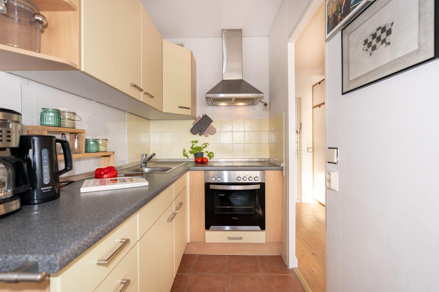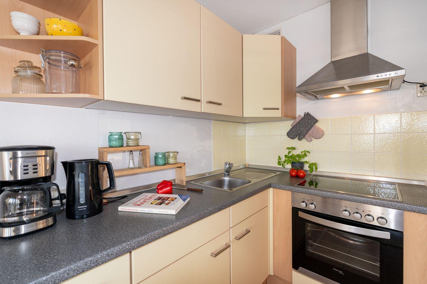 Die Küche ist offen zum Wohnbereich gestaltet und mit zahlreichen Annehmlichkeiten wie Backofen (Elektroanschluss), 4-Platten-Herd, Spülmaschine, Kühlschrank mit Gefrierfach, Kaffeemaschine, Wasserkocher sowie ausreichend Küchenutensilien, Geschirr und Besteck ausgestattet. Dies ermöglicht Ihnen die unkomplizierte Zubereitung eigener Mahlzeiten. Der Esstisch bietet einen schönen Platz für gemeinsame Mahlzeiten mit direktem Ostseeblick.