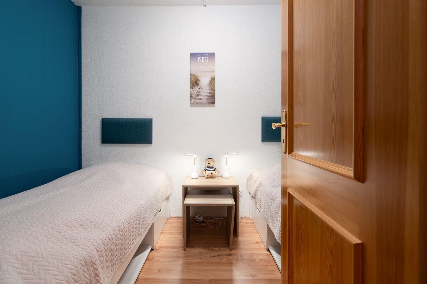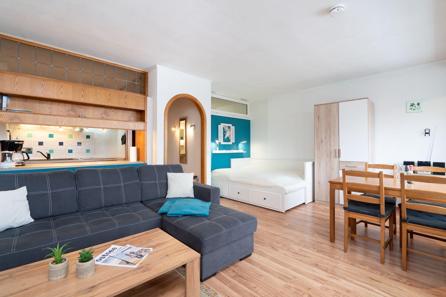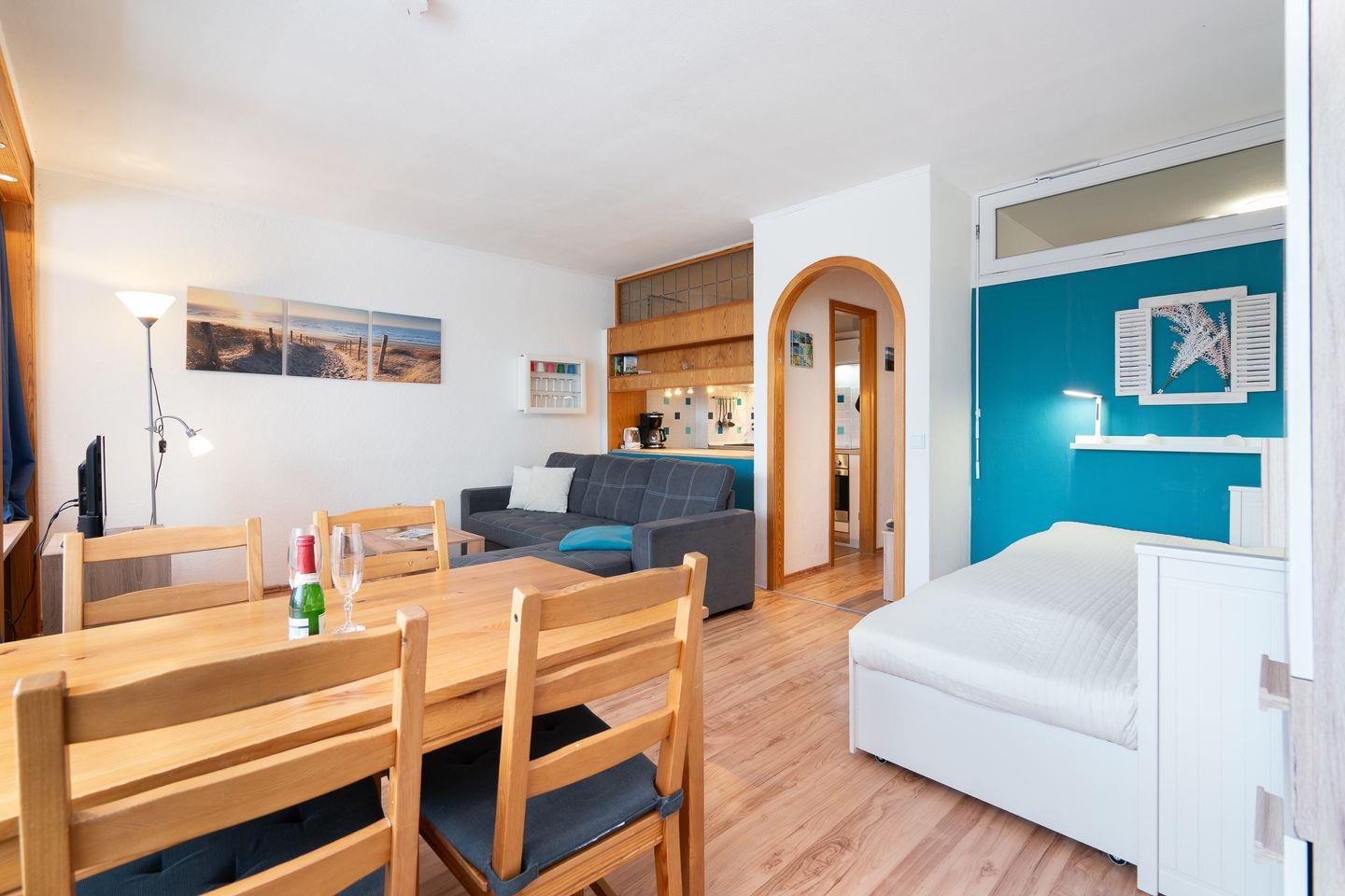 Das Appartement verfügt über ein separates Schlafzimmer und bietet eine angenehme Rückzugsmöglichkeit (1 x DB 2 x 80 x 200 cm, Verdunklung durch Gardinen). Insgesamt stehen Ihnen 2 Zimmer sowie 1 Badezimmer zur Verfügung. Im Wohnzimmer bietet ein ausziehbares Kojenbett einen weiteren komfortablen Schlafplatz ((Liegefläche 2 x 80 x 200cm, Verdunklung durch Gardinen, Kleiderschrank).