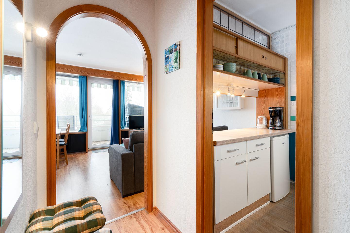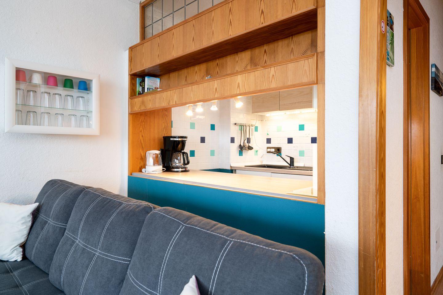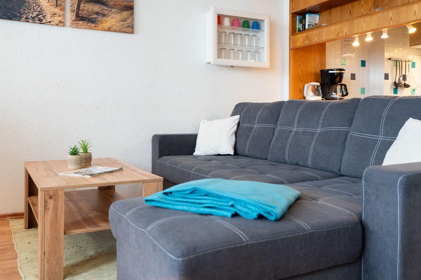 Das Appartement verfügt über ein separates Schlafzimmer und bietet eine angenehme Rückzugsmöglichkeit (1 x DB 2 x 80 x 200 cm, Verdunklung durch Gardinen). Insgesamt stehen Ihnen 2 Zimmer sowie 1 Badezimmer zur Verfügung. Im Wohnzimmer bietet ein ausziehbares Kojenbett einen weiteren komfortablen Schlafplatz ((Liegefläche 2 x 80 x 200cm, Verdunklung durch Gardinen, Kleiderschrank).