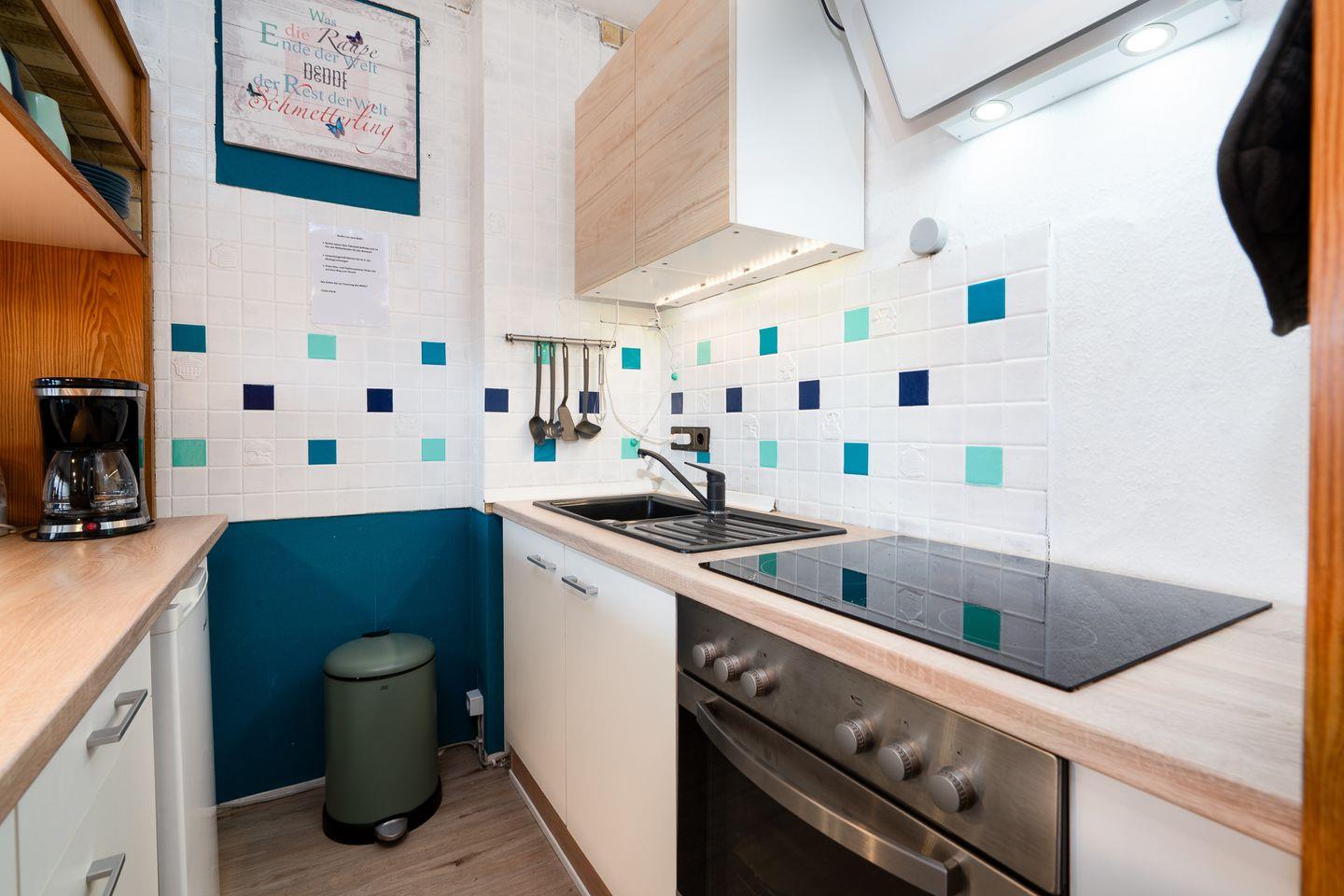 Der Wohnbereich ist offen gestaltet und verfügt über eine Sofaecke, einen Essplatz sowie einen TV. Die angrenzende Küche ist harmonisch integriert und ermöglicht eine flexible Selbstversorgung während Ihres Aufenthalts. Zur Ausstattung gehören unter anderem ein Ceran-Herd, Backofen, Mikrowelle sowie ein Kühlschrank mit Gefrierfach. WLAN steht Ihnen in der gesamten Ferienunterkunft kostenfrei zur Verfügung.