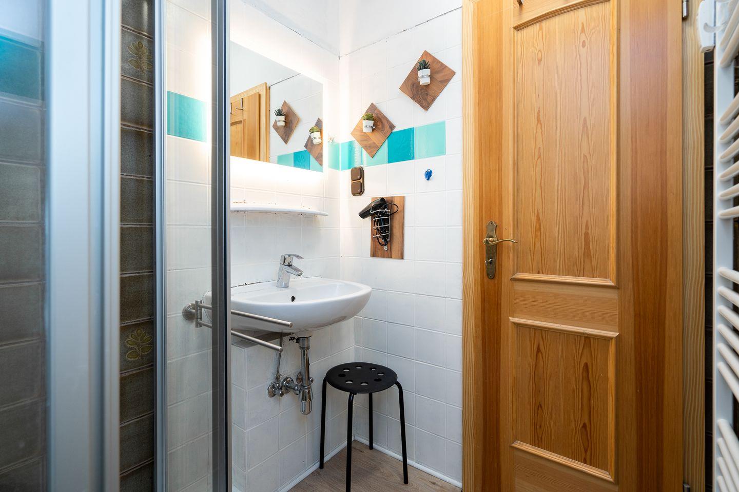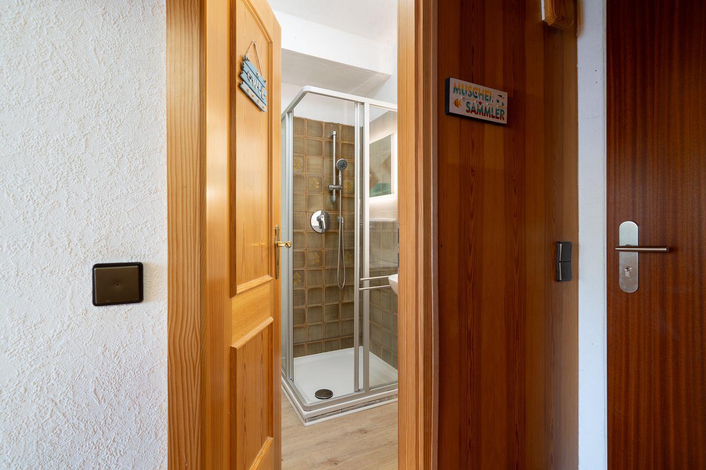 Das Badezimmer ist funktional ausgestattet und bietet eine Dusche mit niedrigem Einstieg. Ein Haartrockner ist vorhanden. Für längere Aufenthalte stehen Waschmaschine und Trockner im Ferienpark gemeinschaftlich zur Nutzung gegen Gebühr bereit. Praktische Details wie ein Wäscheständer und ein Staubsauger ergänzen die Ausstattung der Ferienwohnung.