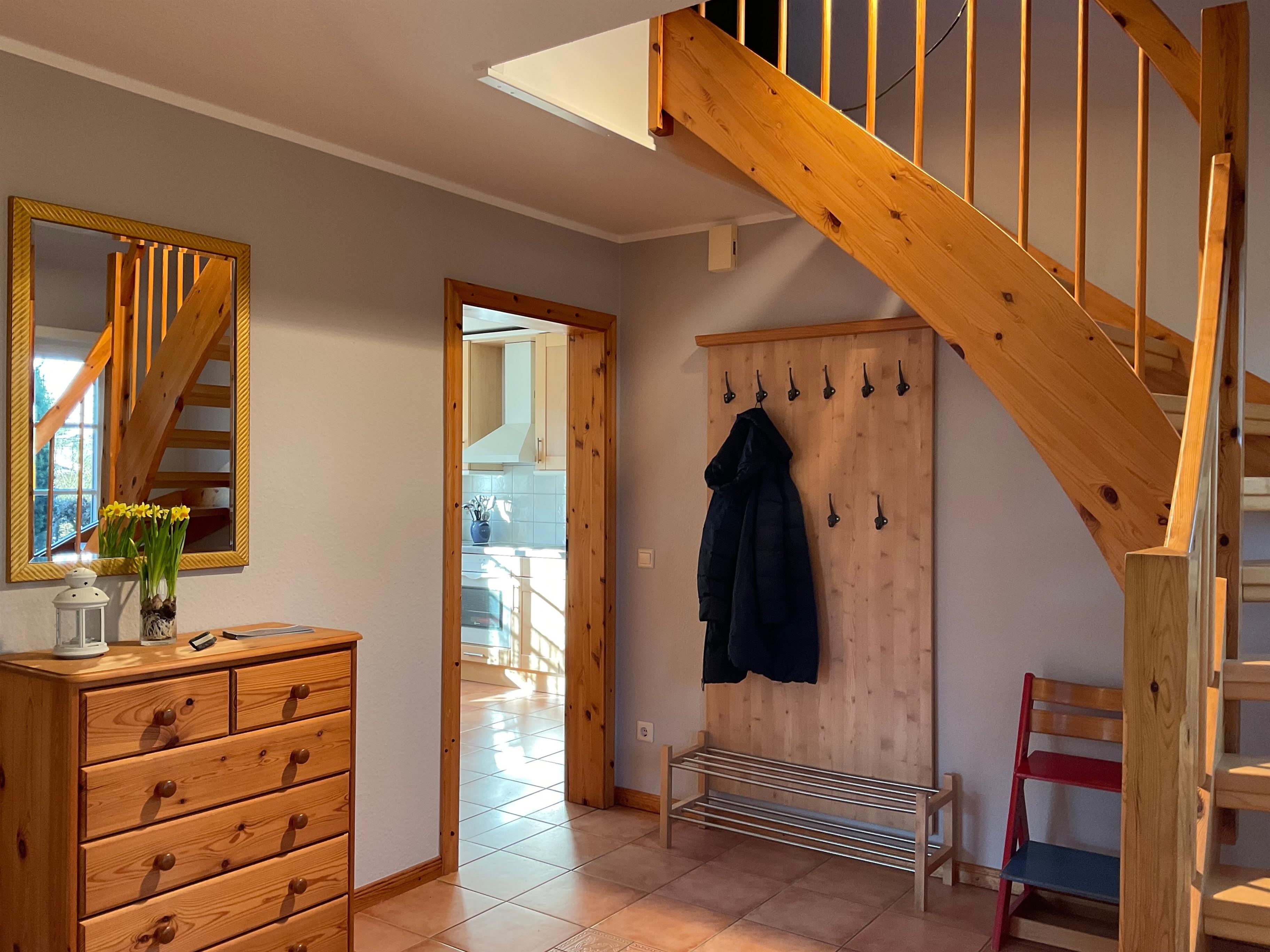 Große Ferienwohnung für 6 Personen (120 qm), verläuft über zwei Etagen, hat einen separaten Eingang mit Diele, ein Gäste-WC und ist 2021 renoviert worden, verfügt über ein Glasfaser-Internet mit 200Mbits und ist daher auch für Homeoffice geeignet. Das Wohnzimmer mit Essecke und Eckbank verfügt über einen Flachbildfernseher und eine Stereoanlage. Die Küche hat einen Herd/Backofen, Mikrowelle und Geschirrspüler. Im Hauswirtschaftsraum befinden sich die Waschmaschine und der Trockner. Die obere Etage verfügt über drei Schlafräume: ein Schlafzimmer mit Doppelbett, ein Schlafzimmer mit erhöhtem Doppelbett (1,40 m) und ein Schlafzimmer mit zwei Einzelbetten. Ebenso befinden sich hier ein kleines Lese-/Spielzimmer sowie das Bad mit Dusche und Badewanne. Bettwäsche und Handtücher sind schon im Preis enthalten. Dieses Objekt ist eine Nichtraucherwohnung. Ein PKW-Stellplatz, eine eigene Terrasse und ein Abstellraum für Fahrräder sind vorhanden.