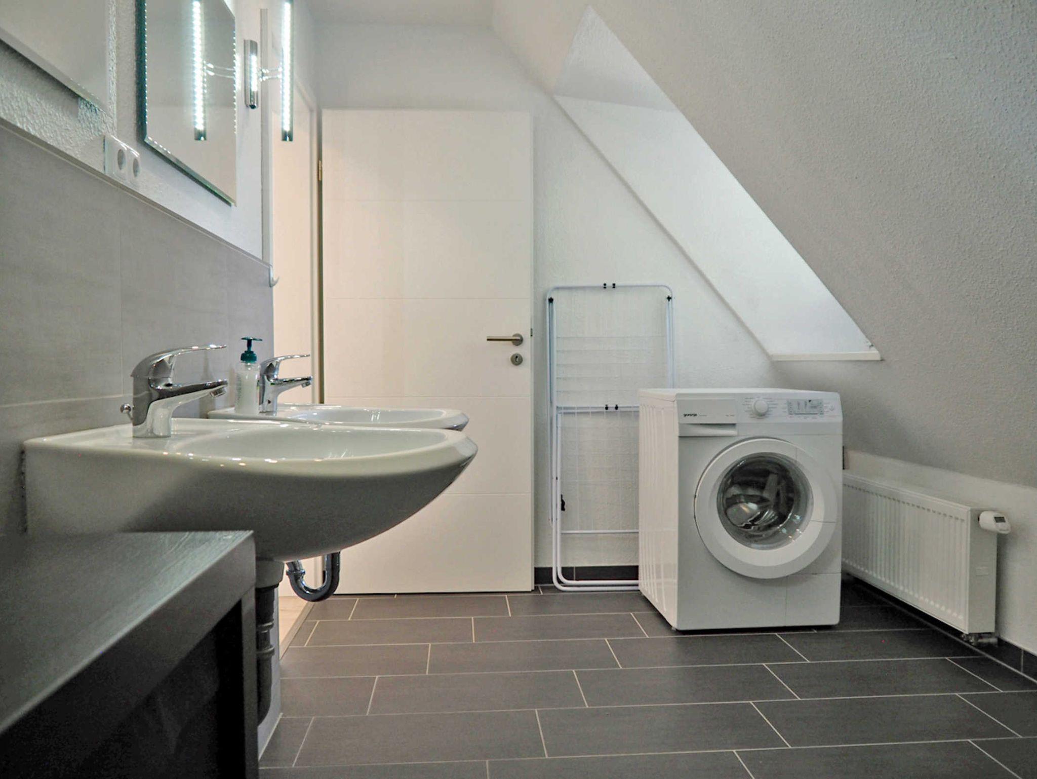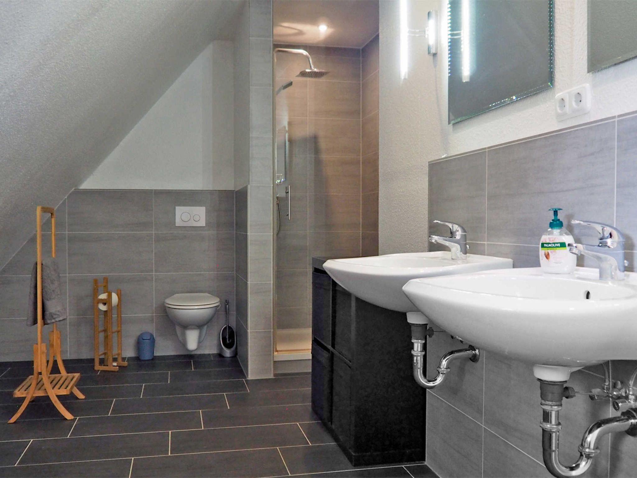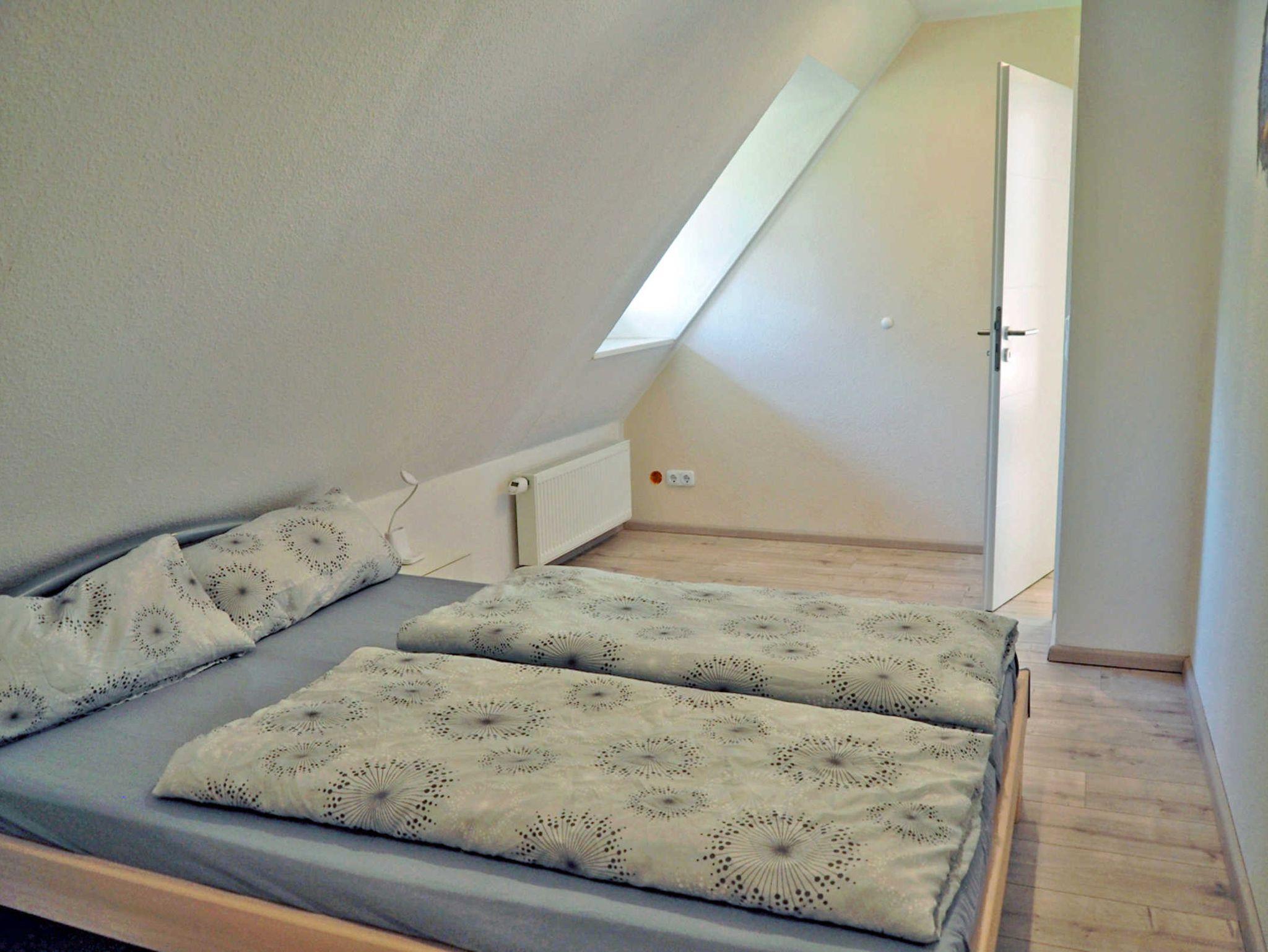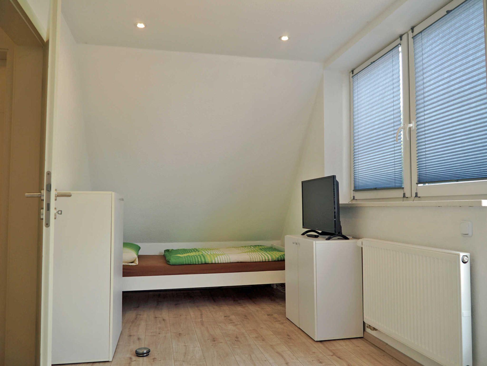 Im Obergeschoss befinden sich ein Schlafzimmer mit Doppelbett, ein Schlafzimmer mit zwei Einzelbetten -ausgestattet mit TV- sowie das geräumig Duschbad mit WC. Die Dachterrasse ca. 20 qm erreichen Sie durch das Zweibettzimmer.