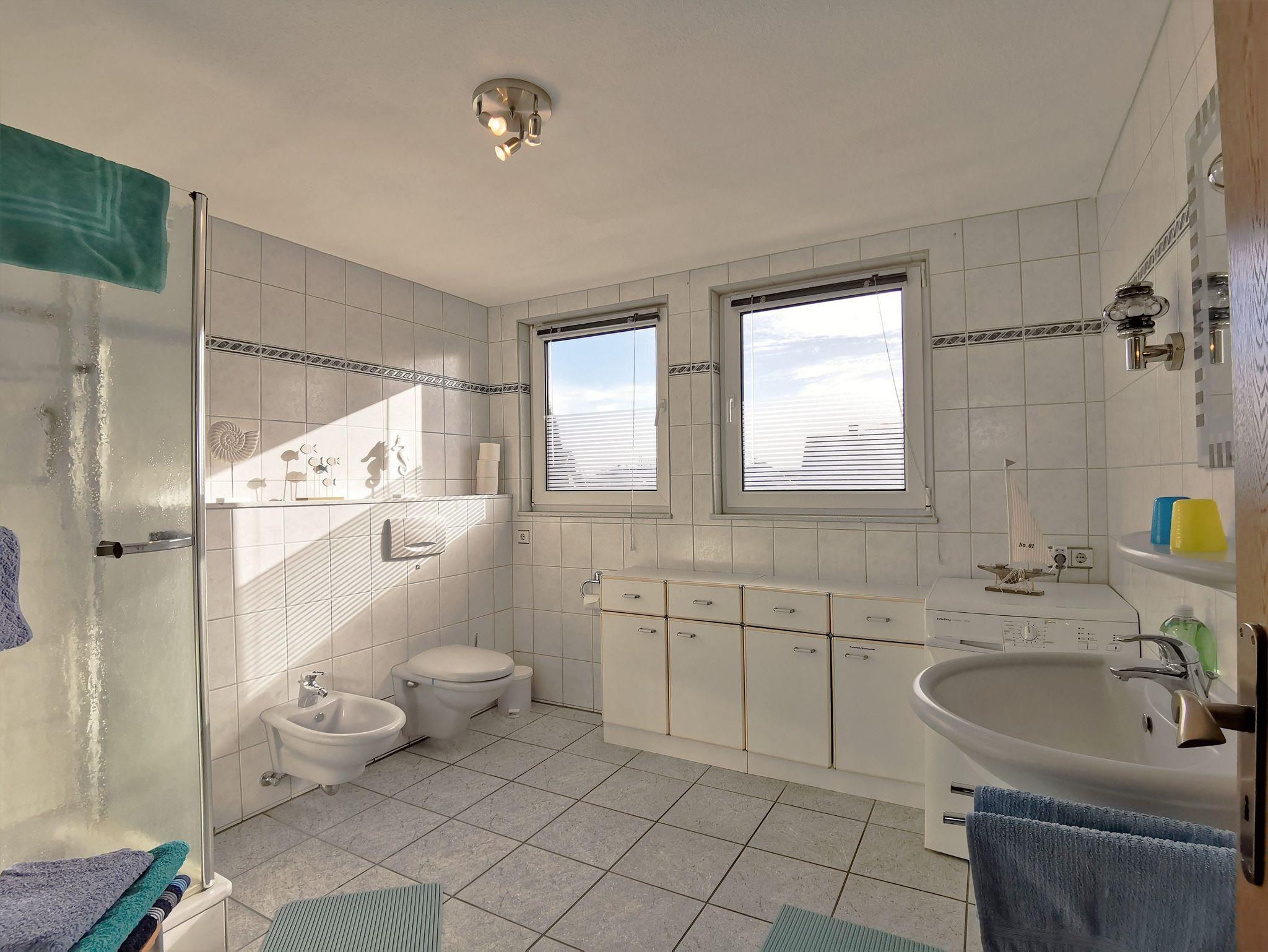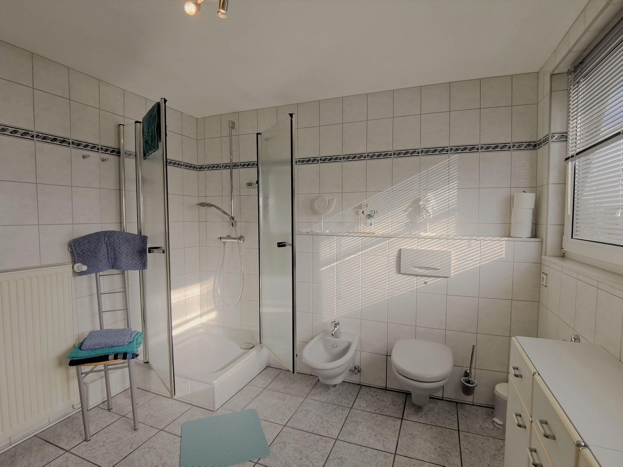 Die großzügige Ferienwohnung hat ein gemütliches Schlafzimmer mit Doppelbett und genügend Platz um ein Kinderreisebett aufzustellen (vor Ort). Das helle Wohnzimmer hat einen direkten Zugang zum sonnigen Balkon mit Sitzmöbeln und Blick in den Garten. Neben einer Sitzecke, TV und Schreibtisch gibt es noch eine Schlafcouch, die bei Bedarf ausgeklappt werden kann. Die Küche ist bestens ausgestattet (Spülmaschine, Mikrowelle, Gefrierschrank, Kaffeemaschine) und es gibt einen Tresen sowie eine Essecke: hier kann man gemeinsam die Mahlzeiten zubereiten und gemütlich beisammensitzen. Das Badezimmer ist mit einer Dusche, WC und Bidet ausgestattet, hier steht den Gästen außerdem eine Waschmaschine zur Verfügung. Der schöne Garten kann mitgenutzt werden, Fahrräder können im Gartenhaus eingeschlossen werden.