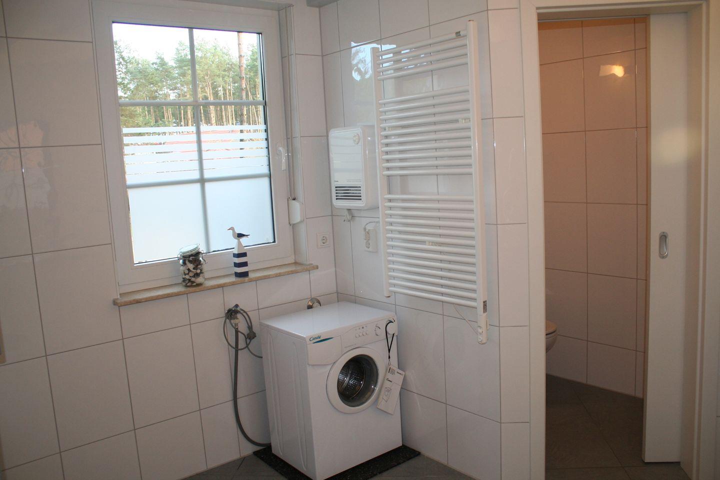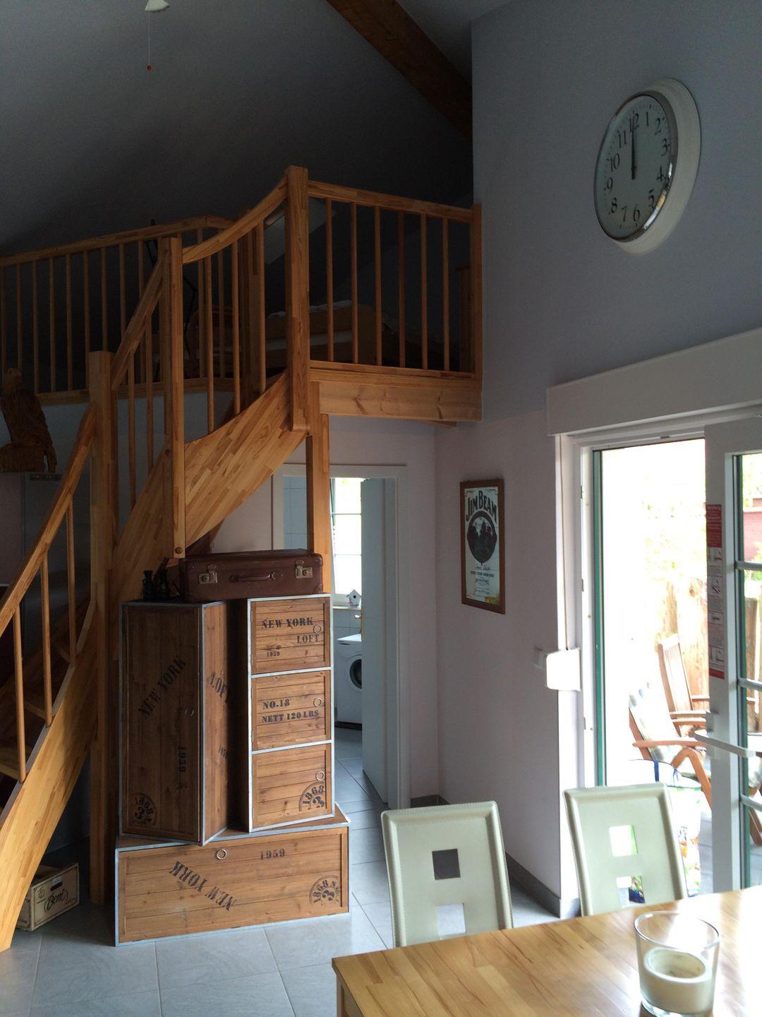 Über eine Holztreppe gelangen Sie nach oben zur offenen Schlafempore mit einem Doppelbett und einer Kommode. Das zweite Schlafzimmer ist mit zwei Einzelbetten, einem kleinen Tisch und einem Regal möbeliert und über eine schmale Holztreppe erreichbar. Das Bad ist mit einer Dusche, einem Waschtisch und einer Waschmaschine ausgestattet. Das WC befindet sich innerhalb des Bades in einem separaten Raum. Zum Ferienhaus gehören eine kleine Rasenfläche, eine überdachte Terrasse mit Gartenmöbeln und Grill. Im Holzanbau können die mitgebrachten Fahrräder eingeschlossen werden. Hier finden Sie auch die Schwimmwesten, Paddel und den Slipwagen für das ausleihbare Kanu (ca. 500m Weg mit Kanu zum Wasserzugang).