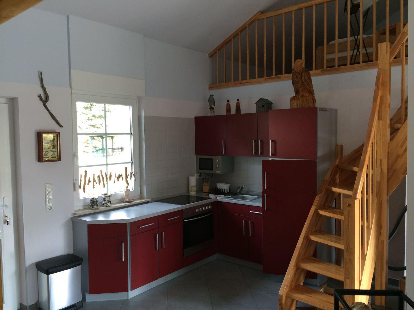 Hauses befindet sich das Wohnzimmer mit Eckcouch, einem kleinen Tisch und Kamin (Holz und Briketts werden kostenlos zur Verfügung gestellt.) Angrenzend befindet sich eine eingebaute Sauna. Die offene Küche, mit Esstisch und vier Stühlen, ist mit einem Backofen, einem Cerankochfeld, einem Kühlschrank mit Gefrierfach, Mikrowelle, Kaffeemaschine, Wasserkocher und Toaster ausgestattet.