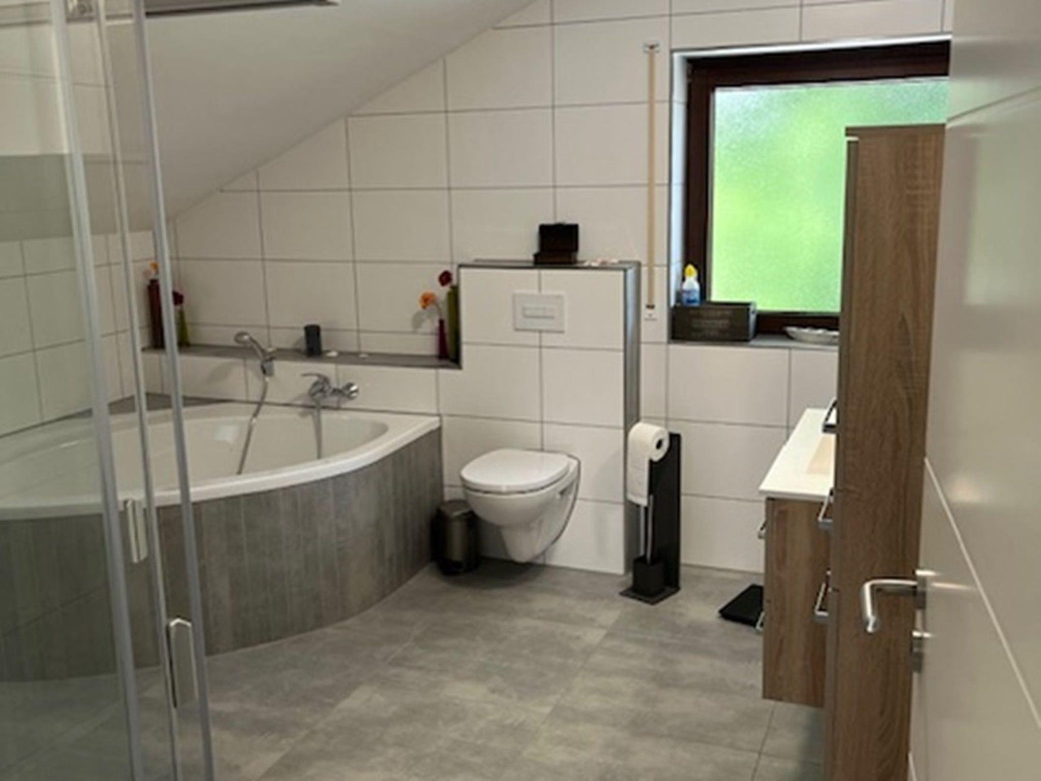Bad mit Dusche, Badewanne, WC und Waschbecken, Waschmaschine und Trockner