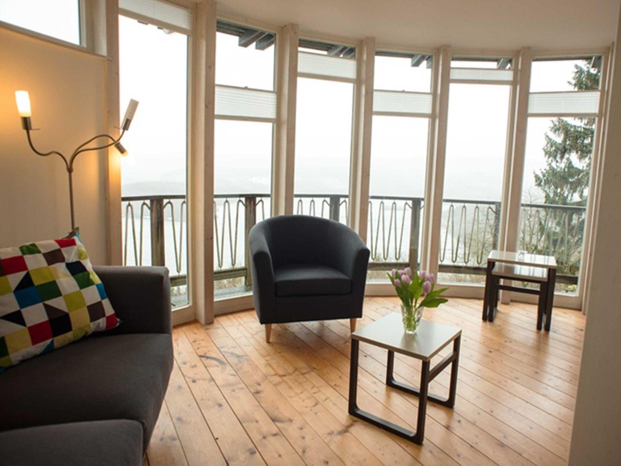 2 Terrassen mit Gartenmöbeln und Sonnenschirm - Blick auf den See