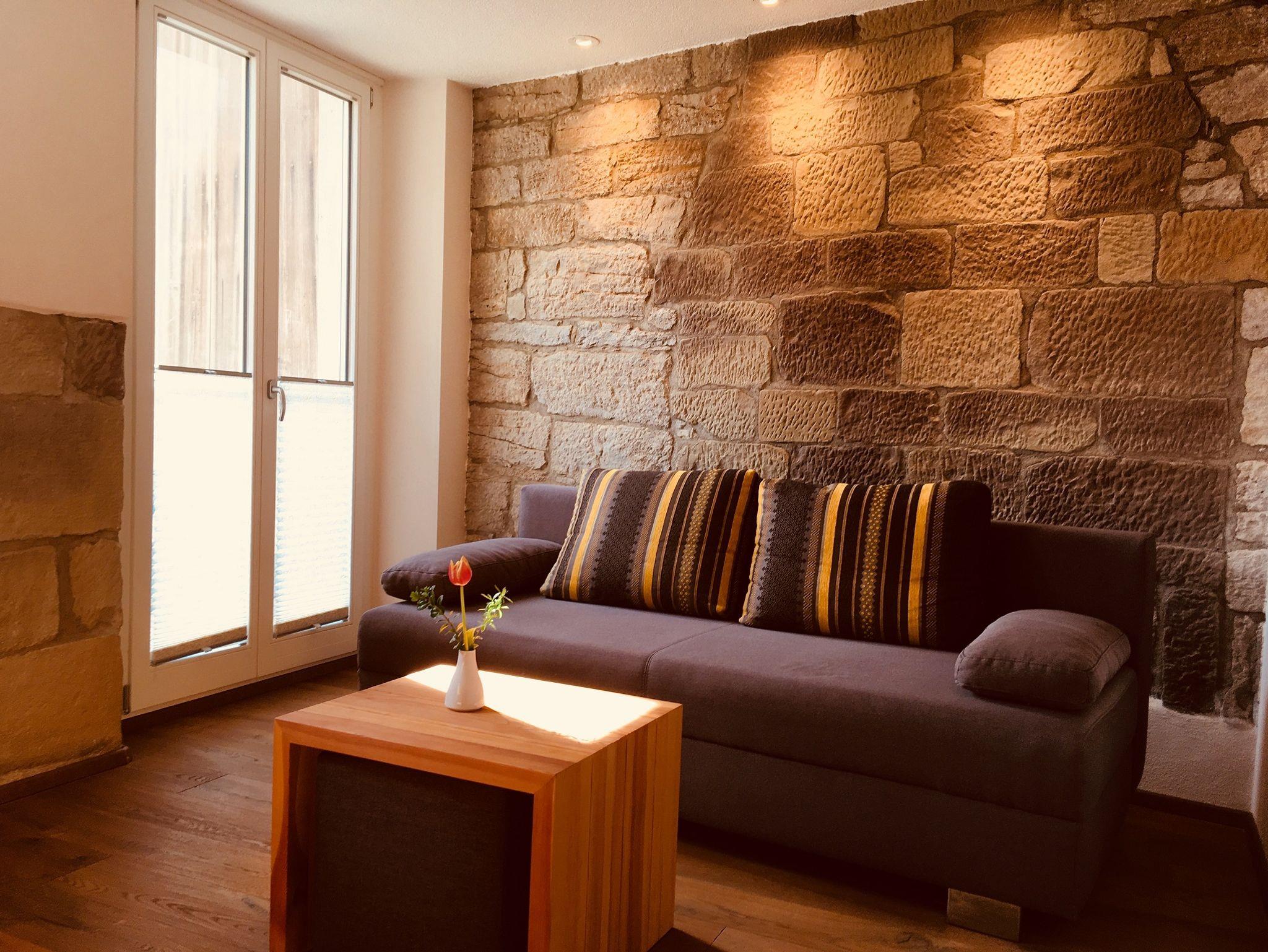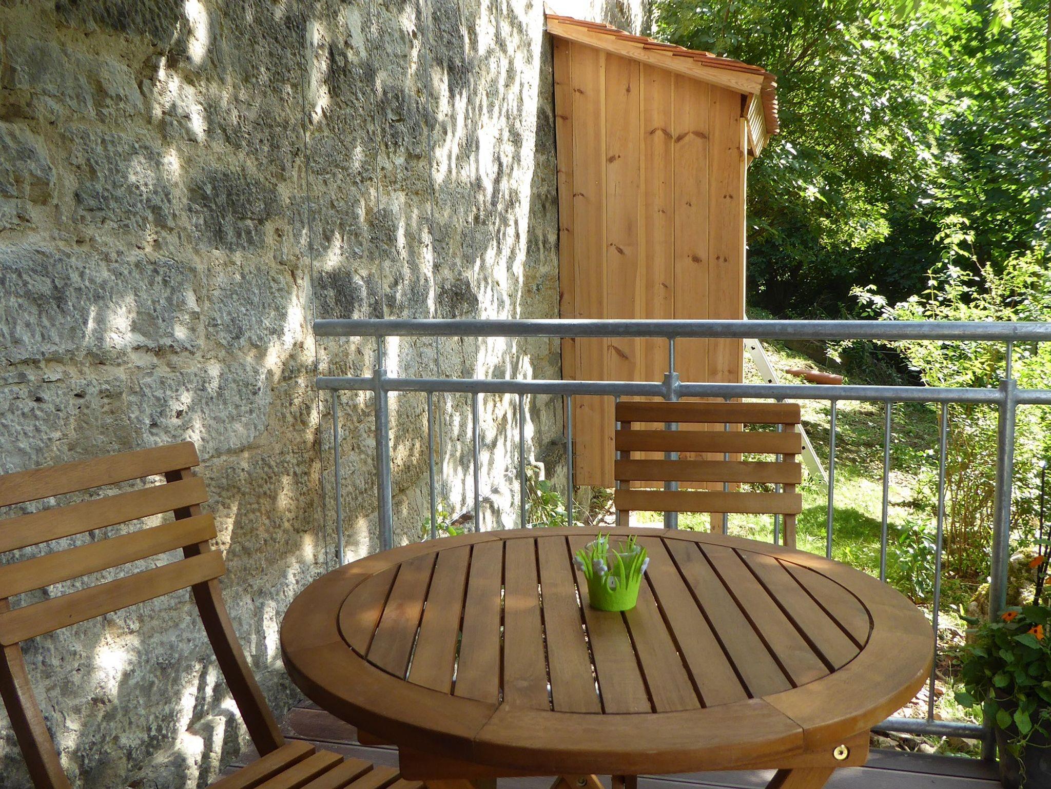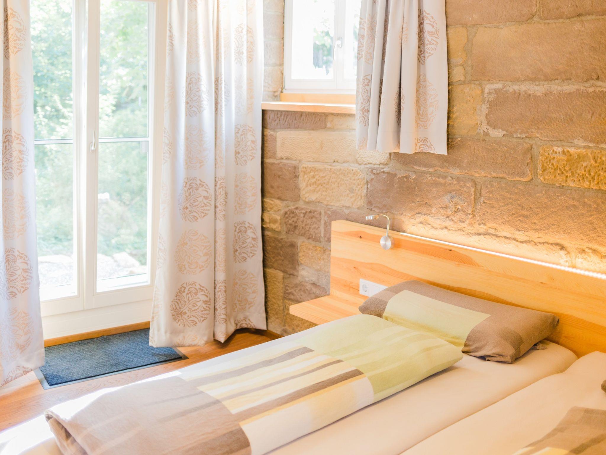 Diese wunderschöne, ebenerdige Wohnung entstand aus einem Teil unseres ehemaligen landwirtschaftlichen Gebäudes. Alle Holzmöbel wurden in der Region handgefertigt, der warme Holzboden aus Eichendielen entspricht traditioneller fränkischer Inneneinrichtung. Ein Highlight ist die alte Steinmauer, die toll erhalten und mit moderner Beleuchtung wunderbar in Szene gesetzt ist. Der kombinierte Wohn-Ess- und Kochbereich ist sehr komfortabel und funktionell zugleich ausgestattet. Im separatem Schlafzimmer können Sie sich in einem Bett aus 100% Naturmaterialien erholen und haben direkten Zugang zur Terrasse am Bach. Das moderne Tageslichtbad mit begehbarer Dusche, Waschtisch und WC lässt nichts vermissen und ist perfekt für einen angenehmen Start in den Tag ausgestattet. Die Morgensonne können Sie direkt auf dem Freisitz im Hof genießen.