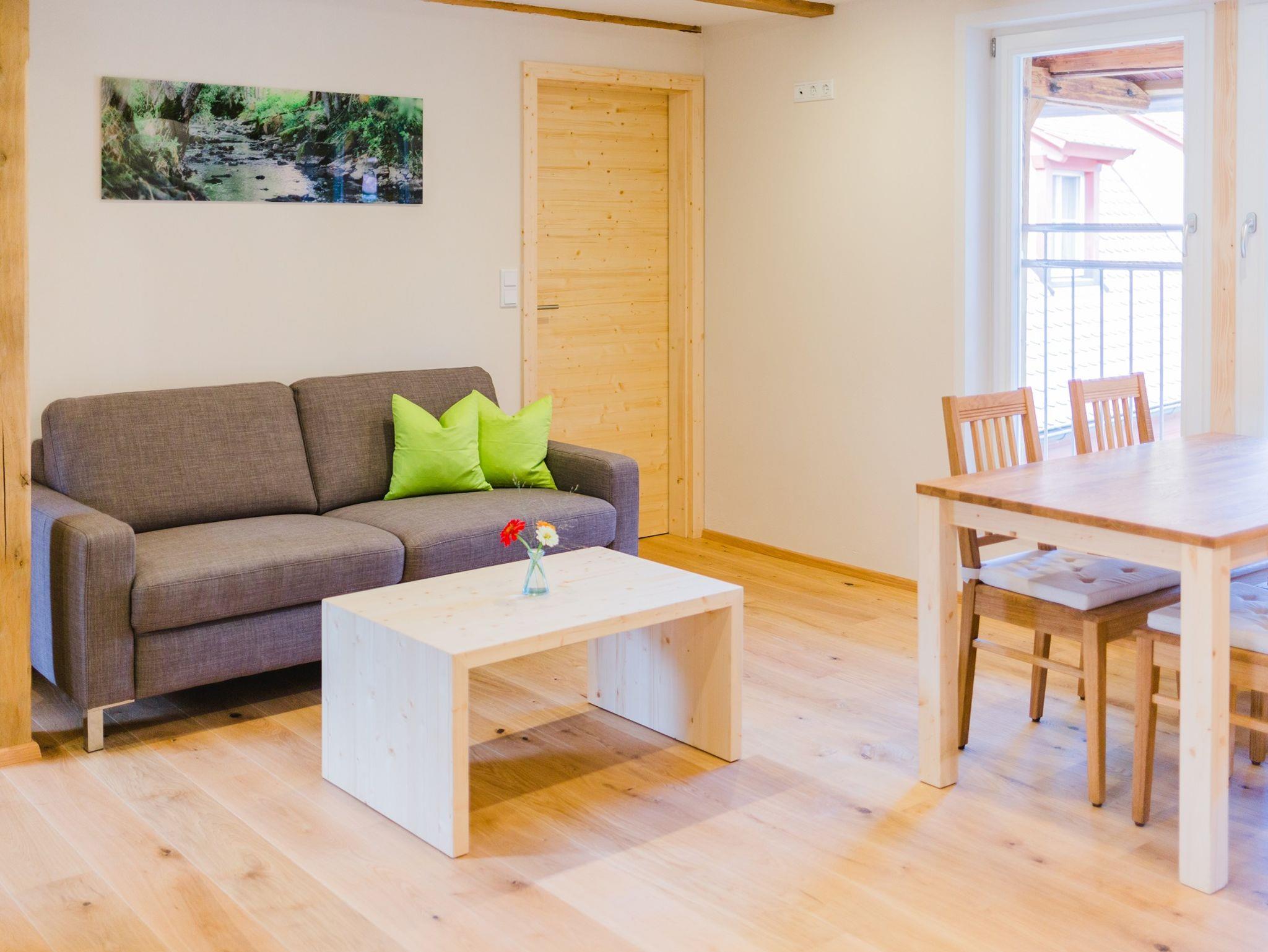 Unsere größte Wohnung befindet sich im 1. Stock des ehemaligen Speichers und besteht aus einem kombinierten Wohn-Ess-Kochbereich sowie 2 Schlafzimmern. Die natürlichen und naturbelassenen Materialien schaffen ein hervorragendes Raumklima. Der Küchenbereich ist mit allem, was das Herz begehrt, ausgestattet. Aus dem großen, gemütlichen, offenen Wohnbereich gelangen Sie in zwei separate Schlafzimmer. Auf dem innenliegenden Balkon oberhalb des Hellbaches können Sie bei einem Schoppen Frankenwein die Abendstimmung genießen und dann im Doppelbett des Schlafzimmers träumen. Im Schlafzimmer in Richtung Hof finden unsere Gäste in zwei Einzelbetten die nötige Ruhe. Das Tageslichtbad mit einer begehbaren Dusche, Waschtisch und WC ausgestattet, lässt viel Platz für Privates.