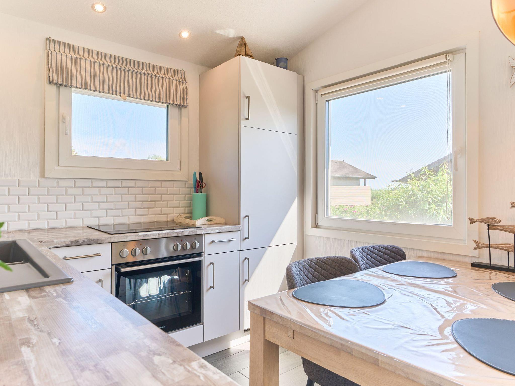 Das Ferienhaus bietet Platz für bis zu 4 Personen und überzeugt durch eine komfortable und hochwertige Ausstattung. Der helle Wohnbereich lädt zum Entspannen ein, während die voll ausgestattete Küche ideale Voraussetzungen für gemeinsame Mahlzeiten bietet. Ihnen stehen zwei Schlafzimmer zur Verfügung ? eines mit Doppelbett (160 cm) und eines mit zwei Einzelbetten (je 80 cm). Das moderne Duschbad mit bodengleicher Dusche sorgt für zusätzlichen Komfort.