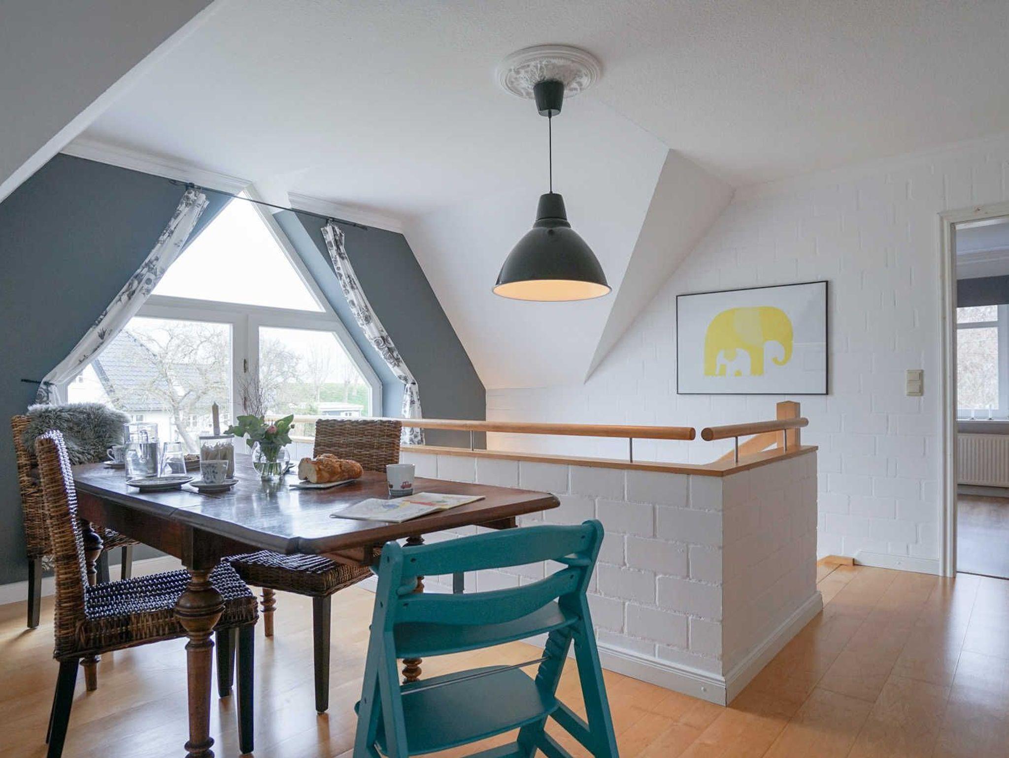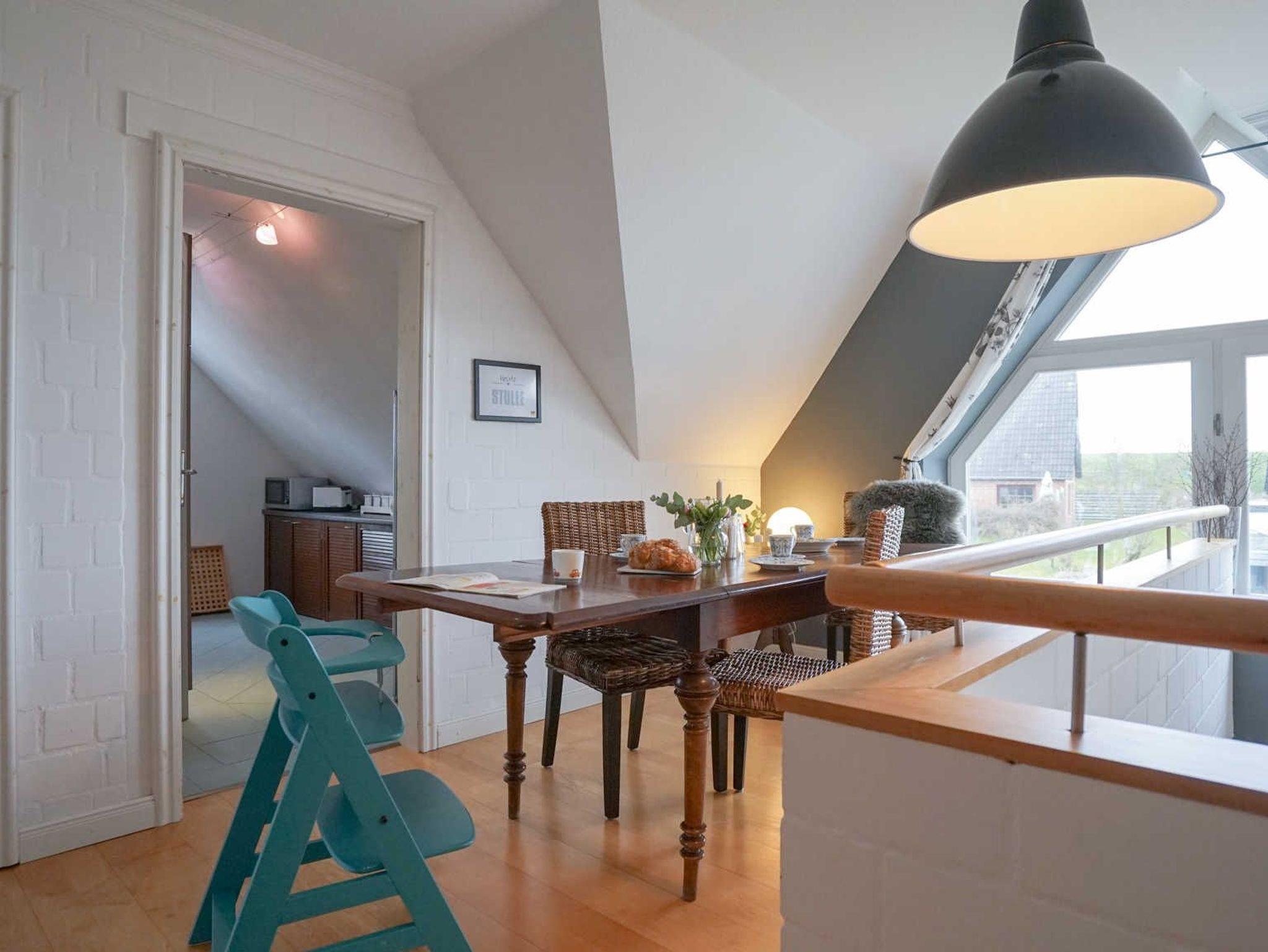 Unsere im Obergeschoss liegende 92 qm Ferienwohnung für bis zu 6 Personen liegt keine 5 Minuten Spaziergang vom Nordseedeich entfernt.
