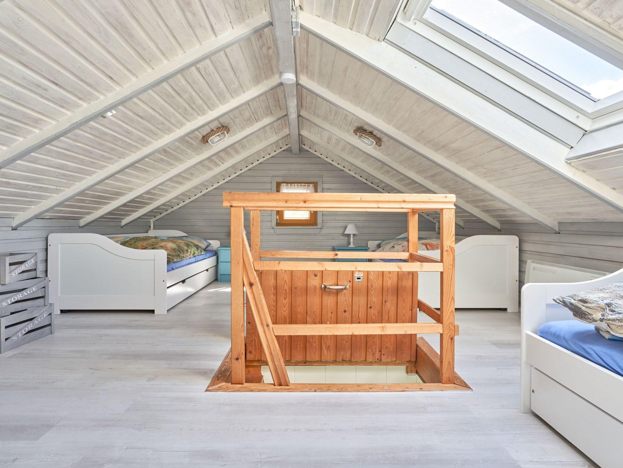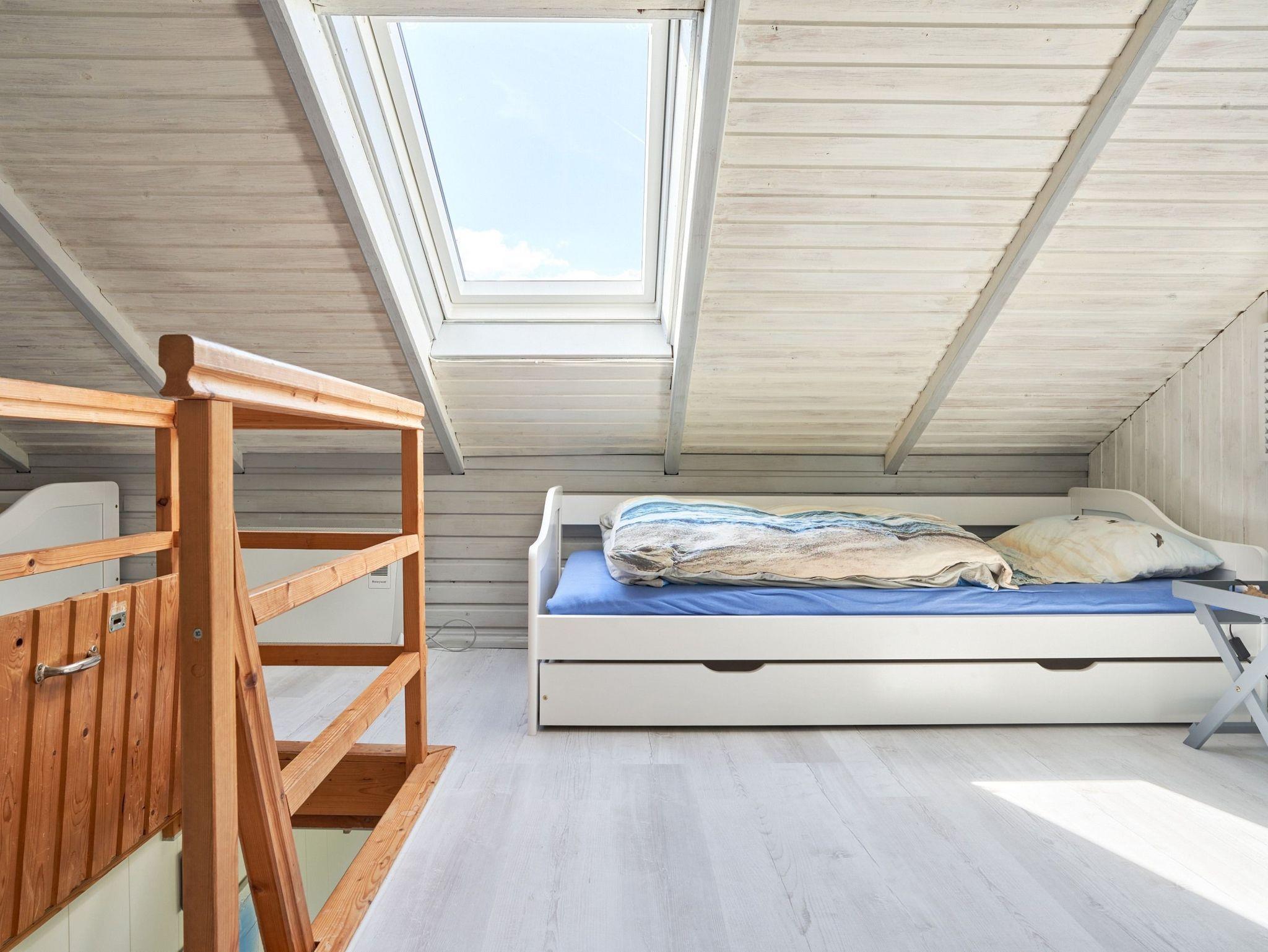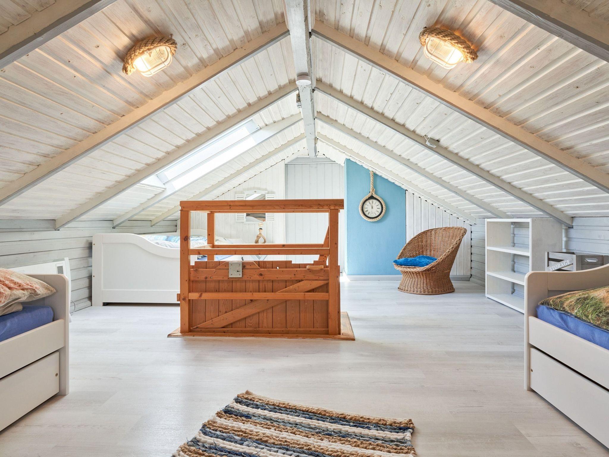 Im Dachgeschoss befindet sich das zweite Schlafzimmer mit drei Einzelbetten (3x 90x200) in einem hyggeligen Zimmer; Zugang durch steile Treppe. Ein wahres Paradies für Kinder.