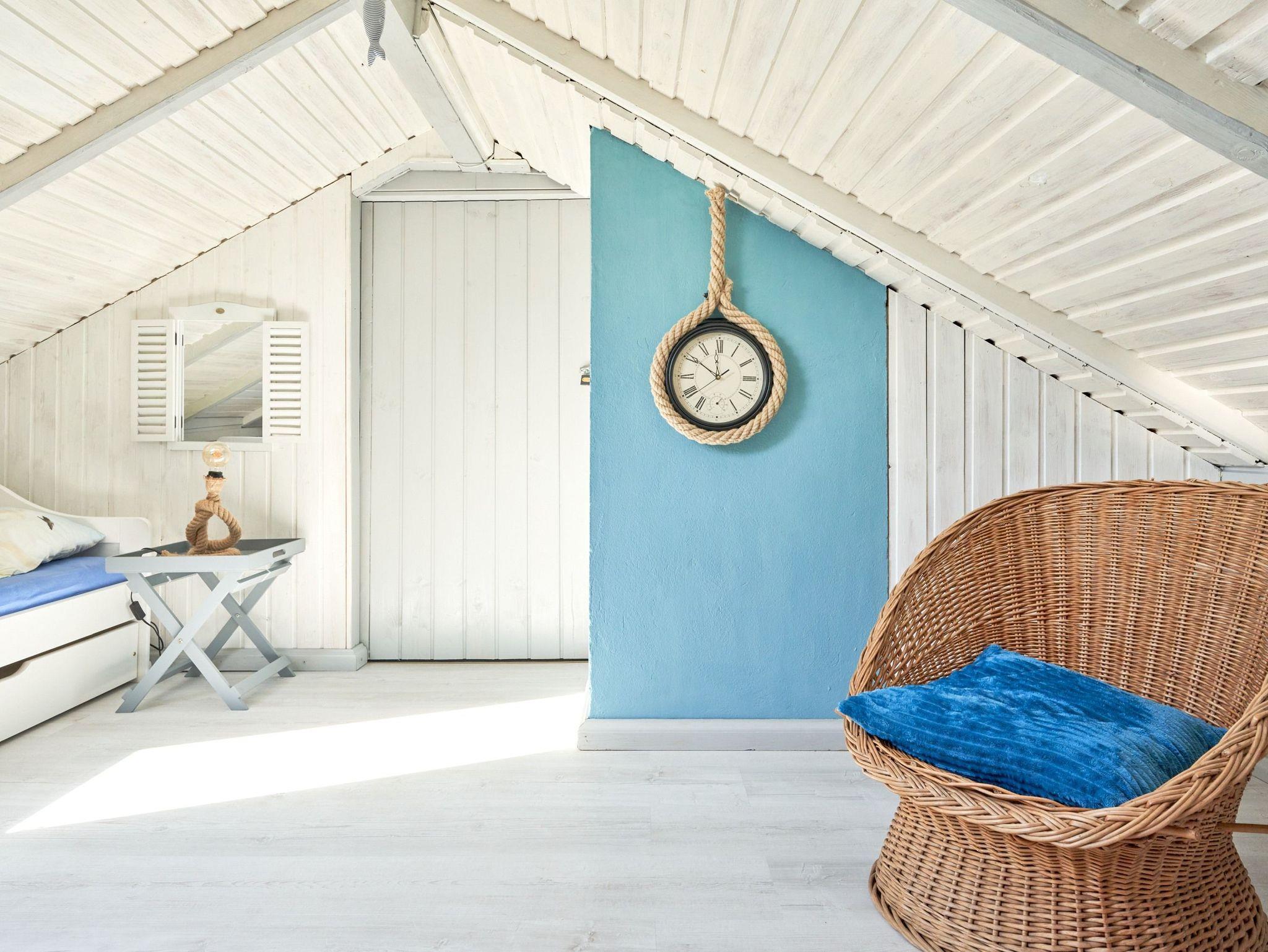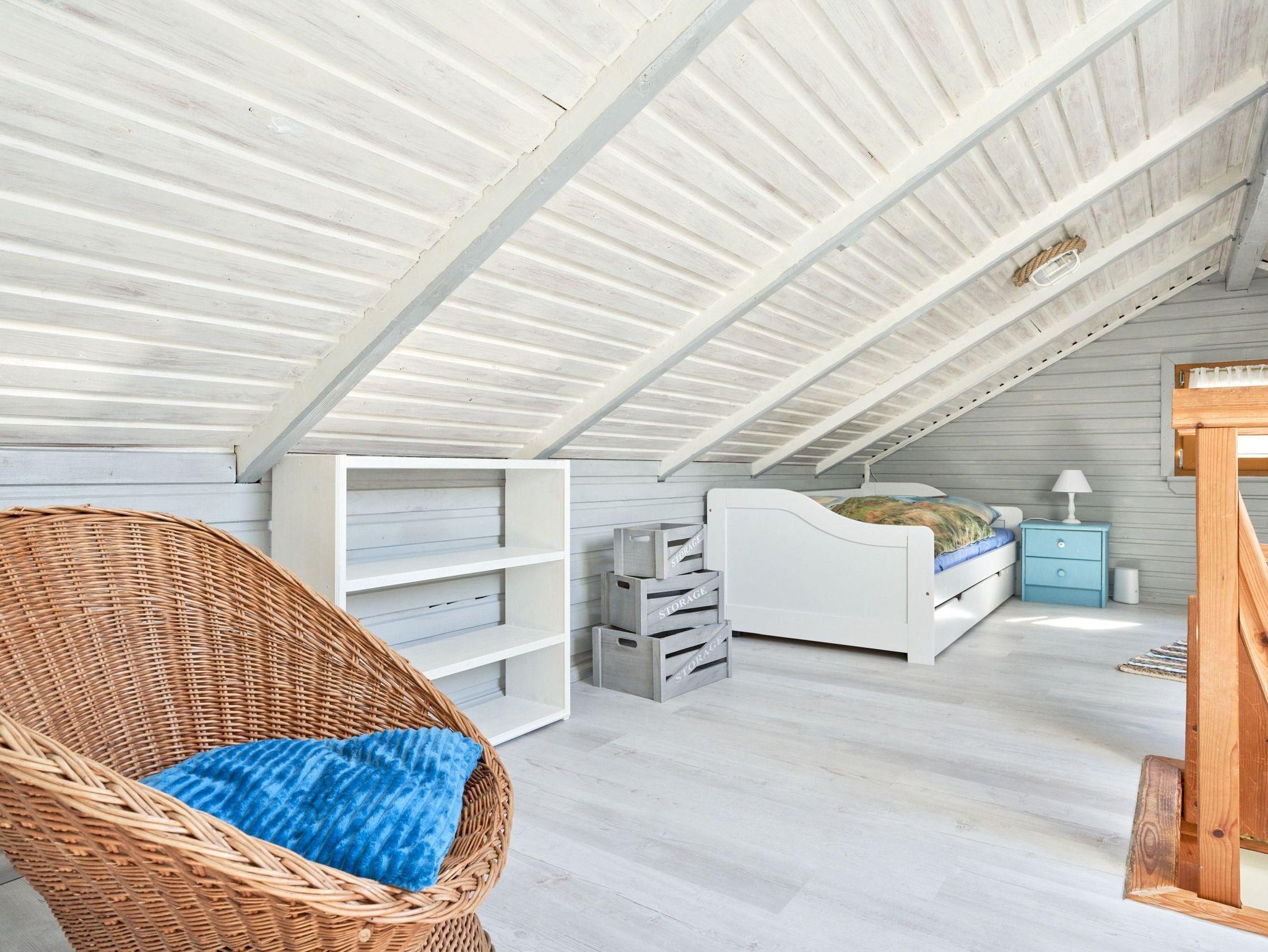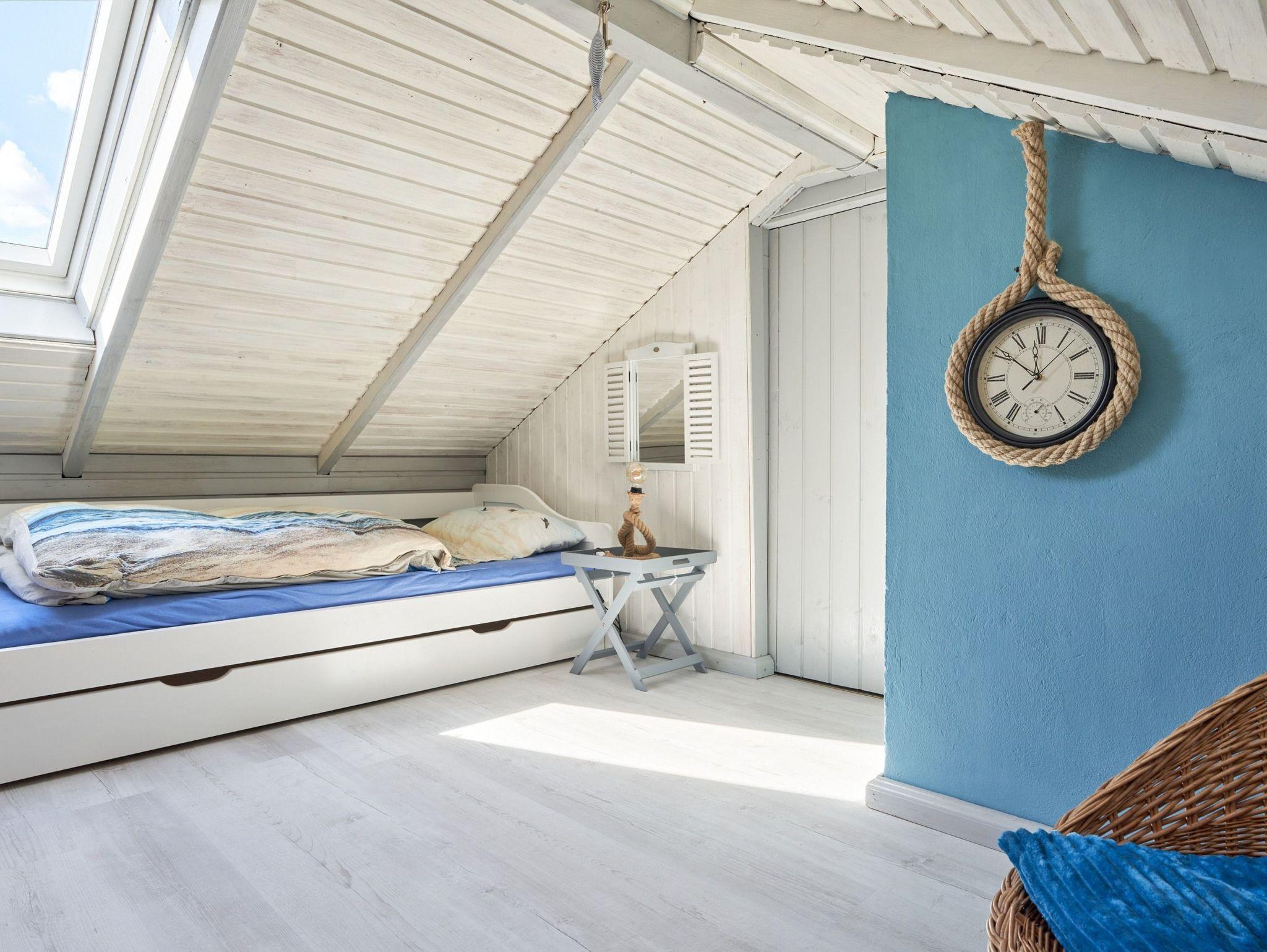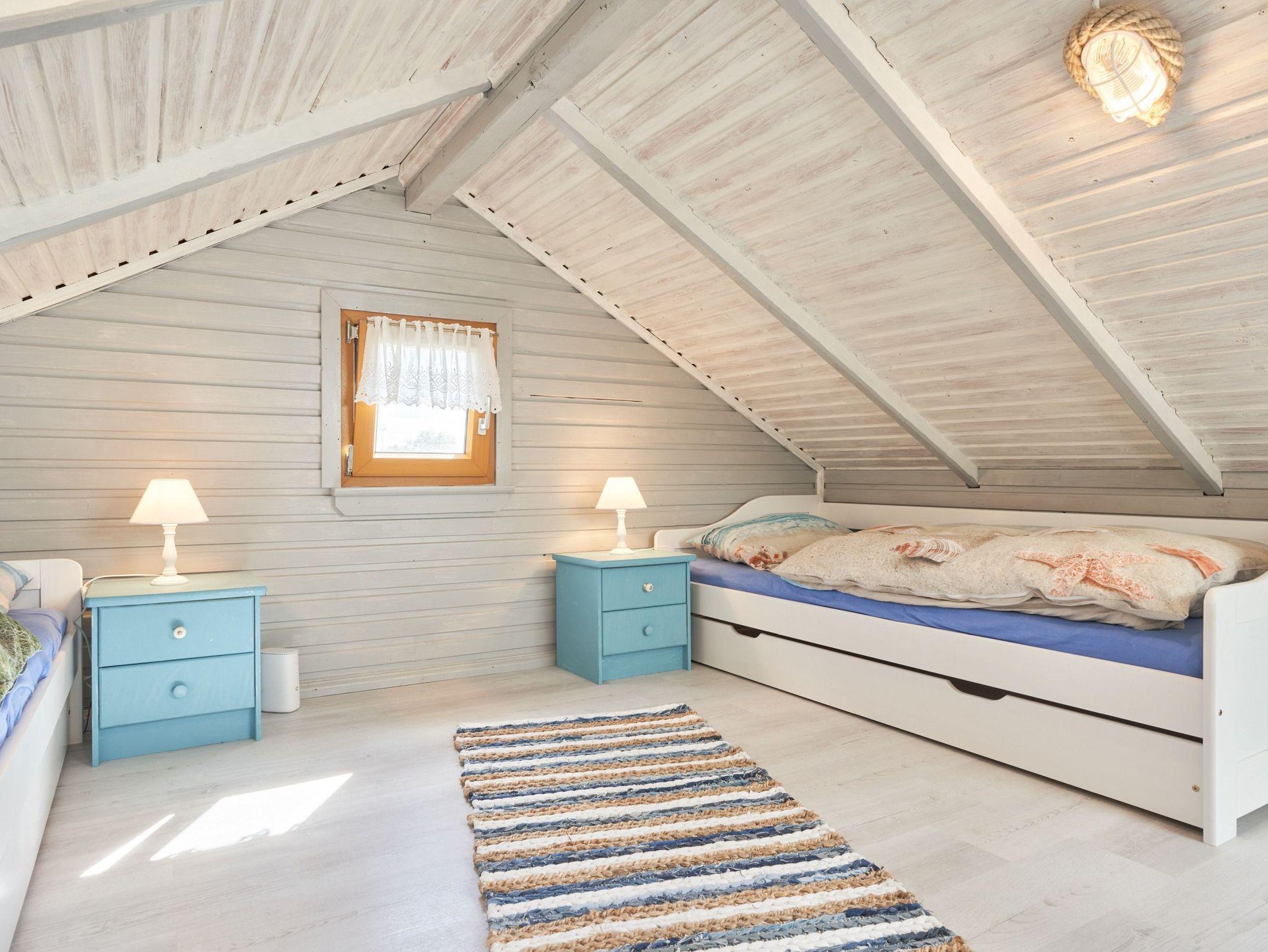 Im Dachgeschoss befindet sich das zweite Schlafzimmer mit drei Einzelbetten (3x 90x200) in einem hyggeligen Zimmer; Zugang durch steile Treppe. Ein wahres Paradies für Kinder.