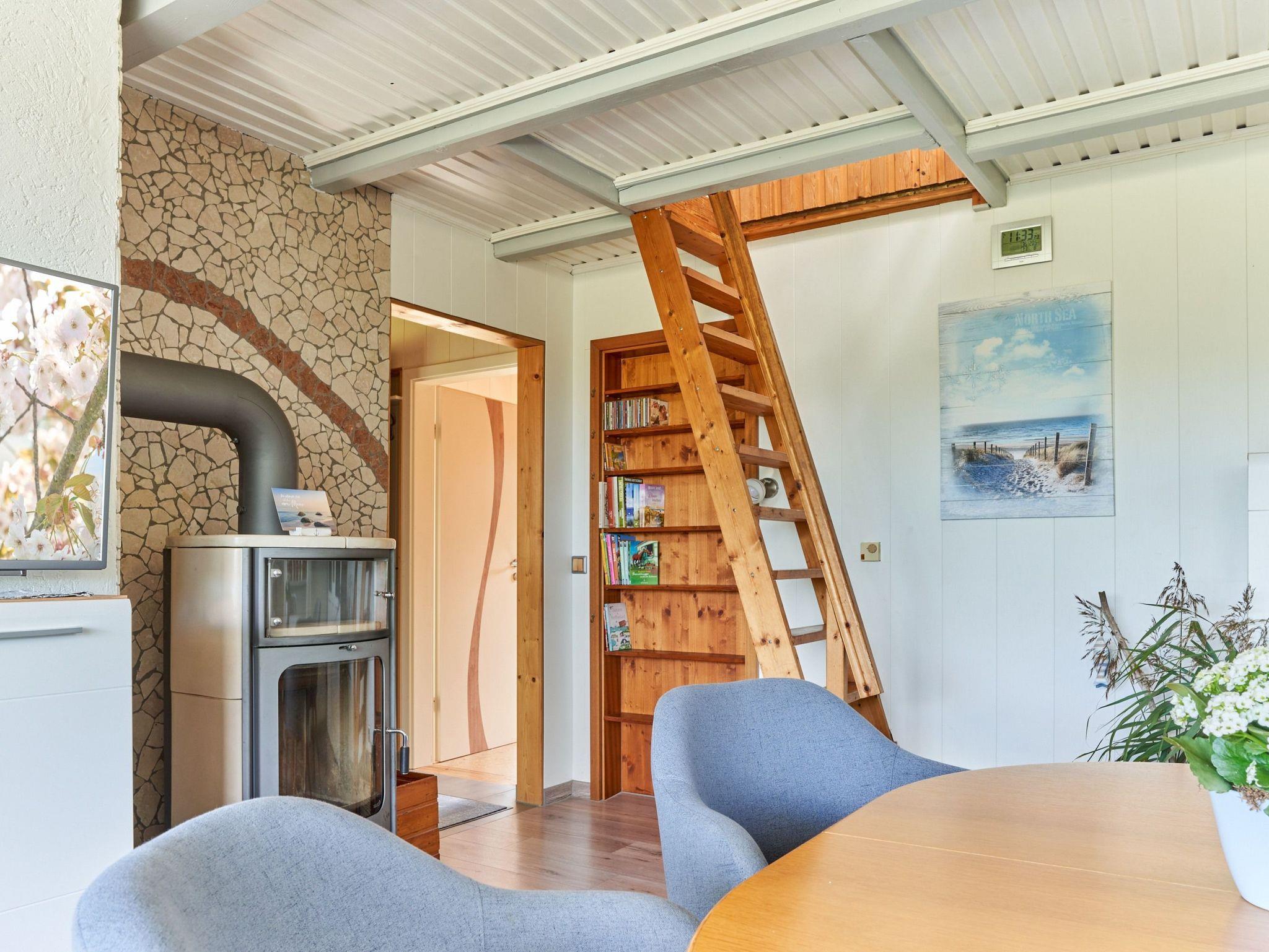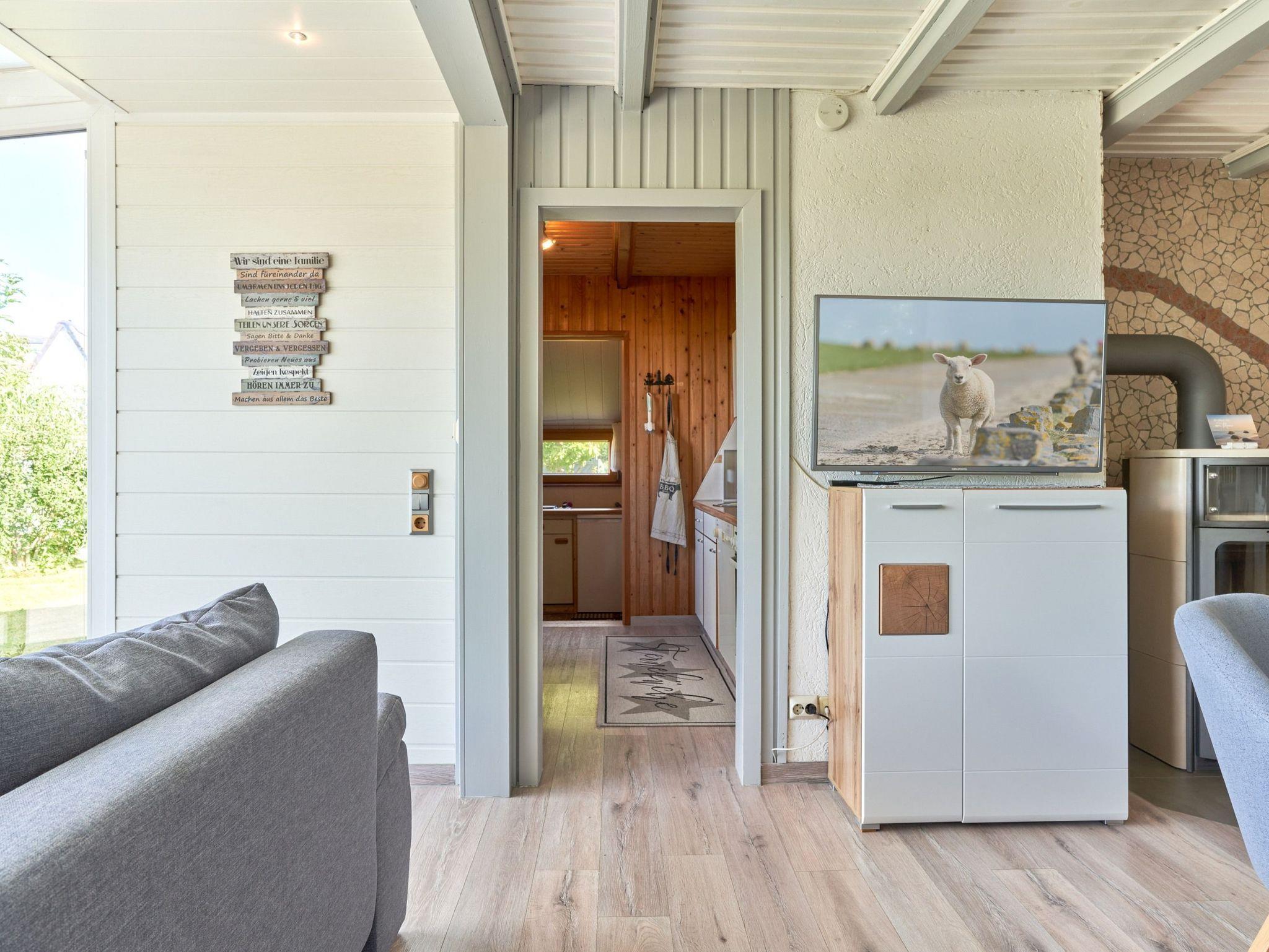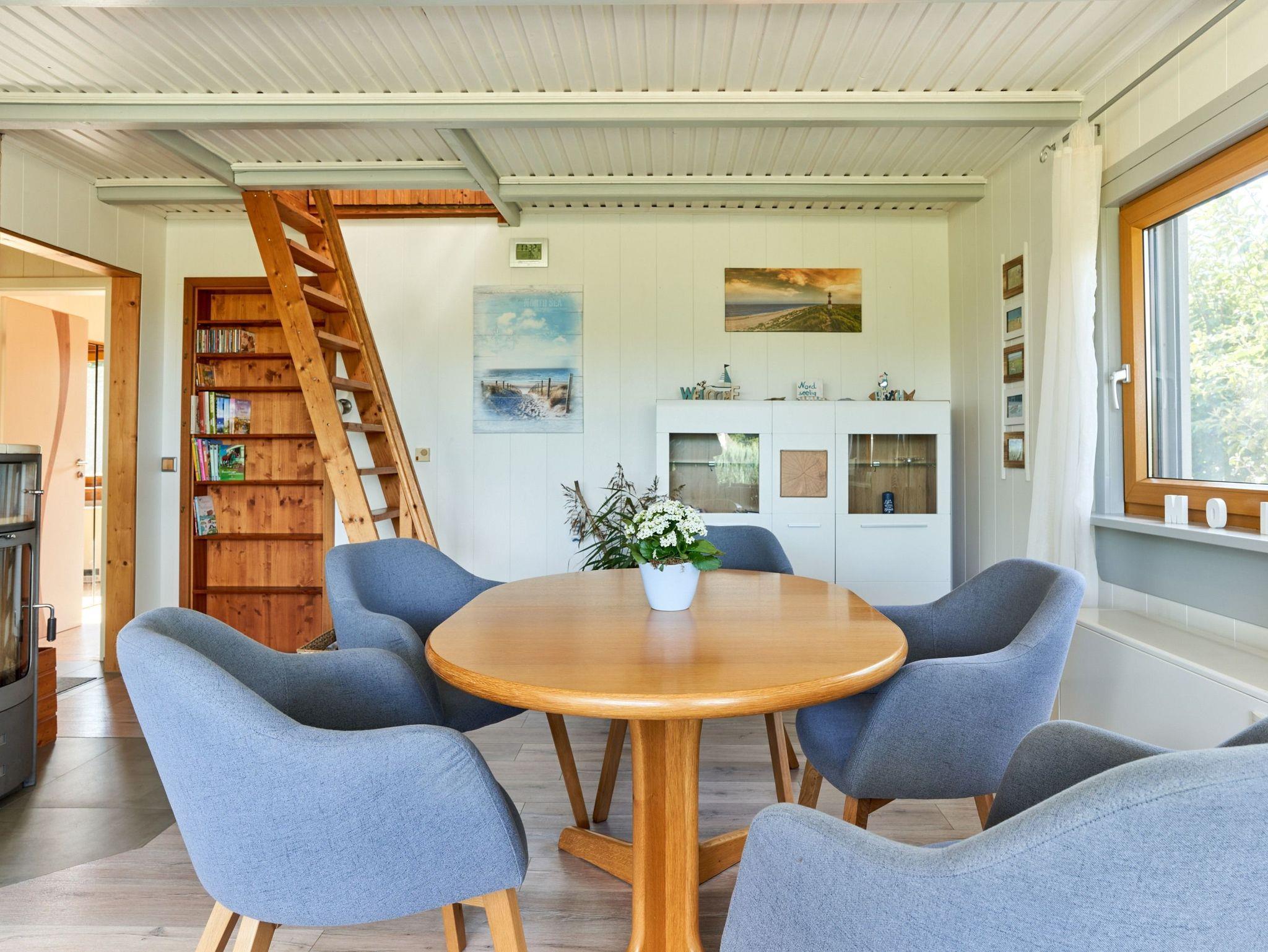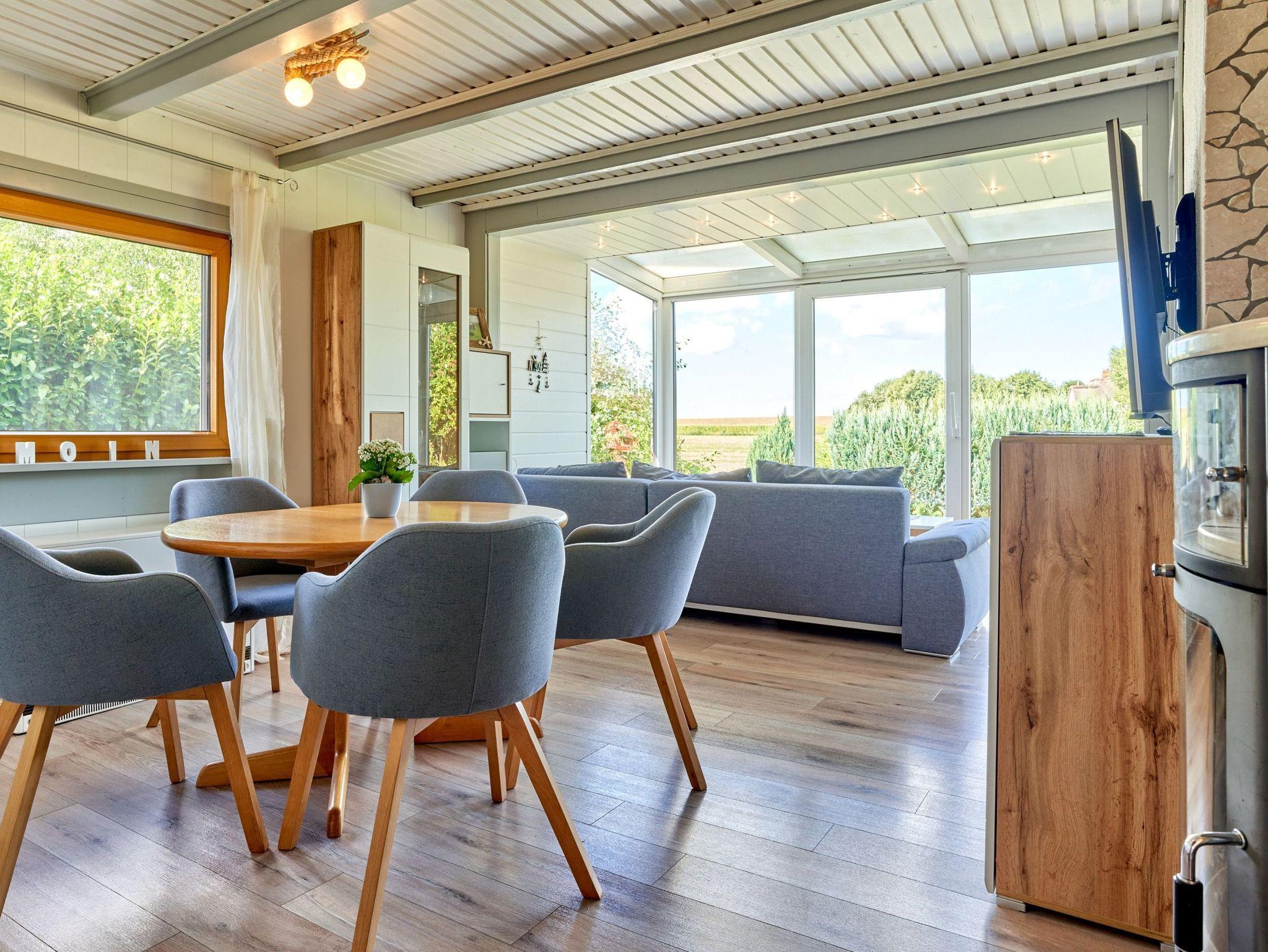 das Ferienhaus mit gemütlichem Wohn- /Esszimmer bietet einen herrlichen Deichblick direkt vom großzügigen Sofa und einen Kaminofen für kuschelige Stunden.