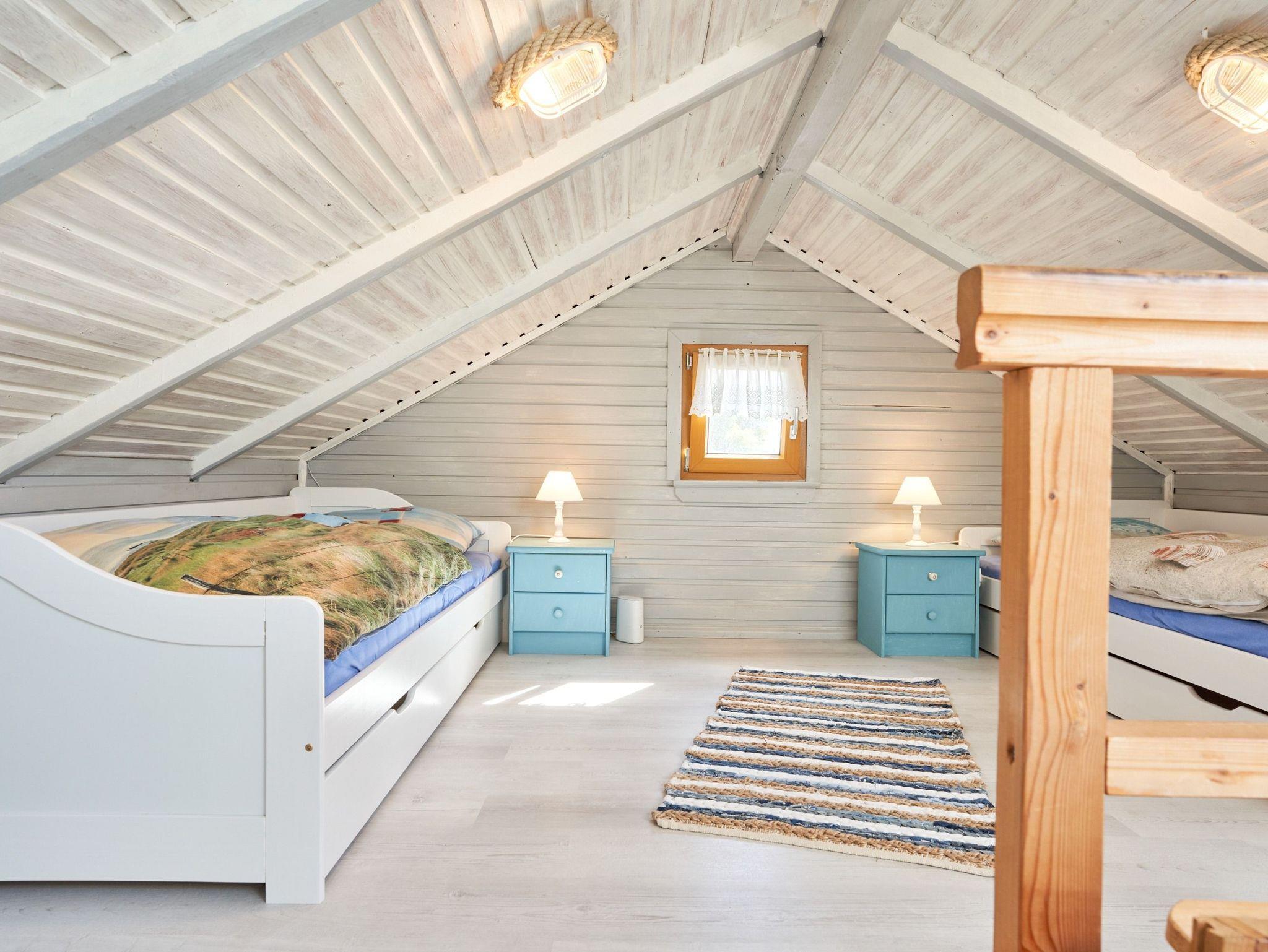 Im Dachgeschoss befindet sich das zweite Schlafzimmer mit drei Einzelbetten (3x 90x200) in einem „hyggeligen“ Zimmer; Zugang durch steile Treppe. Ein wahres Paradies für Kinder.